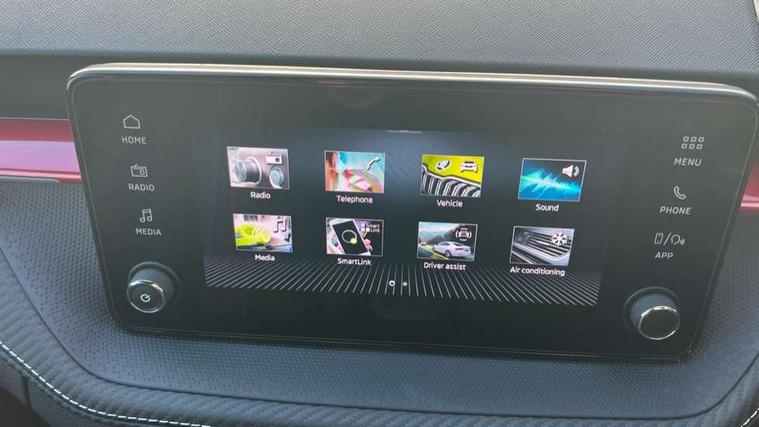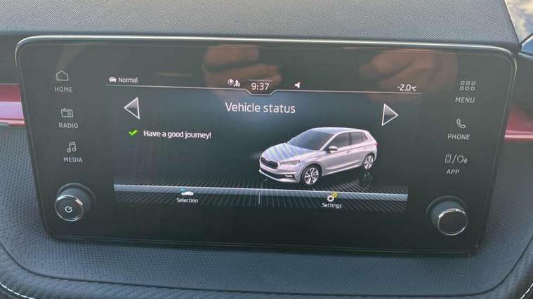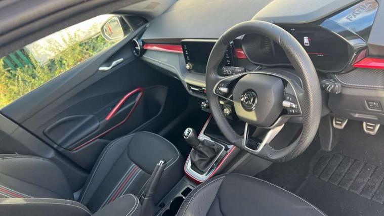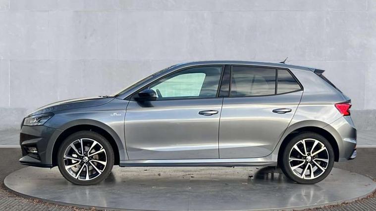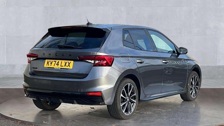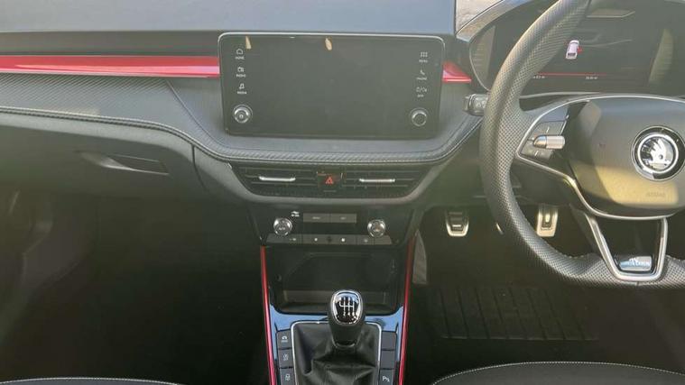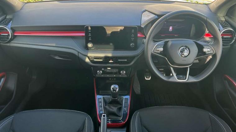 Advanced driver attention and drowsiness monitor, Bluetooth connection, Electromechanical power steering, Exterior temperature gauge, Service interval indicator, Traffic sign recognition, Virtual cockpit with 10.25" colour display, Wireless SmartLink for Apple CarPlay and Android Auto, 6 Speakers (4 in front and 2 in rear), Auxiliary socket for external MP3 player, DAB digital radio reception, Auto dimming rear view mirror, Black radiator grille, Body coloured bumpers, Door mirror integrated indicators, Front and rear electric windows, Front window wiper intermittent control, Headlight range control - Automatic, Ice scraper in fuel cap, LED daytime running lights with coming and leaving home feature, LED rear lights, Monte Carlo badging, Privacy glass, Rear LED fog light, Rear side wing doors, Rear window wiper with washing nozzles, Roof mounted spoiler, SKODA tailgate lettering in black, Sports bumpers, Third brake light, 2 reading lights in front and 2 reading lights in rear, 3 rear headrests, Aluminium pedals, Backrest split and folding, Black headlining, Central console with removable cup holder and storage box, Chrome handbrake release button, Door sills with fabia badging, Dual zone air conditioning with climatronic electronic control, Fabric/artificial leather upholstery, Front centre armrest, Front sports seats, Gearshift knob/handle in leather, Hand brake lever handle in leather, Height adjustable front headrests, Height adjustable front seats, Height adjustable steering wheel, ISOFIX and TopTether anchorage points to the outer rear seats, ISOFIX and TopTether on the front passenger seat, Luggage compartment lighting, Manually adjustable lumbar support in front seats, Metallic painted red central console cover, Metallic red interior door handles, Pollen filter, Rear seat bench unsplit, Single front passenger seat, Sun visors with mirror and airbag label on passenger side, Textile floor mats, Ticket holder, Umbrella in drivers door, 3-point height adjustable front seats belts with pretensioner and force limiter, Automatic warning lights in case of crash, Driver and passengers airbag with switch off function, e-Call+, ESC including ABS, MSR, ASR, EDS, HBA and XDS, Front and rear seat belt warning, FRONT ASSIST (AEB City and AEB Inter Urban), Front side airbags, Head airbags, One tone horn, Pedestrian protection, Three rear 3-points safety seat belts with pretensioner and force limiter including stop function for outer rear seat belts, Tyre pressure monitoring system, Anti-theft alarm system including immobiliser, interior monitoring, backup horn, and towing protection, Central locking with radio remote control, interior controls, SAFE function and 2 foldable keys, Carbon effect door and side trim panels, Carbon effect lower decorative trim with white stitching, Monte carlo air vents, Red metallic upper decorative trim, Anti-theft wheel bolts protection, Super-low rolling resistance tyres,