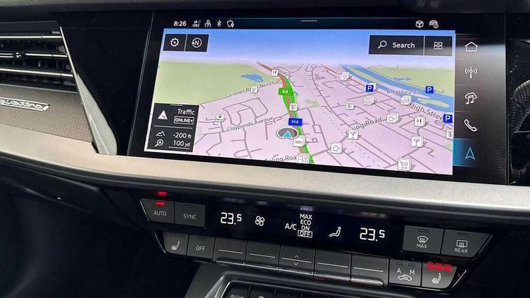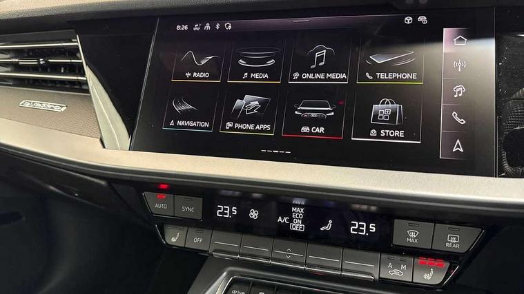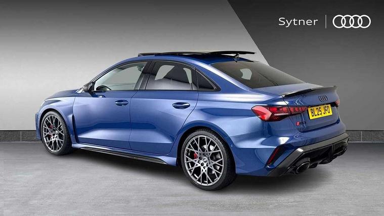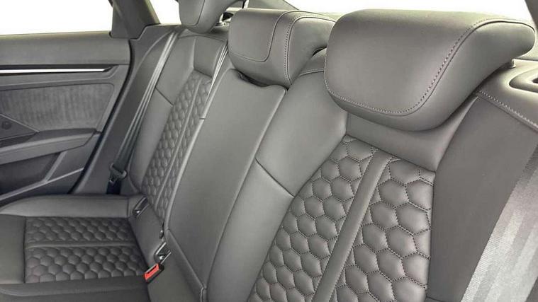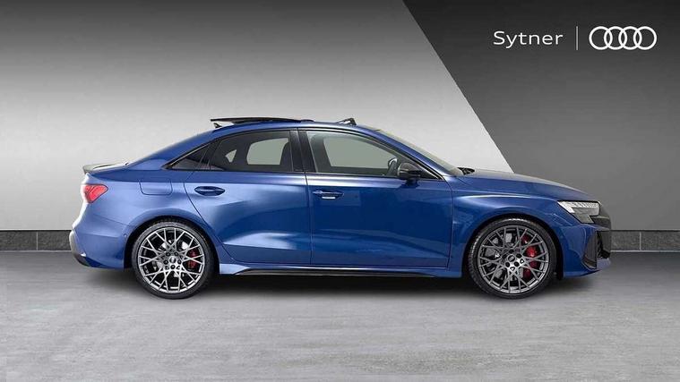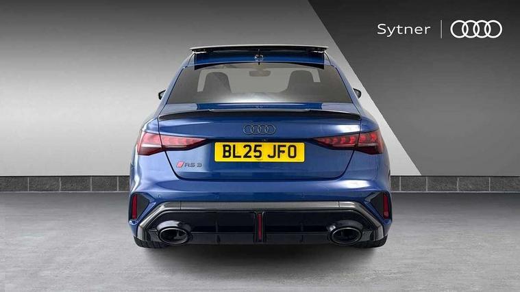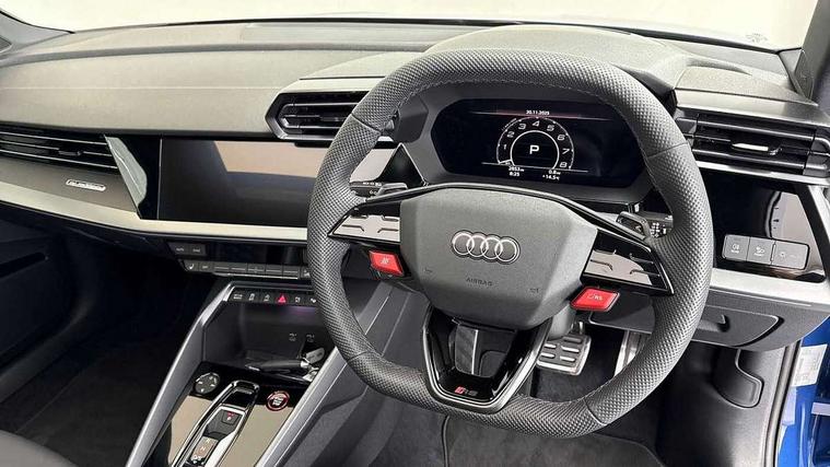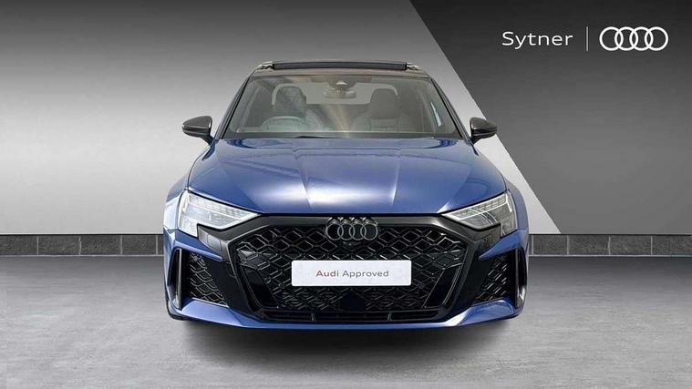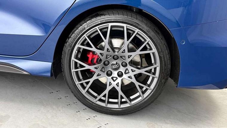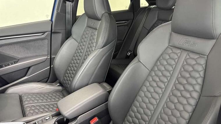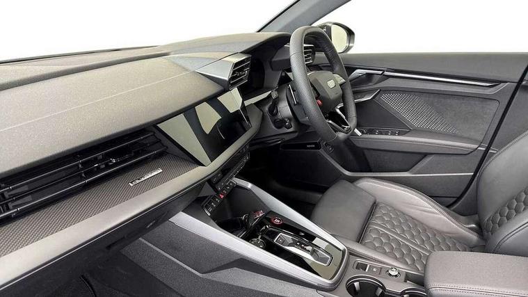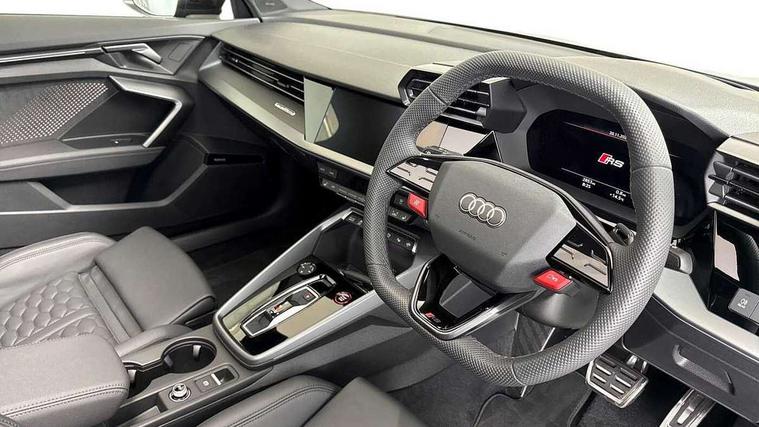 Adjustable speed limiter, Audi drive select comfort, auto, dynamic and efficiency, Audi smartphone interface with app store includes wireless Apple carplay, Android auto and Amazon alexa integration, Audi virtual cockpit plus with RS specific design and 12.3" display with additional graphic display options, Automatic start/stop system with recuperation, Bluetooth interface, Camera based traffic sign recognition, Collision avoidance assistant, Distraction and Fatigue warning, e-Call (emergency call), Lane departure warning system, MMI Navigation Plus with high resolution 10.1" colour touch screen display, Park Assist with parking system Plus, Progressive steering, RS specific driving modes - RS Individual, RS Performance and RS Torque rear, Voice control system with natural language interaction, Quattro permanent four wheel drive, Audi Phonebox light with wireless charging, DAB Digital radio, USB ports with charging function in the rear, All weather light, Audi beam LED projection of RS logo on ground as you exit, Audi darkened matrix LED headlights with dynamic light sequencing and dynamic indicator, Auto dimming frameless rear view mirror, Automatic dynamic range control, Carbon door mirror housings, Carbon fibre engine cover, Dipped beam, main beam, position light and turning light, Dynamic RS specific light sequencing of the coming home and leaving home function, Electrically adjustable/heated/folding/auto dimming door mirrors with integrated LED indications + kerb view function for passenger side, Exterior model badging, Front electric windows, Headlight cleaning system, Heat insulating glass windscreen, Intersection light, LED 3rd brake light, LED brake lights, LED rear lights with dynamic light sequencing and dynamic indicator, LED rear number plate lights, LED reverse light, LED tail lights, Light and rain sensors, Manoeuvring light, Motorway light, Privacy glass - dark tinted rear window, rear door and side windows, Rear boot, Rear electric windows, Rear side wing doors, RS dual branch exhaust system with two chrome plated oval tailpipe trims, Static Cornering lights, Tailgate spoiler in carbon, Visually upgraded RS specific daytime running light choice of 4 digital signature in chequered flag design within the headlight, 12V socket and storage compartment in front centre console, 3 seat bench in 2nd row, 3 Spoke flat top and bottomed black leather multi function steering and gear shift paddles, 3-zone deluxe automatic air conditioning, 40/20/40 split folding rear seat bench, Black cloth headlining, Black front and rear floor mats, Front and rear headrests, Front centre armrest, Front door sill trims with RS 3 logo, Front sports seats RS embossed logo, Heated front seats, Height and reach adjustable steering wheel, Manual boot compartment lid, Manually adjustable front seats, Rear centre armrest with cupholder, Seat side bolsters, Single front passenger seat, Stainless steel pedals and front footrest in black, Vanadium look - Interior door handles, Door trim, power latching, Air vents, window controls, mirror adjust, rear door lock, Selector lever in centre console, Black Styling plus package - RS3, Extended ambient lighting package Pro with Multi-coloured contour lighting of instrument panel - RS3, RS exterior features pack in carbon and gloss black - RS3, RS sport suspension pack - RS3, Storage package - RS3 Saloon, Technology package without speed limiter - RS3, 3x3 point rear seat belts, Driver and front passenger airbag with passenger airbag deactivation, Electronic Stabilisation Control (ESC) including ABS, ASR and EDL, First aid kit with warning triangle and 2 safety vests, Hill hold assist, Pre-sense front with pedestrian and cyclist detection, RS steel brakes, Seatbelt monitoring, Tyre pressure loss indicator, Anti theft alarm, Anti-theft wheel bolts, Electronically operated child locks, Immobiliser, Remote central locking with safelock, Black dashboard, Inlays in carbon atlas structure, 19" 10 cross spoke silk matt grey alloy wheels, Tyre repair kit,