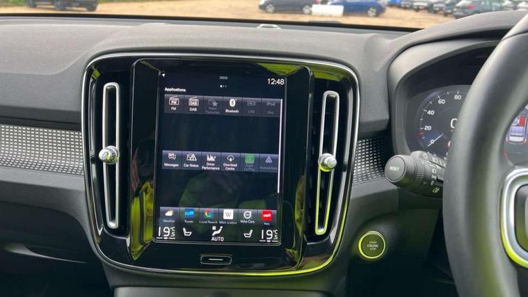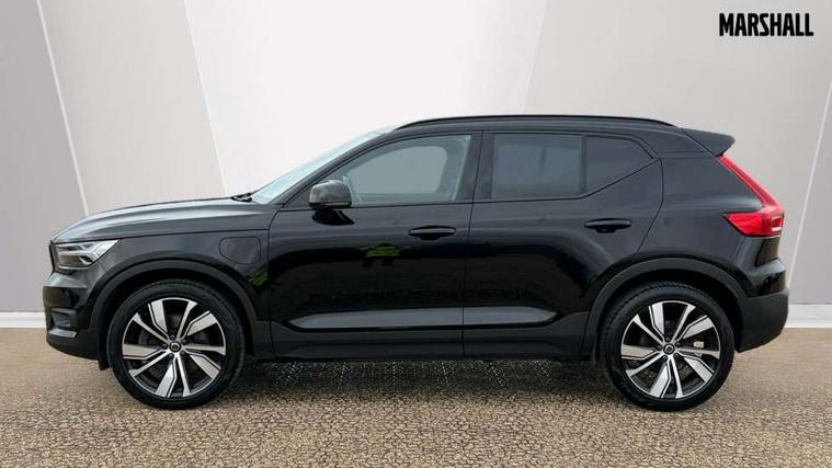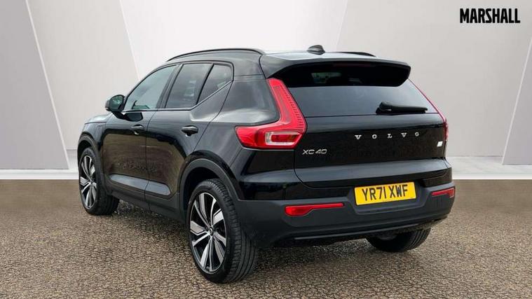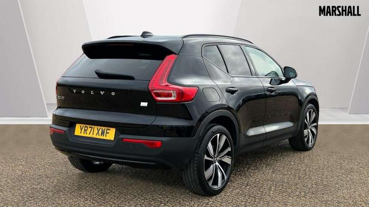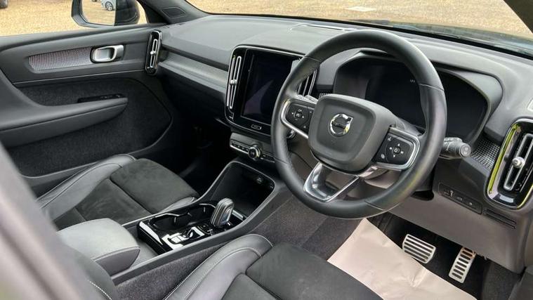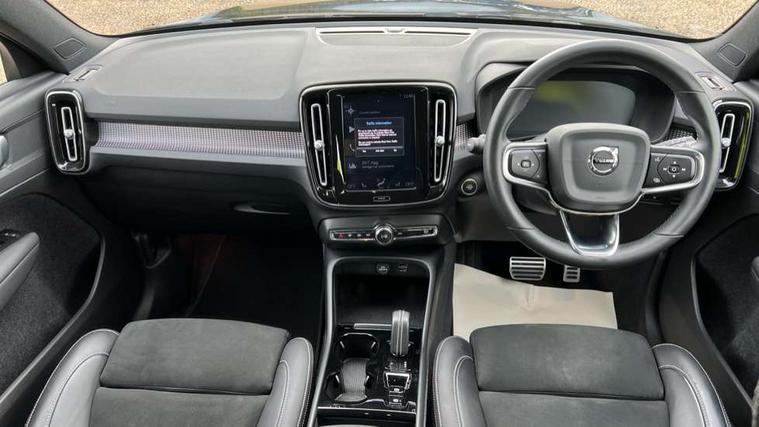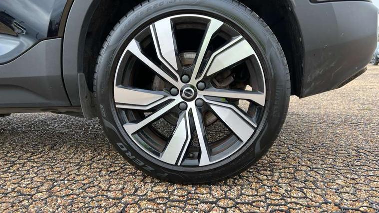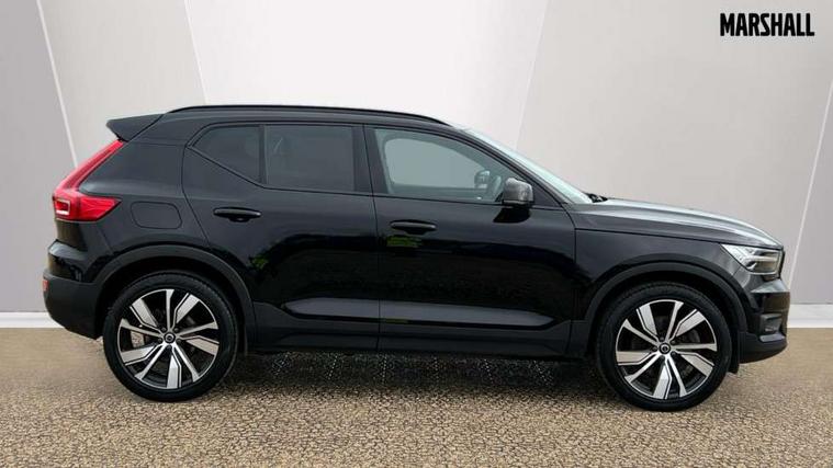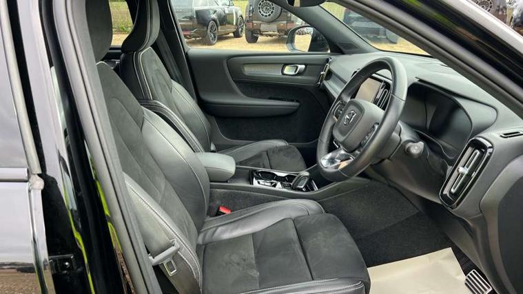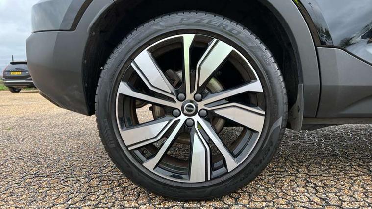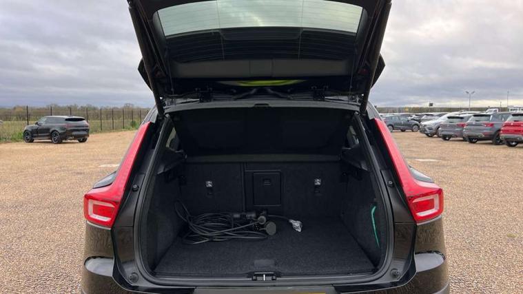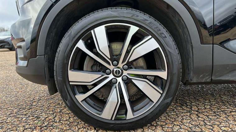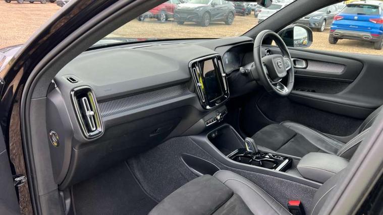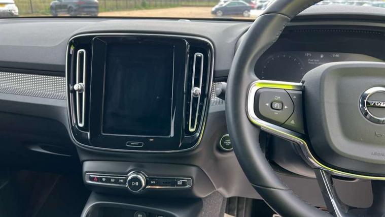 12.3" Active TFT crystal driver's instrument display, 9" centre console portrait touch screen, Adjustable steering wheel force, Bluetooth hands free telephone kit, Drive mode selector, Lane keep assist with driver alert control, Oncoming Lane Mitigation, Power operated tailgate, Sensus navigation with European mapping and traffic information, Speed limiter, Speed sensitive steering, Voice activated control for key functions, Volvo on call, 7m 10amp charge cable with 3 pin plug and 7m 1 phase 16amp type 2/mode 3 charge cable, Electric front axle drive, Recharging port located in nearside front wing, Sports chassis, DAB Digital radio, Low speed exterior sound speaker, Steering wheel mounted remote controls, Adaptive brake lights with high level LED brake lights, Auto dimming interior mirror, Automatic headlamp levelling, Dark tinted windows for rear door side windows and cargo compartment, Electric adjustable/heated/auto folding door mirrors, Front aluminium tread plates, Front and rear electric windows, Heated front windscreen, High gloss black front and rear skid plate, High gloss black lower front bumper, High gloss black mesh front grille with high gloss black surround, High gloss black sensus surround deco, High gloss black window trim, Home safe and approach lighting, Integrated roof rails in high gloss black, LED Headlights + Active high beam incorporating daytime running lights, Rain sensor with automatic windscreen wiper activation, Rear side wing doors, Rear wiper, Roof antenna, Roof spoiler, Visible VIN plate, 12V socket in front tunnel console and luggage compartment, 2 zone electronic climate control and rear air vent, 3 seat bench in 2nd row, 60/40 versatile split folding rear seat, A-pillar parking ticket holder, Bright metal luggage threshold, Centre console cupholders and storage, Charcoal headlining, Front footwell illumination, Front headrests, Front reading light and theatre lighting, Front seat cushion extensions, Glovebox bag hook, Heated front seats, Height/reach adjustable steering column, Height/tilt adjustable driver's seat, High gloss centre tunnel deco, Illuminated glovebox, Illuminated luggage compartment, Illuminated vanity mirrors, Isofix attachments on outer rear seats, Leather gearknob, Load protection net, Multi directional lumbar support, Power driver seat with memory + exterior mirrors memory, Rear armrest / integral cup holders / storage tray, Rear coat hook, Single front passenger seat, Sports floor mats, Sports pedals, Sports tailored steering wheel, Underfloor cargo storage, Vanity mirror with ticket holder, Lighting pack - XC40, 3x3 point rear seatbelts, City safety includes pedestrian, cyclist and large animal detection and front collision warning with full auto brake, Drivers knee airbag, Dual stage driver/passenger airbags, Electronic parking brake with auto hold, First aid kit, Front and outer rear seatbelt reminder and pretensioners, Front seats SIPS airbags, Hill descent control, Hill start assist, Inflatable curtain, Passenger airbag cut-off device, Road sign information display, Run off Road Mitigation, Run off Road Protection, SIPS (Side Impact Protection System), Slippery road and hazard light alert, Stability and Traction Control with Spin control, Engine Drag Control and Corner Traction Control, Tyre pressure monitoring system, Vehicle deceleration control with Anti-lock Brake System, Electronic Brake Distribution and Emergency Brake Assist, Warning triangle, WHIPS whiplash protection system - front, Anti-theft alarm including immobiliser/volume sensor + level sensor, Care key with user defined top speed, Key integrated remote control central locking + fuel flap with deadlocking system and auto open/close power windows, Locking wheel nuts, Private locking for tailgate, Cutting edge aluminium inlay, Lower dashboard, tunnel console and door panel in charcoal,