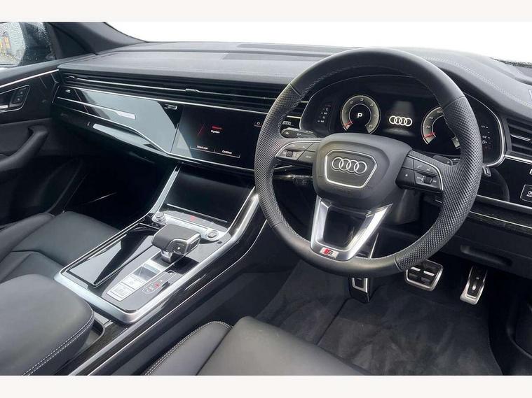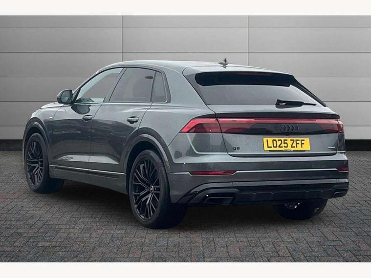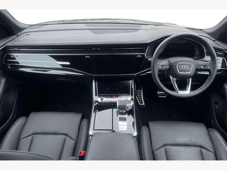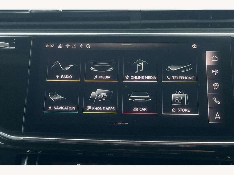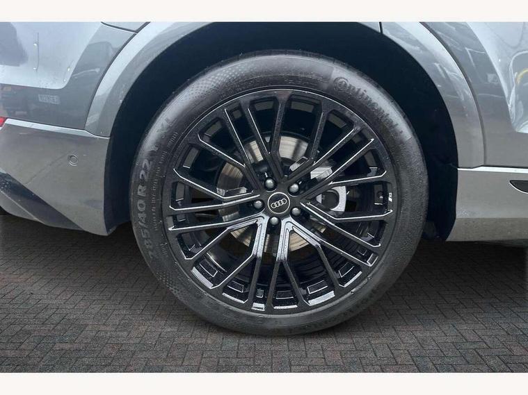 10.1" and 8.6" Dual colour touchscreens, Audi application store, Audi connect safety and service (e-call), Audi connect with Amazon Alexa Integration, Audi drive select, Audi parking system plus includes 360 degree display with front and rear sensors, Audi phone box light with wireless charging, Audi virtual cockpit - 12.3" high resolution LCD display with fully customisable instrument cluster, Automatic start/stop system, Bluetooth, Electro-mechanical PAS, Low washer fluid indicator, MMI navigation plus with MMI touch, Natural voice recognition, On board computer, Operating buttons in black, glass look with haptic feedback, Power operated tailgate, Rear view camera, Service interval indicator, Smartphone interface includes wireless Apple carplay/Android Auto, 48V Mild hybrid technology, Adaptive sport air suspension, Diesel particulate filter, Quattro all wheel drive with self locking centre differential, Audi music interface with 2 USB ports with charge and data functions, Audi sound system with 6 channel amplifier, 180 watt amplifying capacity and 10 loudspeakers including subwoofer, Aux-in socket, DAB Digital radio, 3rd brake light, Audi beam, Auto dimming frameless rear view mirror, Black exhaust tailpipes, Black single frame mask, Coming/leaving home lighting function, Electric front+rear windows, Electrically folding auto dimming/adjustable/heated door mirrors with memory function, LED side indicators and kerb view function for passenger side, Headlight washers, Heat insulating glass in windshield, LED rear light plus, LED signature daytime running lights, Loading edge protection in stainless steel, Matrix LED headlights with dynamic front and rear indicators, Platinum grey front spoiler lip and diffuser insert with honeycomb grille in black, Privacy glass - dark tinted rear and rear side windows from B-pillar backwards, Rain and light sensors, Rear side wing doors, Rear wiper, Singleframe grille surround in matte platinum grey, 2 zone automatic climate control, 3 bench rear seats in 2nd row, 4-way lumbar support for front seats, 40:20:40 split folding rear bench seat, Black cloth headlining, Comfort front centre armrest, Driver seat memory function, Electrically adjustable front seats, Front head restraints, Front/rear floor mats, Heated front seats, ISOFIX child seat mounting for front passenger seat and 2 outer rear seats with top tether child seat mounting for all 3 rear seats, LED interior ambient lighting, Luggage compartment sill protection in stainless steel, Rear centre armrest with 2 cupholders, Rear headrests, Seat cushion displaceable by 100mm in the ratio 60:40, Single front passenger seat, Stainless steel pedals, Sunvisors with illuminated vanity mirrors, Black styling pack plus - Q8, 3 point seatbelts on all seats, Audi pre sense front, Convenience key with safelock, Driver and front passenger, front side and curtain airbags, Electromechanical parking brake, Electronic Stability Control (ESC) including ABS, ASR and EDL, Front passenger airbag deactivation, Hill descent control, Hill hold assist, Predictive pedestrian protection, Seatbelt monitoring, Traction control, Tyre pressure loss indicator, Warning triangle and first aid kit, Anti theft alarm with tow away protection, Anti-theft wheel bolts and wheel loosening detection, Electronically operated child lock, Immobiliser, Keyless go with remote central locking, Polished oak trim with grey finish inlay, Tool kit, Tyre repair kit,