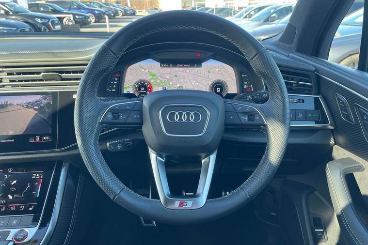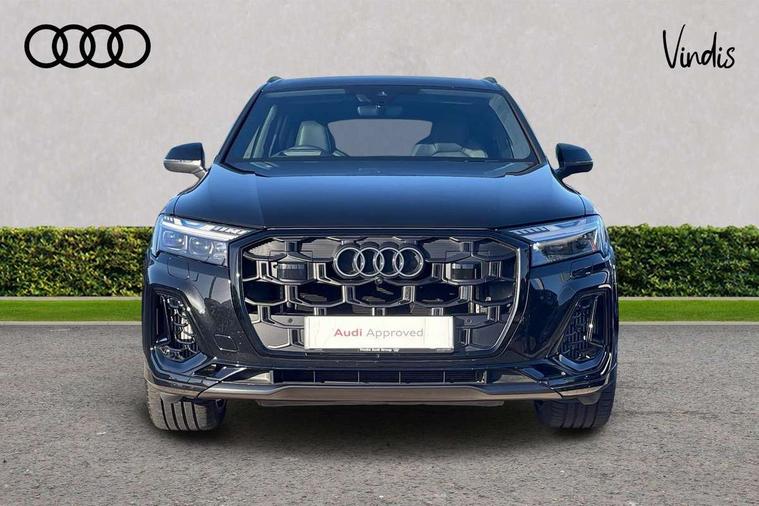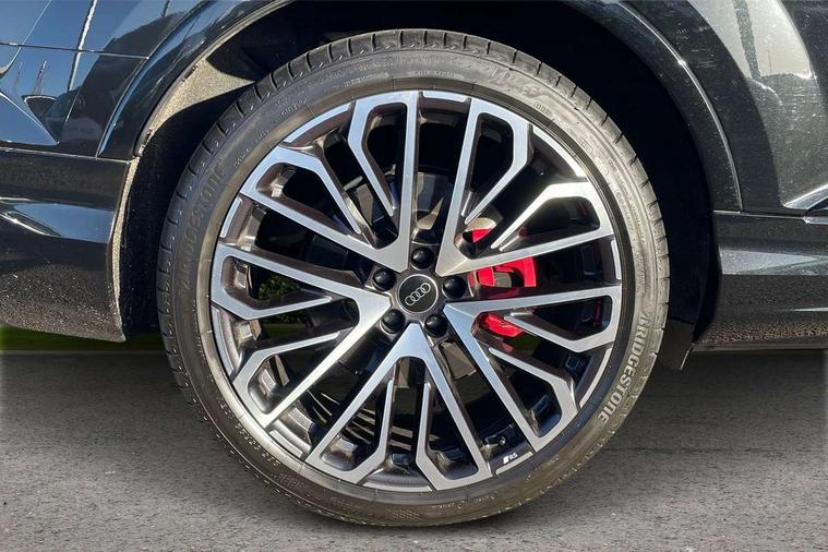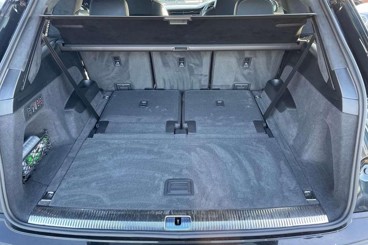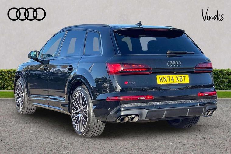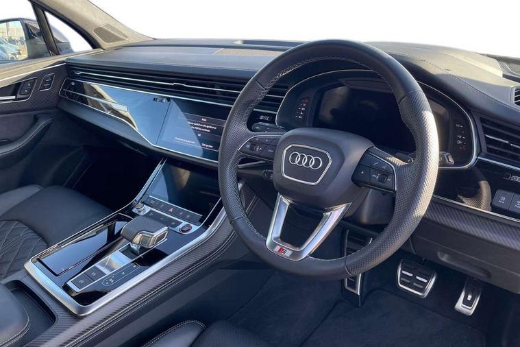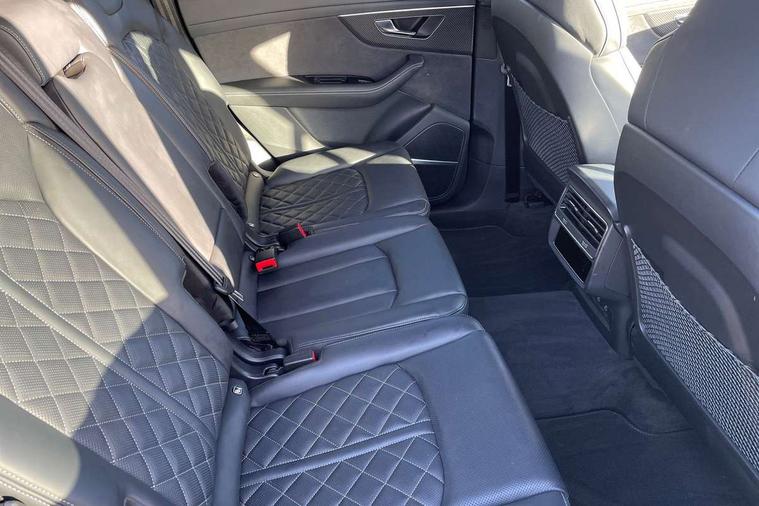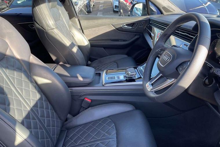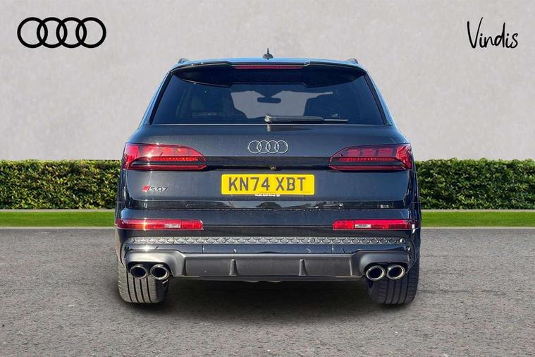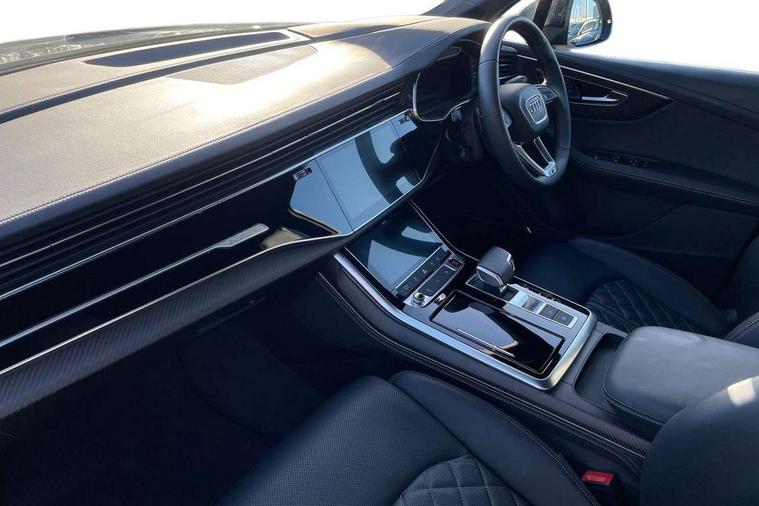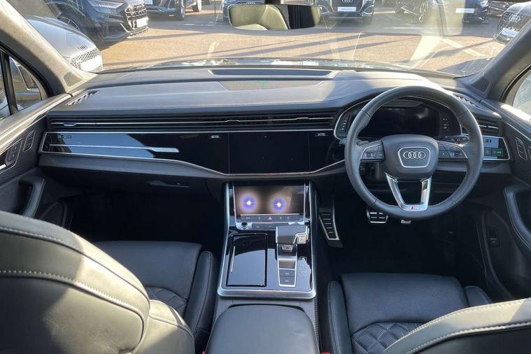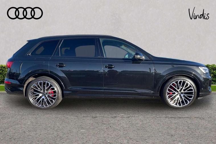 360 degree camera, Audi connect safety and service (e-call), Audi connect with Amazon Alexa Integration, Audi drive select (Auto, Comfort, Dynamic, Efficiency, Individual, Off-road and All road), Audi phone box light with wireless charging, Audi virtual cockpit plus, Bluetooth interface, Camera based traffic sign recognition, Electromechanical power steering, Head up Display, MMI navigation plus with MMI touch screens includes 10.1" and 8.6" screens with haptic feedback, Natural voice recognition, Operating buttons in Matte black, Power door closure, Power operated tailgate, Smartphone interface includes wireless Apple carplay/Android Auto, Start/stop system, 48V Mild hybrid technology, 85 litre fuel tank, Electromechanical active roll stabilisation, Quattro with sport differential, S specific adaptive air sport suspension, Audi music interface - front 2 USB-C ports with charger and data functions, Bang + Olufsen premium sound system, DAB digital radio module, Audi Beam uses LEDs to project Audi rhombus S logo onto the ground as you exit your SQ7, Auto dimming frameless rear view mirror, Black roof rails, Digital OLED rear combination lamps, Electrically adj heated/folding + automatically dimming exterior mirrors with memory + automatic kerb side function for passenger side exterior mirror, HD Matrix LED headlights with Audi laser light, Headlight washers, Heat insulating glass in windshield, Integrated LED indications in door mirrors, LED 3rd brake light, LED daytime running lights, Loading edge protection in stainless steel, Panoramic sunroof, Privacy glass - dark tinted rear and rear side windows from B-pillar backwards, Rear side wing doors, Rear wiper, 2 seat bench in 3rd row, 3 seat bench in 2nd row, 3 spoke heated leather multi-function steering wheel including paddle shift, 4 zone deluxe automatic climate control, 7 seat layout with ISOFIX points for the front passenger seat and rear passenger seat, Black dinamica headlining, Comfort front centre armrest, Double sun visors with illuminated vanity mirrors, Electric adjustable front seats/backrest bolsters, lumbar support, memory functionality, Electric steering wheel adjustment, Folding rear seats, Front head restraints, Front/rear floor mats, Heated front seats, Illuminated door sill trims with S logo, ISOFIX child seat mounting for front passenger seat and 2 outer rear seats with top tether child seat mounting for all 3 rear seats, Luggage compartment sill protection in stainless steel, Rear head restraints, Seat ventilation and massage function in the front, Single front passenger seat, Stainless steel pedals, Upper interior element with contrasting stitching, Valcona leather upholstery with front super sport seat S embossed logo, Black styling pack plus - Q7, City assist pack - Q7, Extended leather pack - SQ7, Multi-coloured extended LED Interior lighting pack - Q7, Technology Pack Pro S Without Advance Key - SQ7, Tour pack without Pre sense basic - Q7, 3 point seatbelts on all rear seats, Audi pre sense front, Child locks on rear doors, Convenience key with safelock and gesture tailgate, Driver and front passenger, front side and curtain airbags, Electromechanical parking brake, Electronic Stabilisation Control (ESC) including ABS, ASR and EDL, Extended pedestrian protection measures, Hill hold assist, Seatbelt reminder, Tyre pressure loss indicator, Warning triangle and first aid kit, Anti theft alarm with tow away protection, Anti-theft wheel bolts and wheel loosening detection, Remote central locking, Tool kit, Tyre repair kit,