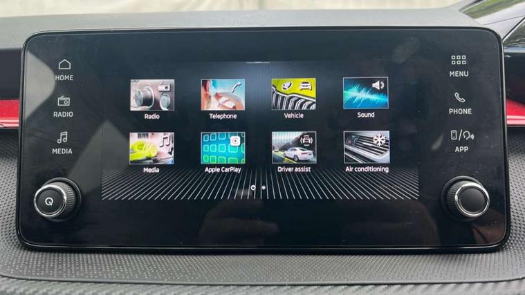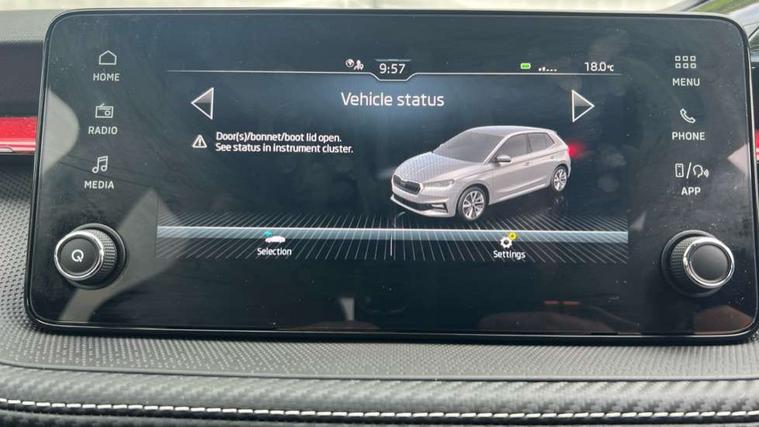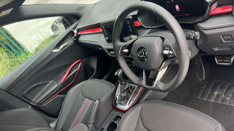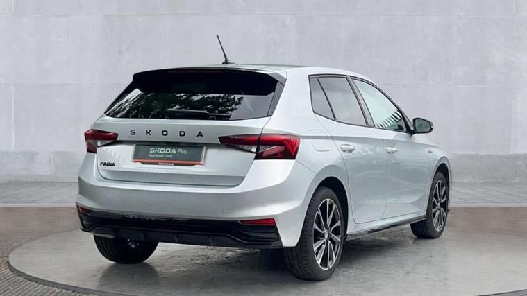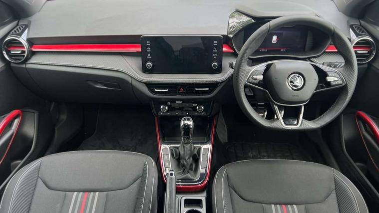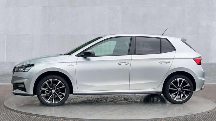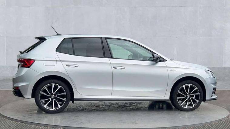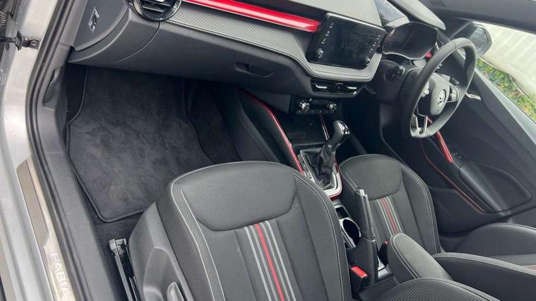 Advanced driver attention and drowsiness monitor, Bluetooth connection, Electromechanical power steering, Exterior temperature gauge, Service interval indicator, Traffic sign recognition, Virtual cockpit with 10.25" colour display, Wireless SmartLink for Apple CarPlay and Android Auto, 6 Speakers (4 in front and 2 in rear), Auxiliary socket for external MP3 player, DAB digital radio reception, Auto dimming rear view mirror, Black radiator grille, Body coloured bumpers, Door mirror integrated indicators, Front and rear electric windows, Front window wiper intermittent control, Headlight range control - Automatic, Ice scraper in fuel cap, LED daytime running lights with coming and leaving home feature, LED rear lights, Monte Carlo badging, Privacy glass, Rear LED fog light, Rear side wing doors, Rear window wiper with washing nozzles, Roof mounted spoiler, SKODA tailgate lettering in black, Sports bumpers, Third brake light, 2 reading lights in front and 2 reading lights in rear, 3 rear headrests, Aluminium pedals, Backrest split and folding, Black headlining, Central console with removable cup holder and storage box, Chrome handbrake release button, Door sills with fabia badging, Dual zone air conditioning with climatronic electronic control, Fabric/artificial leather upholstery, Front centre armrest, Front sports seats, Gearshift knob/handle in leather, Hand brake lever handle in leather, Height adjustable front headrests, Height adjustable front seats, Height adjustable steering wheel, ISOFIX and TopTether anchorage points to the outer rear seats, ISOFIX and TopTether on the front passenger seat, Luggage compartment lighting, Manually adjustable lumbar support in front seats, Metallic painted red central console cover, Metallic red interior door handles, Pollen filter, Rear seat bench unsplit, Single front passenger seat, Sun visors with mirror and airbag label on passenger side, Textile floor mats, Ticket holder, Umbrella in drivers door, 3-point height adjustable front seats belts with pretensioner and force limiter, Automatic warning lights in case of crash, Driver and passengers airbag with switch off function, e-Call+, ESC including ABS, MSR, ASR, EDS, HBA and XDS, Front and rear seat belt warning, FRONT ASSIST (AEB City and AEB Inter Urban), Front side airbags, Head airbags, Hill hold control, One tone horn, Pedestrian protection, Three rear 3-points safety seat belts with pretensioner and force limiter including stop function for outer rear seat belts, Tyre pressure monitoring system, Anti-theft alarm system including immobiliser, interior monitoring, backup horn, and towing protection, Central locking with radio remote control, interior controls, SAFE function and 2 foldable keys, Carbon effect door and side trim panels, Carbon effect lower decorative trim with white stitching, Monte carlo air vents, Red metallic upper decorative trim, Anti-theft wheel bolts protection, Super-low rolling resistance tyres,
