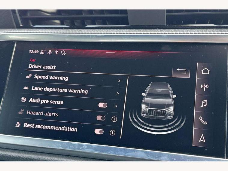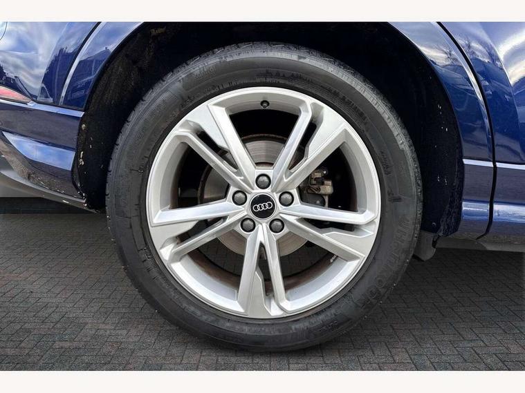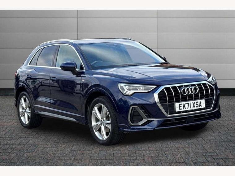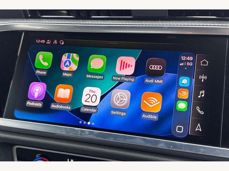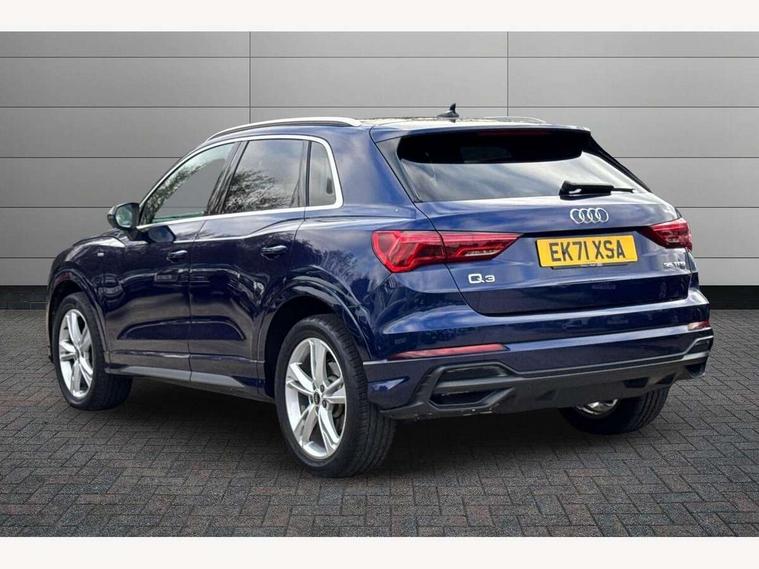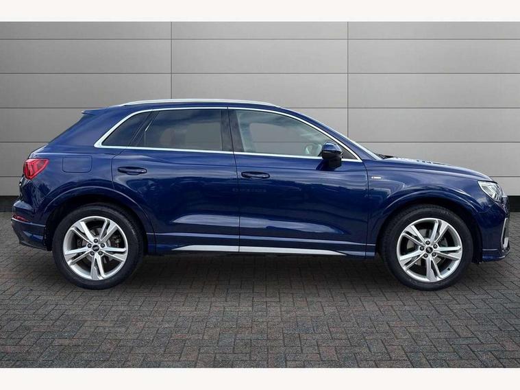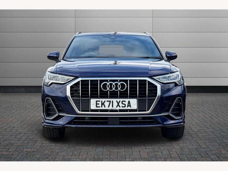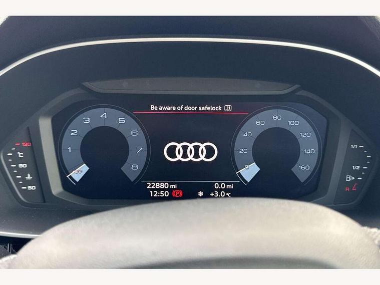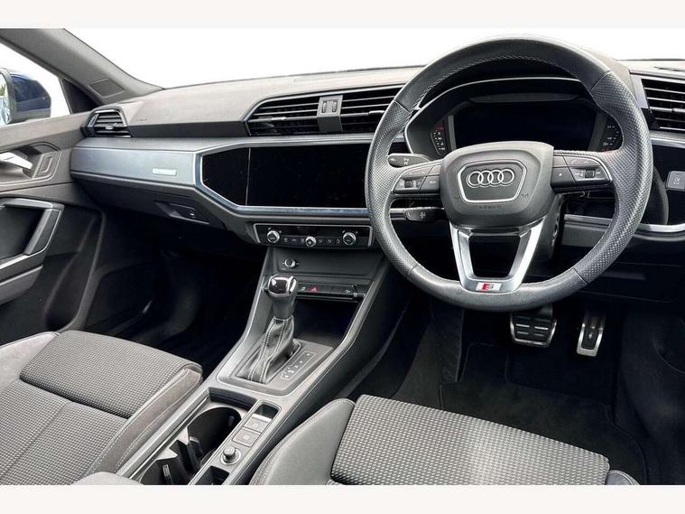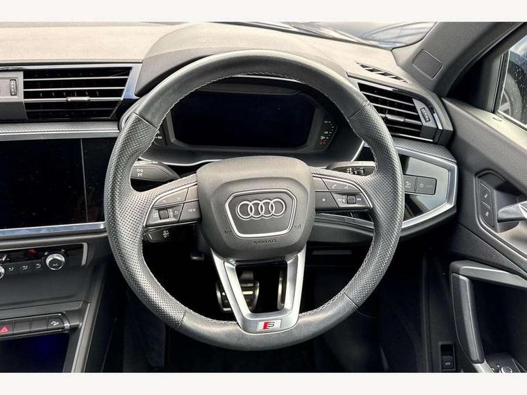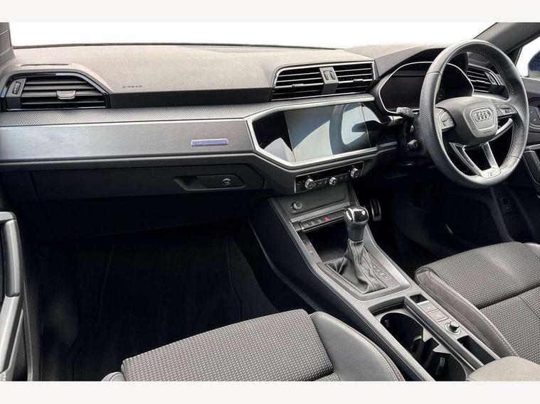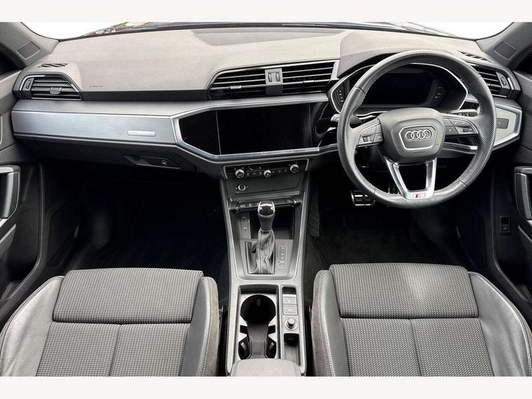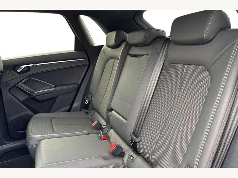 Amazon alexa Integration, Audi connect safety and service (e-call), Audi drive select, Audi lane departure warning, Audi Virtual Cockpit - 10.25" display, Bluetooth interface, Camera based traffic sign recognition, MMI Navigation Plus with high resolution 10.1 inch touchscreen colour display, Power operated tailgate, Progressive steering, Service interval indicator, Smartphone interface includes wireless Apple carplay/Android Auto, Start stop system with recuperation, Voice control system with natural language interaction, 48V Mild hybrid technology, Sports suspension, 2 USB-C ports with charge and data functions, 6 passive loudspeakers, DAB digital radio module, Acoustic windscreen, Aluminium roof rails, Aluminium window trim, Auto dimming frameless rear view mirror, Body coloured bumpers, Electrically folding, adjustable and heated door mirrors with integrated LED side indicators and kerb view function for passenger side, Front and rear electric windows, Front fog lights, Front side air inlets in matt platinum grey, Front spoiler blade in matt platinum grey, Grille vertical bars in aluminium silver/Matt, High gloss black finish B and C pillars, LED headlights with LED daytime running lights and dynamic rear indicator, LED rear lights, Privacy glass dark tinted rear and rear-side windows (from B-pillar backwards), Rain and light sensors, Rear diffuser strip in matt titanium black, S line badges on front wings, S Line front and rear bumpers, Side skirt insert in matt Platinium grey, Silver chrome grille surround, Titanium black radiator grille, 12V socket in rear centre console, 40:20:40 folding with manual adjustment for 60:40 forwards/backwards position and backrest angle, Adjustable rear seat bench/backrest with centre armrest and cupholder, Black cloth headlining, Dual zone electronic climate control, Front and rear black floor mats with contrast stitching in rock grey, Front and rear headrests, Front and rear roof module including reading lights, Front centre armrest, Glove compartment lighting, Height and reach adjustable steering wheel, Illuminated door sill trims with S logo, ISOFIX child seat mounting for front passenger with airbag deactivation and outer rear seat including top tether attachment point for outer rear seats, Luggage compartment light, Manual front seats with height adjustment, Perforated leather gearknob, Stainless steel luggage compartment sill finisher, Stainless steel pedals, Non smoking pack - Q3, 3x3 point rear seatbelts, 6 airbags - Driver, front passenger, curtain and side windows, Audi pre-sense front with pedestrain and cyclist recognition, Electrically operated child locks on rear doors, Electromechanical parking brake, Electronic stabilisation control including ABS, ASR and EDL, Hill descent control, Hill hold assist, Pre sense basic, Seatbelt monitoring, Tyre pressure warning, Warning triangle and first aid kit, Anti theft alarm, Anti theft wheel bolts, Remote central locking, Dark matt brushed aluminium inlay, Detail dashboard around MMI touch colour display in glass look, black with surround in aluminium look, Leatherette door armrest, Tool kit, Tyre repair kit,