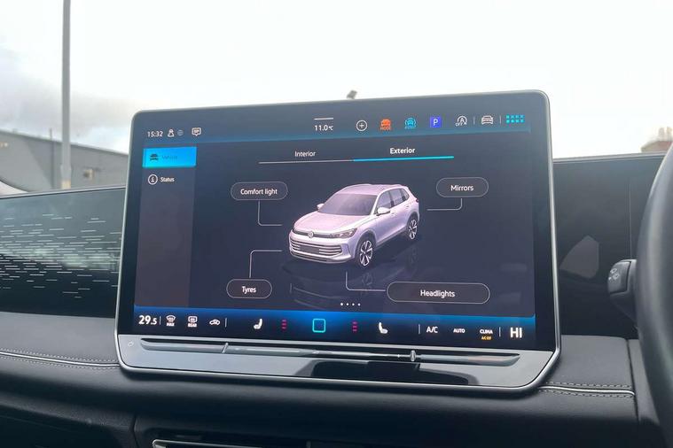 Adaptive cruise control (ACC), Advanced driver attention and drowsiness monitor, Bluetooth mobile phone interface, Comfort drive travel assist, lane keeping system, lane assist and emergency assist, Digital Cockpit Pro - 10.25" high resolution dash display screen with customisable menus and information, Dynamic road sign display, E-Sim card for online connectivity, eCall emergency call service, Front Assist - Autonomous emergency braking with pedestrian and cyclist monitoring, Lane change system, Side assist, Rear traffic alert and Exit warning system, Multifunction front facing camera, Oncoming vehicle braking when turning including swerve support, Park assistance plus with front and rear parking sensors, Power assisted steering with speed sensitive, Start/stop system with regenerative braking, Warning signal and warning light for front and rear seatbelts not fastened, Wireless App-Connect, Front wheel drive, Digital radio reception (DAB), Diversity antenna for FM reception, Ambient lighting with logo projection, Auto dimming interior rear view mirror, Automatic headlight control system, Body colored bumpers in R-Line style, Body coloured door handles, Body-coloured exterior mirror housings, Chrome moldings on the side windows, Coming/leaving home lighting function, Heat insulating glass in side and rear windows, Heated rear window, Heated windscreen washer jets, High level 3rd brake light, Illuminated door handle recesses, Illuminated lightline between headlamps, Laminated safety glass from B-pillar backwards 90% tinted, Laminated safety glass windshield, Rain sensor windscreen wipers, Rear fog light on one side, reversing light on both sides, Rear side wing doors, Rear wiper, Silver roof rails, 12V outlet in center console rear and in luggage compartment, 12V socket in centre console, 3 bench rear seats in 2nd row, Air care climatronic 3 zone air conditioning system with rear air conditioning control panel, Carpet mats, front and rear, Centre console with illuminated storage compartment with sliding cover and two drinks holders, Ceramique headlining, Chrome elements on the mirror switch and power window switches and door pulls, Door and side trim panel with leatherette insert, Door sill protectors, Front centre armrest, Interior ambient lighting with 30 colour options, ISOFIX anchors for child seats on outer rear seats and front passenger seat compatible with i-Size, Mechanical rear seat release, Power adjustable lumbar support in front, Rear bench seat, split folding, longitudinally movable and folding with load-through hatch and centre armrest, Safety optimised front head restraints, Single front passenger seat, Sports comfort seats in front, Sun visors with illuminated vanity mirrors, Three rear head restraints, Variable luggage compartment floor, Comfort package incl. Memory feature for Park assist and Safelock - Tiguan, Driver assistance package - Tiguan, 3 point seat belt for centre rear seats, 3 Point seat belts in front with pretensioners, 3 point seatbelts in outer rear with ECE label, Driver and front passenger airbag with front passenger airbag deactivation, Electronic parking brake with auto hold, Front and rear curtain airbags, Front and rear side airbags, Front centre airbag, Front disc brakes, Manual child proof rear door locks, Rear disc brakes, Two tone horn, Warning triangle, Anti theft wheel bolts, Decorative inserts Cross in dash and front door panels, Interior door handle in matte chrome, Soul instrument panel,