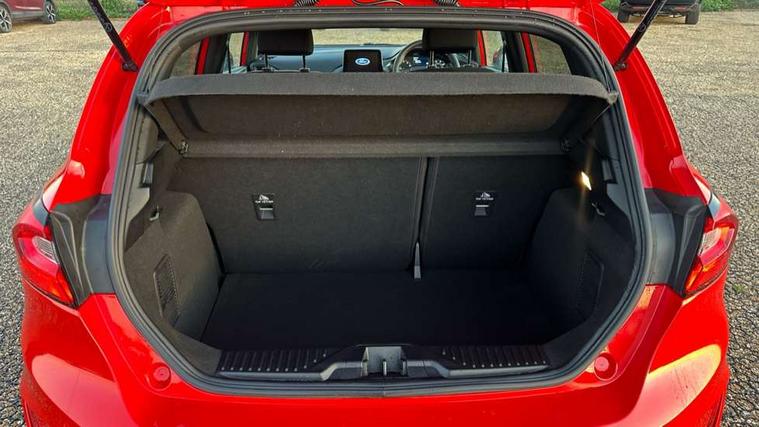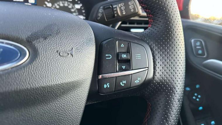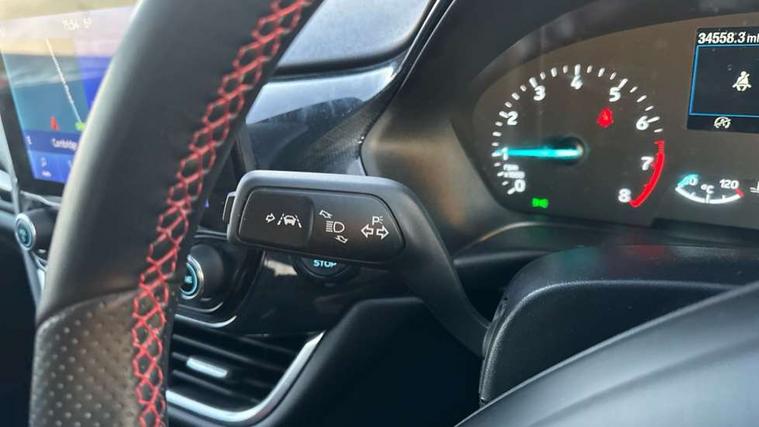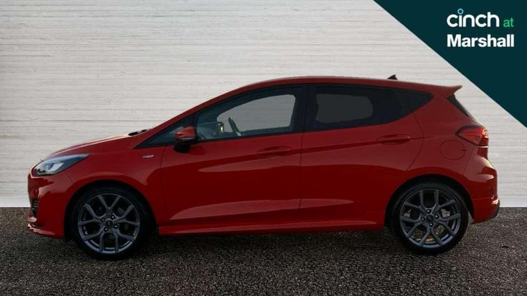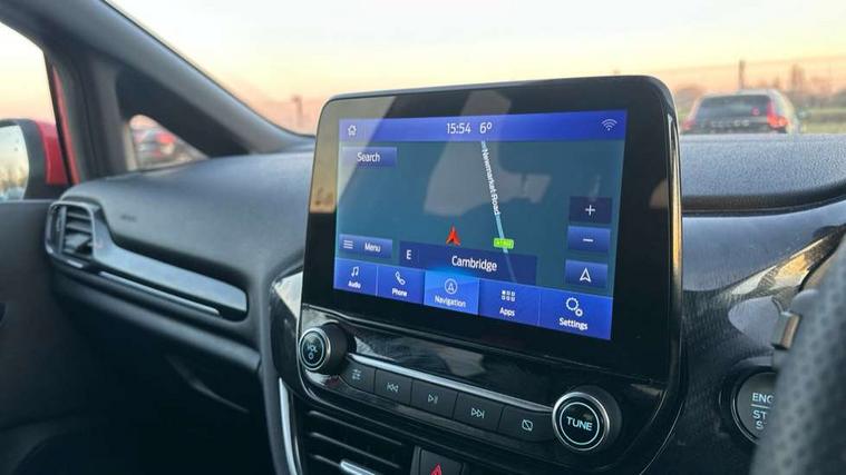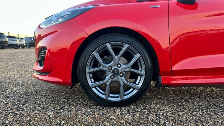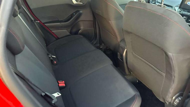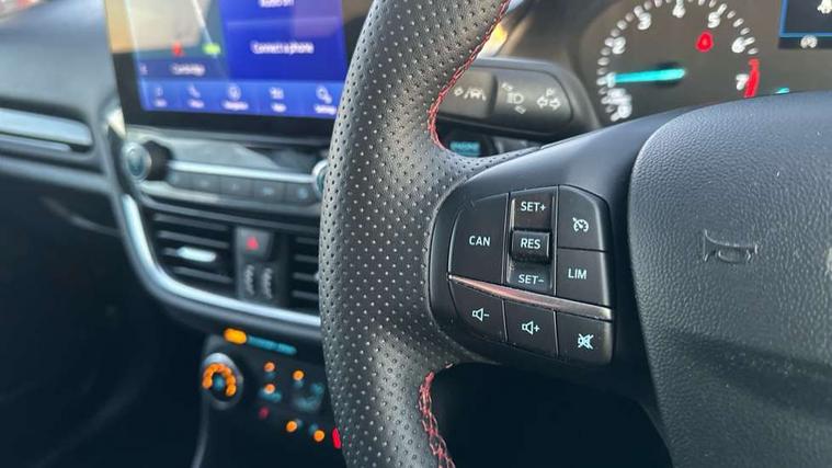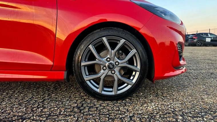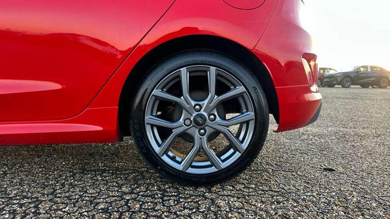 Bluetooth system, Electric power steering, Ford easy fuel, Ford SYNC 3 Navigation system incl 8" touchscreen, 7 speakers, FordPass connect, Apple carplay, android auto, voice control and emergency assistance, Rear parking distance sensors, Selectable drive modes (Normal, Sport, Track), Trip computer, Sports suspension, 2 USB ports, Auxiliary input socket, DAB Digital radio, Steering wheel mounted controls, Body colour bumpers, Body colour door handles, Body colour large rear spoiler, Body coloured electrically operated and heated door mirrors with side indicators, Cornering front fog lights, Electric front windows/one touch facility, Electric rear windows, LED Night signature to rear lights, Quickclear heated windscreen, Rain sensing wipers and auto dimming rear view mirror, Rear privacy glass, Rear wiper, Unique ST-Line upper grille & full bodystyling kit with ST-Line wing badges, 3 spoke flat bottomed leather steering wheel, 60/40 split folding rear seat, Adjustable head restraints, Black headlining, Boot carpet, Centre console with opening armrest, 2x cupholders, 12v and USB, Chrome inner door handles, Cloth upholstery, Footwell illumination, Front floor mats in velour, Front map reading lights, Front seat and rear pockets, Illuminated glovebox, Leather gaiter, Load area light, Manual 2 way passenger seat adjust, Manual 4-way driver seat adjust, Manual air conditioning, Overhead console with sunglasses holder, Pollen filter, Rake/reach adjustable steering wheel, Sensico wrapped steering wheel, Sports front seats, NCAP Pack - Fiesta, 3 point seatbelts on all rear seats, ABS+EBA, Curtain airbags, Driver and passenger airbags, Drivers knee airbag, Electronic stability control with hill start assist, Front passenger airbag deactivation, Front side airbags, Seatbelt warning, Two tone horn, Tyre pressure monitoring system, Keyless start with 'Ford Power' starter button, MyKey system, Remote central locking & engine immobiliser, Thatcham Cat.1 alarm, 17" 5 spoke alloy wheels with rock metallic finish,