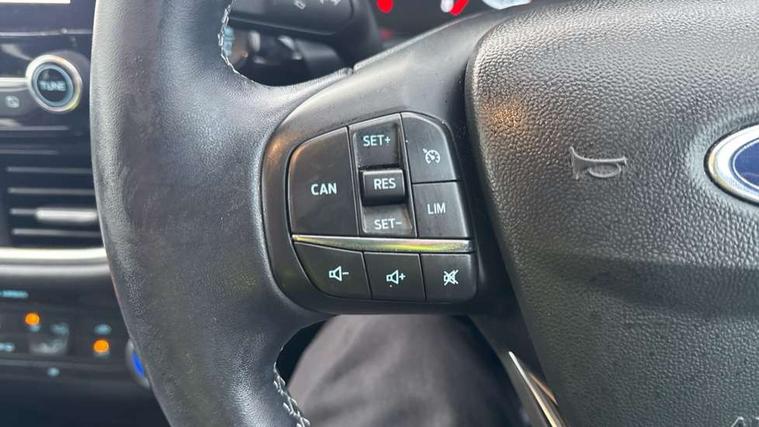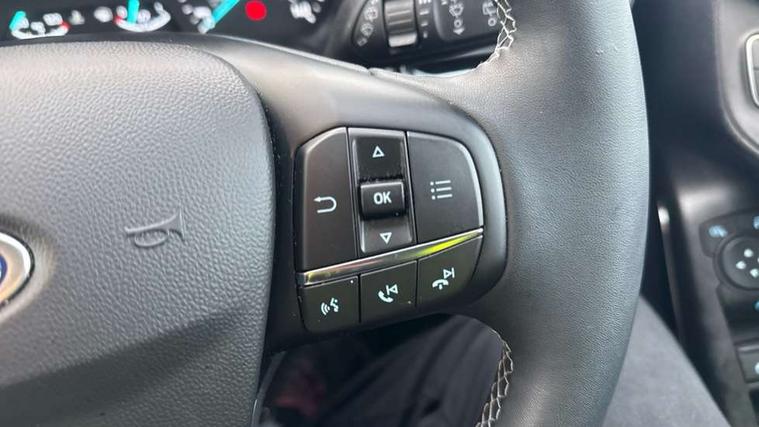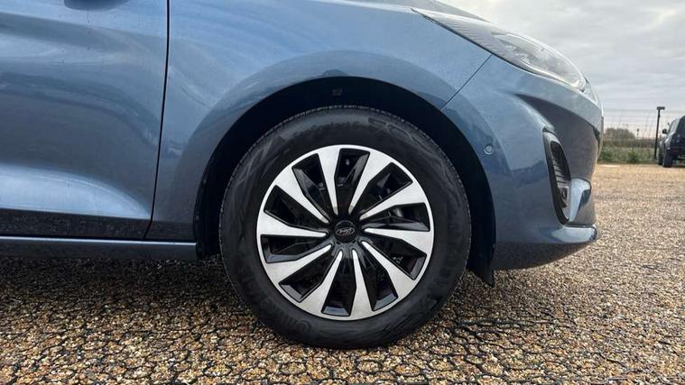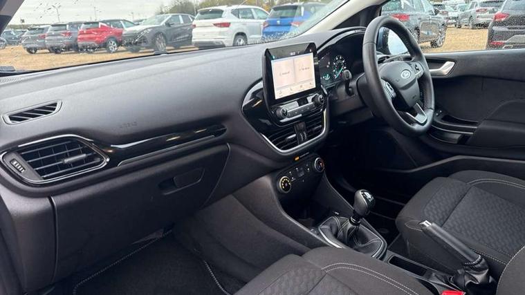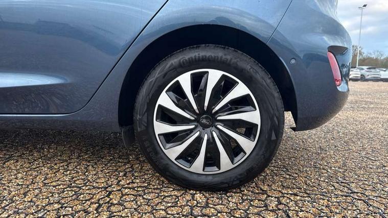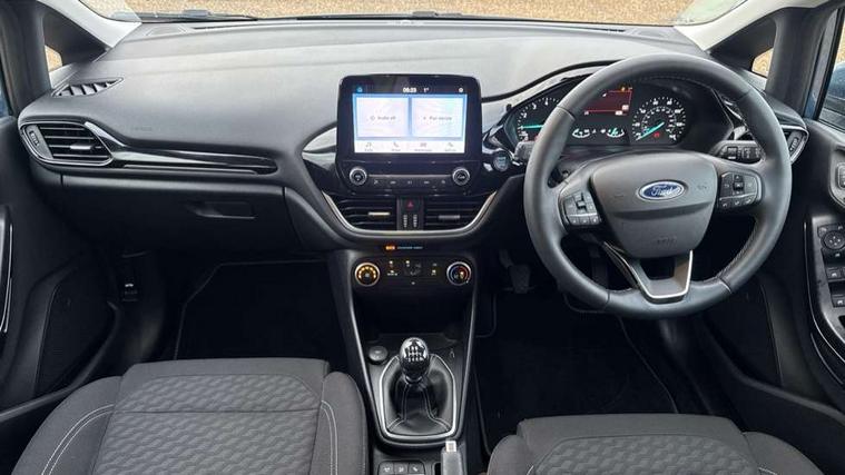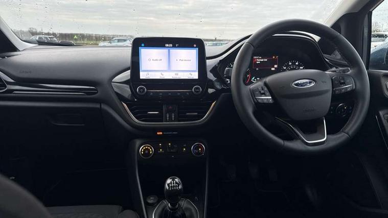 Bluetooth system, Electric power steering, Ford easy fuel, Ford SYNC 3 Navigation system incl 8" touchscreen, 7 speakers, FordPass connect, Apple carplay, android auto, voice control and emergency assistance, Rear parking distance sensors, Selectable drive modes (Normal, Sport, Track), Trip computer, 2 USB ports, Auxiliary input socket, DAB Digital radio, Steering wheel mounted controls, Body colour bumpers, Body colour door handles, Body colour rear spoiler, Body coloured electrically operated and heated door mirrors with side indicators, Chrome beltline trim, Chrome front grille, Chrome lower window surround, Cornering front fog lights, Electric front windows/one touch facility, Electric rear windows, Quickclear heated windscreen, Rain sensing wipers and auto dimming rear view mirror, Rear privacy glass, Rear wiper, 3 spoke leather trimmed steering wheel with audio control, 60/40 split folding rear seat, Adjustable head restraints, Boot carpet, Centre console with opening armrest, 2x cupholders, 12v and USB, Chrome inner door handles, Cloth upholstery, Footwell illumination, Front floor mats in velour, Front map reading lights, Front seat and rear pockets, Illuminated glovebox, Leather gaiter, Load area light, Luxury woven headliner, Manual 2 way passenger seat adjust, Manual 4-way driver seat adjust, Manual air conditioning, Overhead console with sunglasses holder, Pollen filter, Rake/reach adjustable steering wheel, Sensico wrapped steering wheel, NCAP Pack - Fiesta, 3 point seatbelts on all rear seats, ABS+EBA, Curtain airbags, Driver and passenger airbags, Drivers knee airbag, Electronic stability control with hill start assist, Front passenger airbag deactivation, Front side airbags, Seatbelt warning, Two tone horn, Tyre pressure monitoring system, Keyless start with 'Ford Power' starter button, MyKey system, Remote central locking & engine immobiliser, Thatcham Cat.1 alarm, 16" 10 spoke alloy wheels,