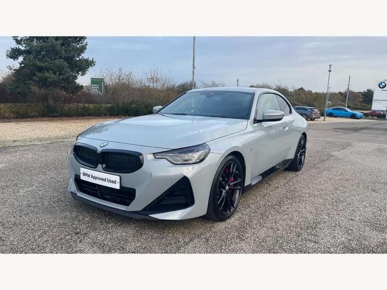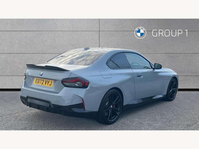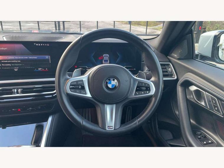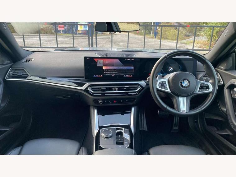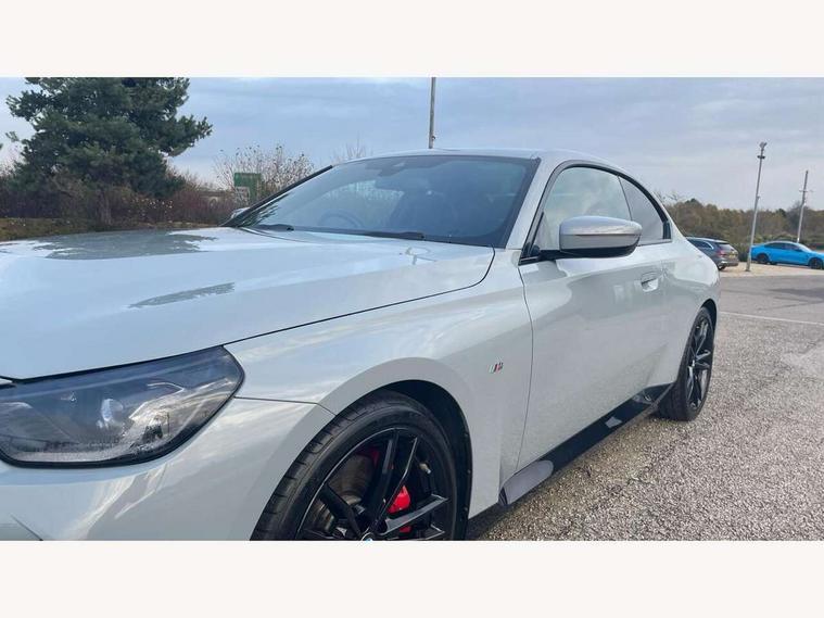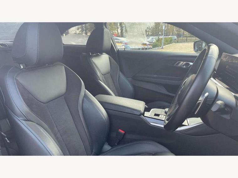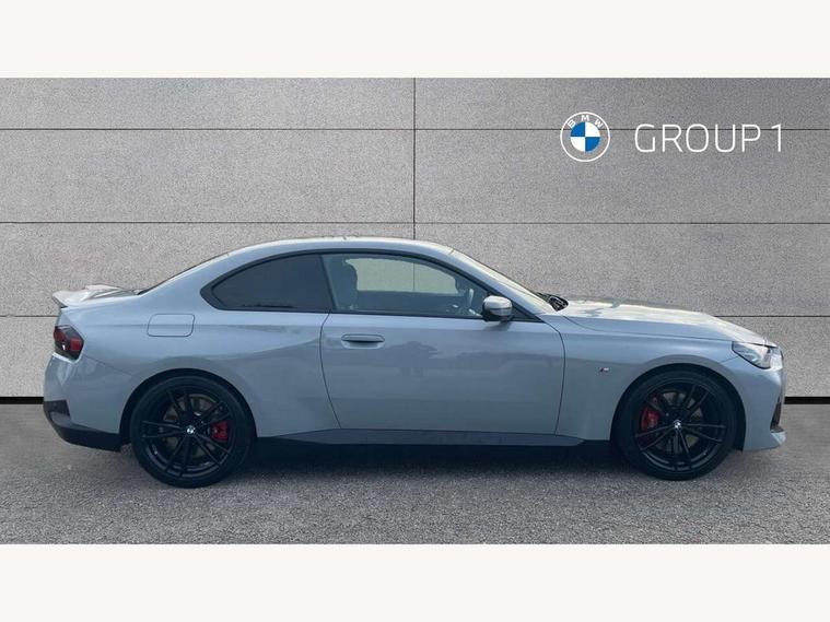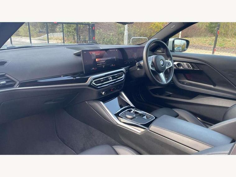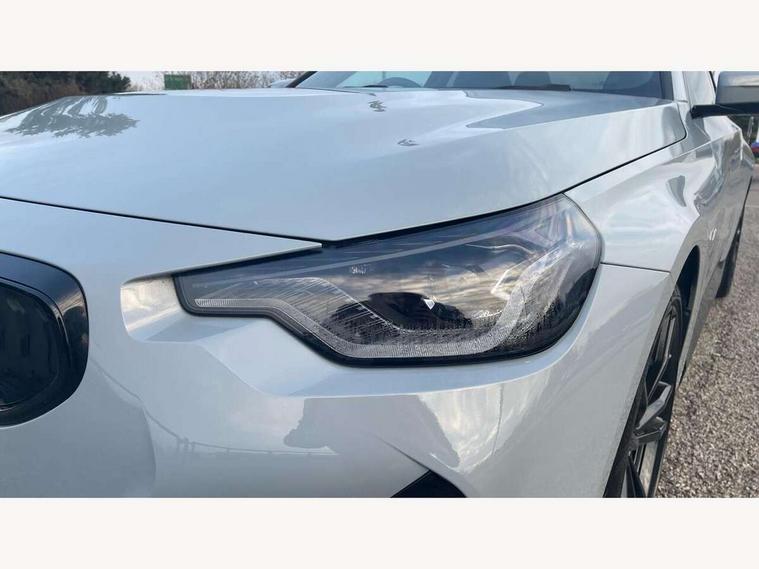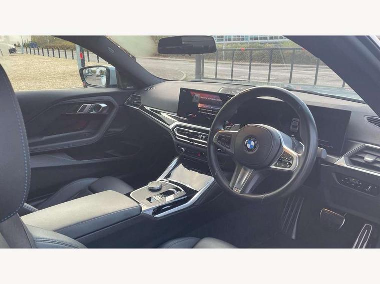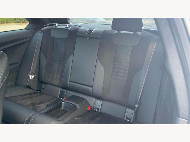 Attentiveness assist, Auto start-stop, Bluetooth, BMW ConnectedDrive online services, BMW Teleservices, Check Control warning system for monitoring of lights and door/luggage compartment open warning, Direct selection buttons, Drive off assistant, Eco pro mode, Electric power steering, Front and rear parking sensors, Front/rear Parking distance control, iDrive controller with turn and press function, Integrated owners handbook, Intelligent functions, Live cockpit plus with nav function 12.3" instrument cluster and 14.9" centre display, Oil sensor for level and grade, Optimum shift indicator, Personal Profile, Touch operation on control display, Variable sport steering, Widescreen multi-media display, Aluminium lightweight construction, Balancer shaft, BMW TwinPower Turbo four-cylinder petrol engine, Double VANOS, Drive performance control with ECO PRO comfort + sport mode, Electronic differential lock, High precision injection, M sport suspension, Petrol Particulate Filter, Sport automatic steptronic transmission with gearshift paddles, manual gearshift time display, launch control, coasting idle ECO PRO/COMFORT modes, Twin scroll turbocharger with Valvetronic, DAB tuner, Acoustic windscreen wipers for reduced driving noise, Adaptive LED Headlights, Automatic windscreen wipers and automatic headlight, Automatically dimming rear view mirror, Body colour door handles flush with door surface, Body colour door mirrors, Body colour front and rear bumpers, Daytime running lights, Electric windows - front and rear, with open/close fingertip control and trap release, Exhaust tailpipes x2 - 90mm in left and right, Fading support, Front and rear bumper system with replaceable deformation elements, Front door sill finishers in black plastic with BMW designation, Front windscreen wipers with integrated washer jets, Green tinted heat protection glazing, High beam assistant, High gloss shadowline exterior trim in mirror triangle cover, mirror cover panel, mirror bezel and window border, High level third brake light, Indicators integrated int mirror housing, LED registration plate light, LED technology rear tail lights, brake lights and turn indicators, Lightweight engineering, Model designation on right side of tailgate, One piece kidney grille with hight gloss chrome surround, Rear boot, Rear fog lights, Reversing light in rear light cluster, Shark fin antenna, Single part LED rear lights with smoked glass components, Trailer stabilisation logic, Visible VIN plate, 12V power socket in front centre console with blanking plug, 2 cupholders in front centre console, 3 zone automatic air conditioning, Ambient lighting, Compartment in front of cupholder, Conditioned based service, Driver seat backrest width adjustment, Front and rear side armrests integrated into door trim, Front armrest, Front door pockets, Front head restraints, Front sport seats, Heated front seats, Illuminated glove compartment with separate small compartment, M headliner Anthracite, M sport leather steering wheel, Manually adjustment steering wheel column, Rear seat backrest with manual 40:20:40 split folding, Rear seat centre foldable armrest with integrated cup holder, Single front passenger seat, Storage compartment between rear seats, Storage tray and compartment with cover in centre console, Sun visors with vanity mirrors and insert tab, Through loading system with 40/20/40 split folding 2 rear seat in 2nd row, Two folding rear seat headrests, Velour floor mats, Additional storage compartment pack without USB - 2 Series Coupe, Connected pack professional - 2 Series Coupe, Interior and exterior mirror pack - 2 Series Coupe, M Sport exterior styling aerodynamics pack - 2 Series Coupe, 2 tone horn, Anti lock braking system (ABS) with cornering brake control, Automatic Stability Control (ASC), BMW emergency call, Brake drying, Child seat ISOFIX attachment for the two outer rear seats, Crash sensor activating of airbags, Unlocking doors, hazard warning lights, interior light, safety battery terminal, Deactivation of fuel pump in the event of a crash, Driver and front passenger airbags, Driver and front passenger side airbags, integrated in the door side seat backrest bolsters for all seat variants, Dynamic brake control, Dynamic stability control + (DSC+), Dynamic Traction Control - DTC, Electrically operated hand brake including automatic hold function and automatic release when driving off, Front and rear disc brakes, Front passenger airbag deactivation, Head airbags for all 4 outer seats, Manual deactivation of front passenger airbag, Seat belt security check for driver and front passenger, Seatbelt warning, Side impact protection, Three point seat belts on 4 seats including front belt stopper, pyrotechnic belt tensioners and belt force limiters, Tyre pressure sensor, Warning triangle and first aid kit, Alarm system (Thatcham 1) with remote control and electronic engine immobiliser, Central locking switch for all doors, fuel filler cap and luggage compartment, Deadlocking function system to all doors, Drive away locking system on all doors and luggage compartment, Locking wheel bolts, Start/Stop button (illuminated) in centre console with keyless engine start and Auto Start-Stop deactivation button, Two remote control key with integrated key - one button for open and close doors/fuel flap/tailgate and separate button for unlock luggage compartment, BMW mobility tyre sealing system, Electrically powered 12V compressor, Reduced rolling resistance tyres,