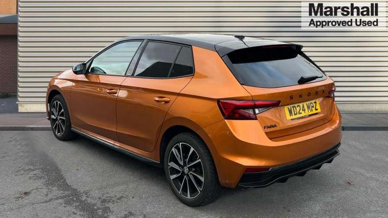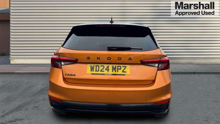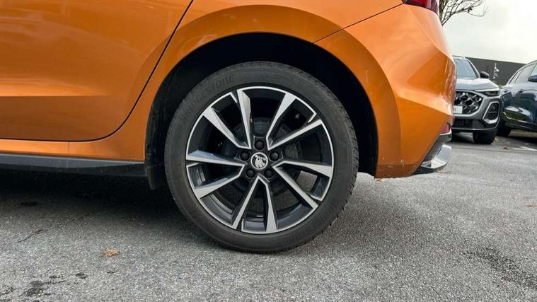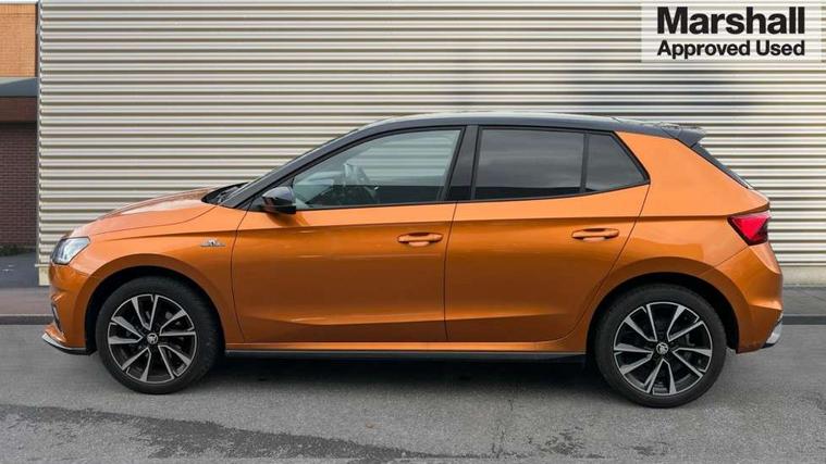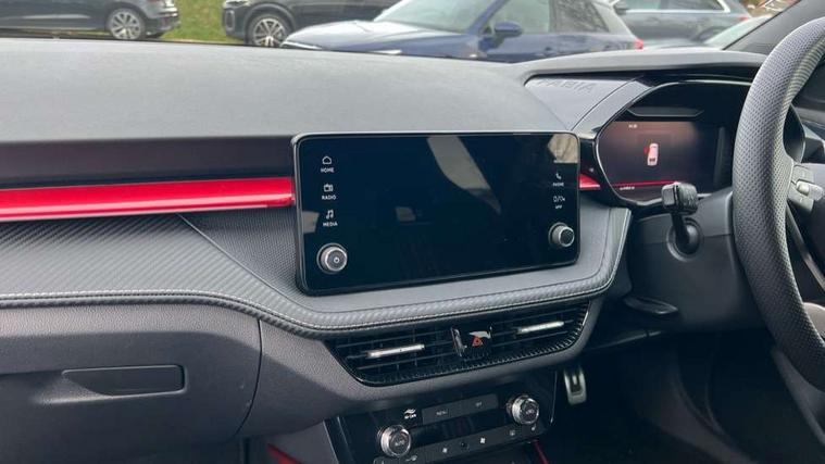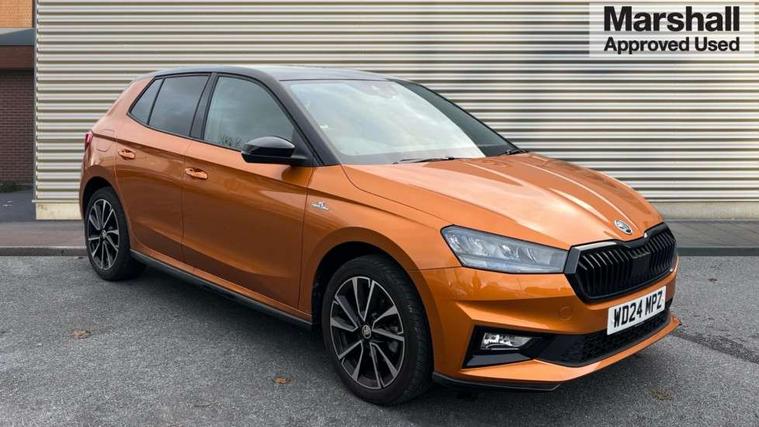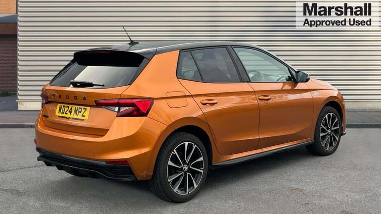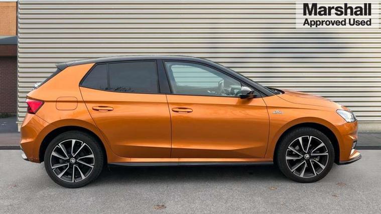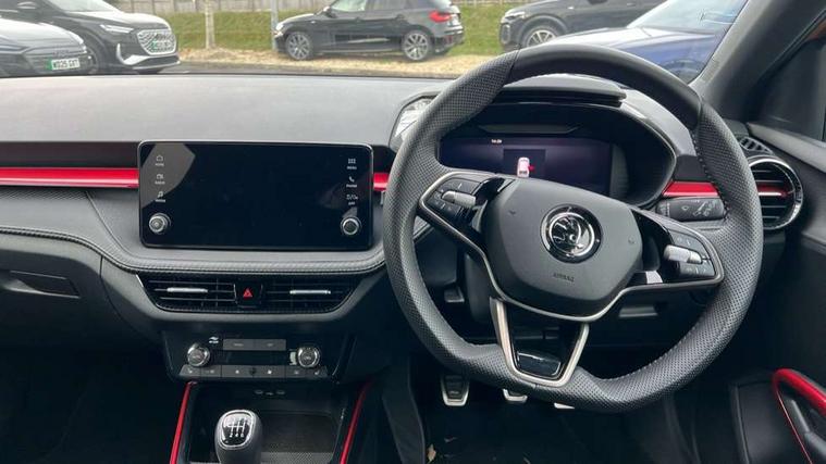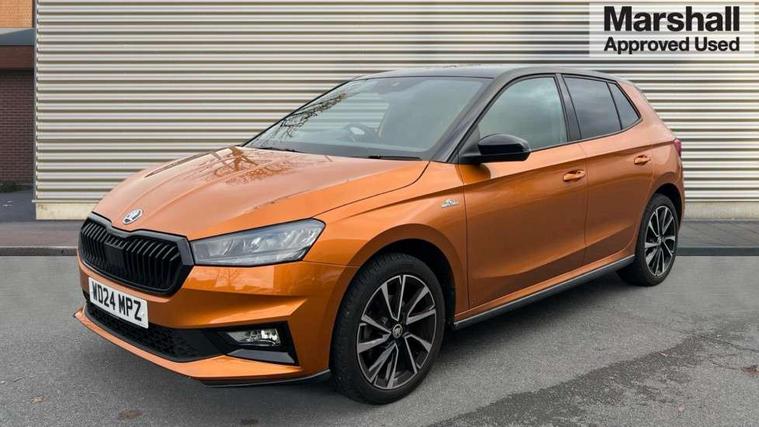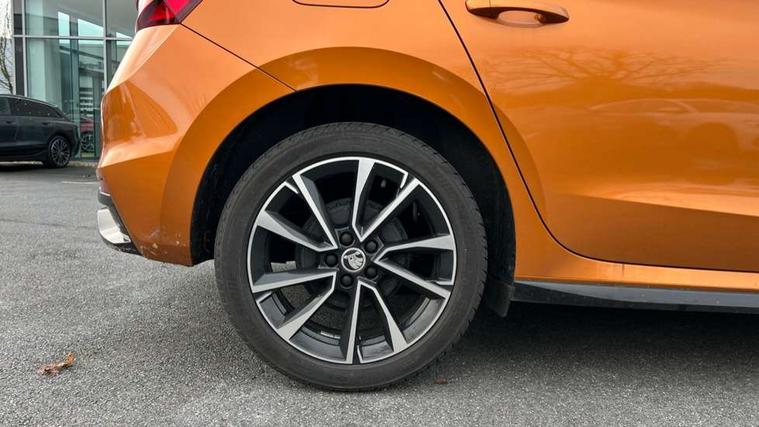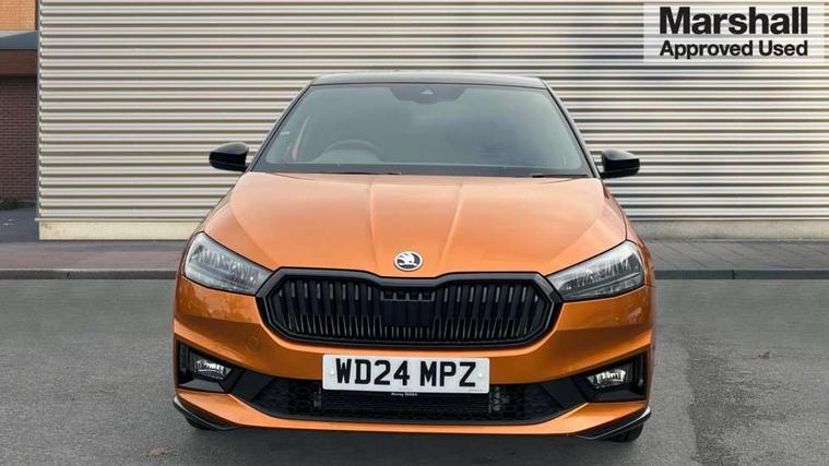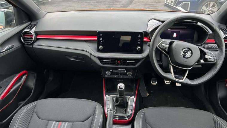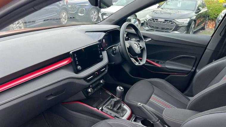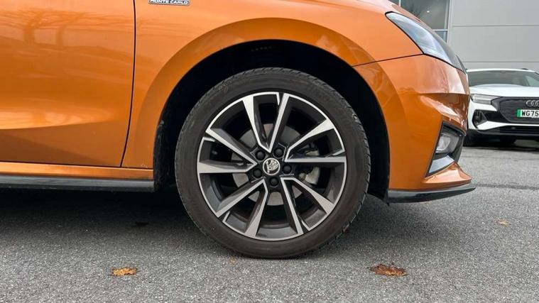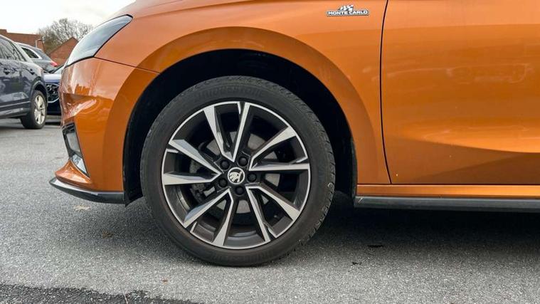 Advanced driver attention and drowsiness monitor, Bluetooth connection, Electromechanical power steering, Exterior temperature gauge, Service interval indicator, Traffic sign recognition, Virtual cockpit with 10.25" colour display, Wireless SmartLink for Apple CarPlay and Android Auto, 6 Speakers (4 in front and 2 in rear), Auxiliary socket for external MP3 player, DAB digital radio reception, Auto dimming rear view mirror, Black radiator grille, Body coloured bumpers, Door mirror integrated indicators, Front and rear electric windows, Front window wiper intermittent control, Headlight range control - Automatic, Ice scraper in fuel cap, LED daytime running lights with coming and leaving home feature, LED rear lights, Monte Carlo badging, Privacy glass, Rear LED fog light, Rear side wing doors, Rear window wiper with washing nozzles, Roof mounted spoiler, SKODA tailgate lettering in black, Sports bumpers, Third brake light, 2 reading lights in front and 2 reading lights in rear, 3 rear headrests, Aluminium pedals, Backrest split and folding, Black headlining, Central console with removable cup holder and storage box, Chrome handbrake release button, Door sills with fabia badging, Dual zone air conditioning with climatronic electronic control, Fabric/artificial leather upholstery, Front centre armrest, Front sports seats, Gearshift knob/handle in leather, Hand brake lever handle in leather, Height adjustable front headrests, Height adjustable front seats, Height adjustable steering wheel, ISOFIX and TopTether anchorage points to the outer rear seats, ISOFIX and TopTether on the front passenger seat, Luggage compartment lighting, Manually adjustable lumbar support in front seats, Metallic painted red central console cover, Metallic red interior door handles, Pollen filter, Rear seat bench unsplit, Single front passenger seat, Sun visors with mirror and airbag label on passenger side, Textile floor mats, Ticket holder, Umbrella in drivers door, 3-point height adjustable front seats belts with pretensioner and force limiter, Automatic warning lights in case of crash, Driver and passengers airbag with switch off function, e-Call+, ESC including ABS, MSR, ASR, EDS, HBA and XDS, Front and rear seat belt warning, FRONT ASSIST (AEB City and AEB Inter Urban), Front side airbags, Head airbags, One tone horn, Pedestrian protection, Three rear 3-points safety seat belts with pretensioner and force limiter including stop function for outer rear seat belts, Tyre pressure monitoring system, Anti-theft alarm system including immobiliser, interior monitoring, backup horn, and towing protection, Central locking with radio remote control, interior controls, SAFE function and 2 foldable keys, Carbon effect door and side trim panels, Carbon effect lower decorative trim with white stitching, Monte carlo air vents, Red metallic upper decorative trim, Anti-theft wheel bolts protection, Super-low rolling resistance tyres,