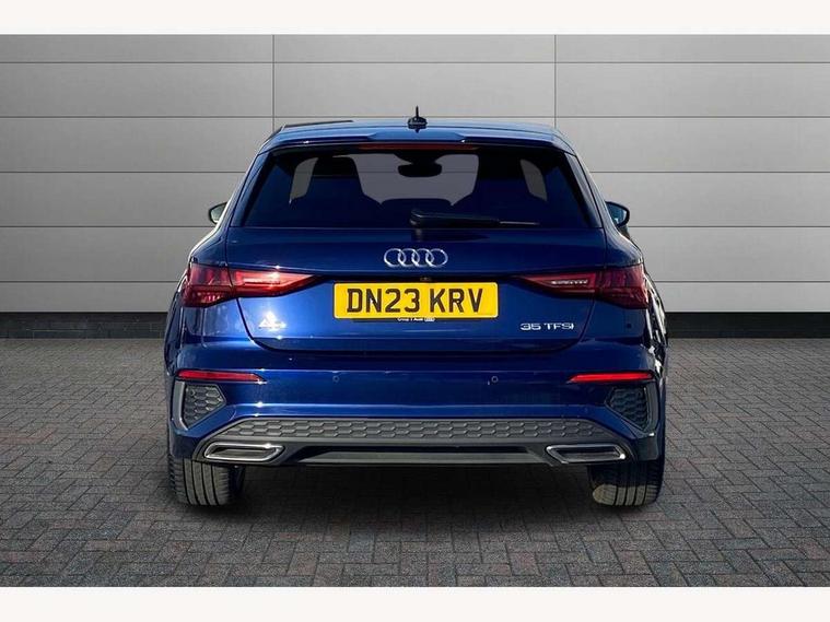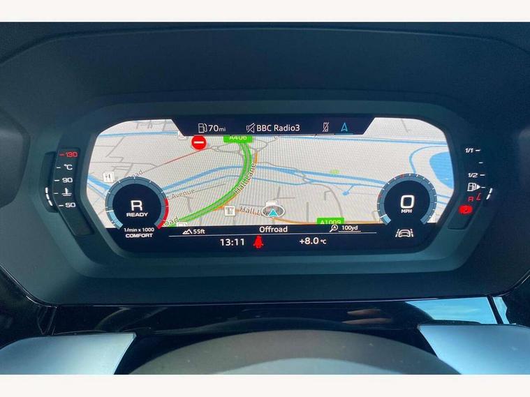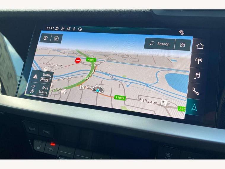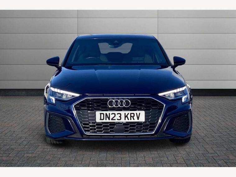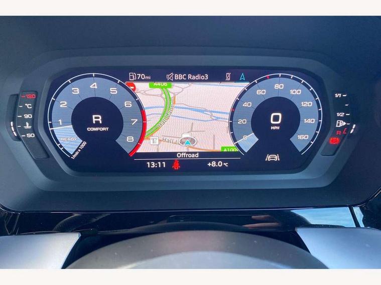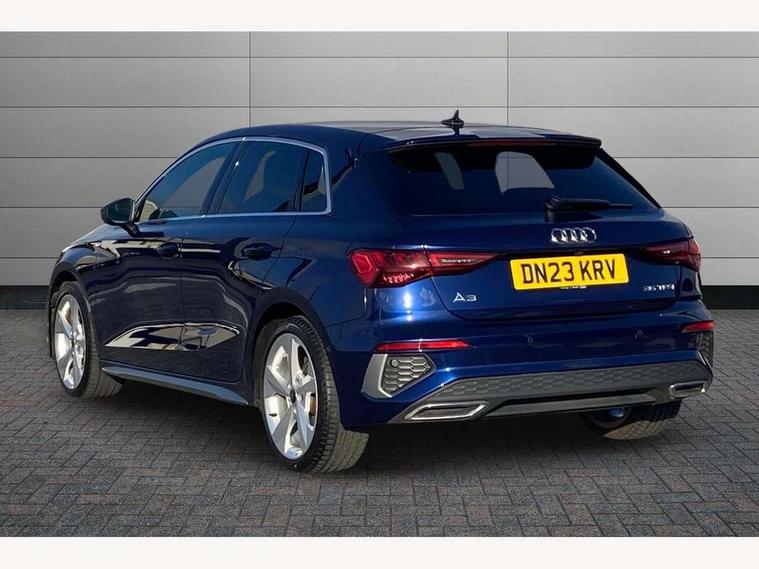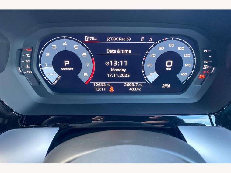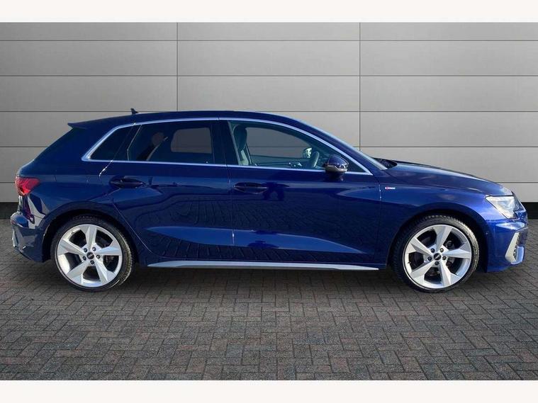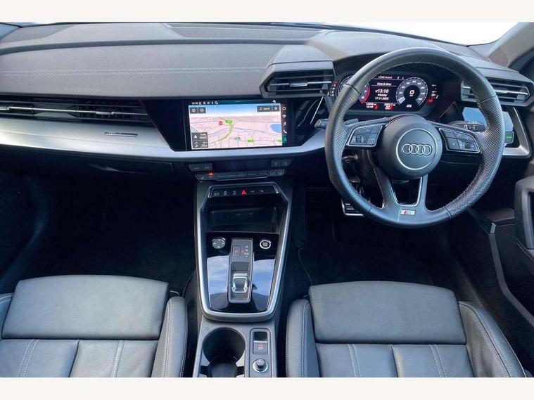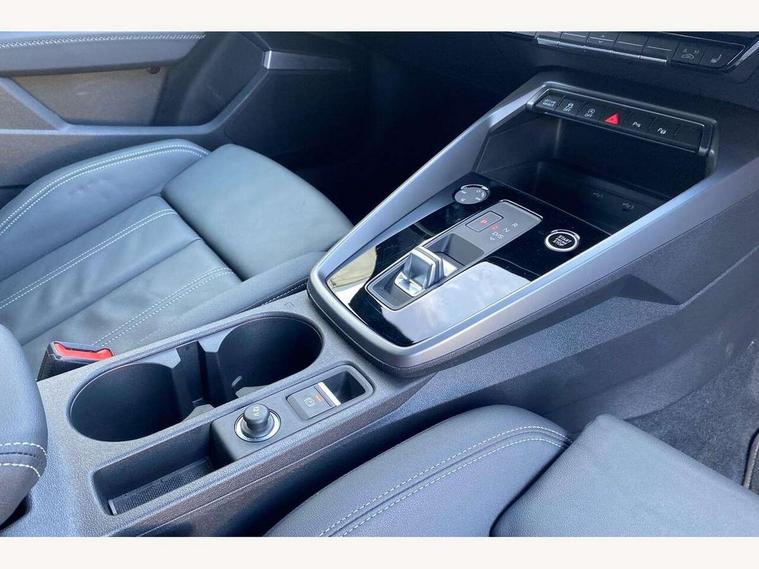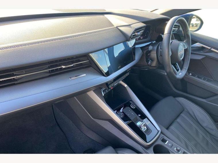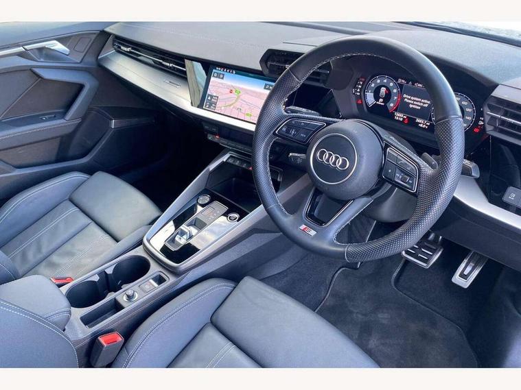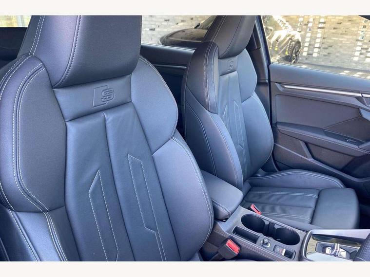 Audi drive select (Auto, Comfort, Dynamic, Efficiency and Individual), Audi smartphone interface, Audi Virtual Cockpit - 10.25" digital and colour instrument cluster, Automatic start/stop system with recuperation, Bluetooth interface, Camera based traffic sign recognition, Collision avoidance assistant, e-Call (emergency call), Electromechanical power speed sensitive steering, Lane departure warning system, MMI Navigation Plus with high resolution 10.1" colour touch screen display, Service indicator, Trip computer, Voice control system with natural language interaction, Sports suspension, 2xUSB-C connection with data and charging functions, 6 passive loudspeakers, DAB Digital radio, 3rd brake light, Acoustic glass windscreen, Aluminium window trim, Auto dimming frameless rear view mirror, Body colour exterior mirrors, Electrically adjustable/heated/folding/auto dimming door mirrors with integrated LED indications + kerb view function for passenger side, Front electric windows, Illuminated aluminium inserts front door sills with S logo, LED daytime running lights, LED headlights with LED rear lights and dynamic rear indicators, Light and rain sensors, Privacy glass - dark tinted rear window, rear door and side windows, Rear electric windows, Rear side air outlets in grained matt black, Rear side wing doors, Rear wiper, S line bumpers, S roof spoiler, 12V socket and storage compartment in front centre console, 3 seat bench in 2nd row, 3 spoke leather multifunction steering wheel with paddle shift, 4 way electrically adjustable lumbar support for driver and front passenger, 60/40 split folding rear seat bench, Black cloth headlining, Dual zone electronic climate control, Front and rear centre armrest in leather, Front and rear headrests, Front/rear floor mats, Height and reach adjustable steering wheel, Interior lighting - glove compartment light and right hand side, Luggage compartment floor covering, Manual boot compartment lid, Manually adjustable front seats, Seat side bolsters, Single front passenger seat, Stainless steel pedals and front footrest in black, Twin leather upholstery with front sports seats S embossed logo, Aluminium interior elements pack - A3 Sportback, LED interior lighting pack - A3 Sportback, S line styling pack - A3 Sportback, 3x3 point rear seat belts, Driver and front passenger airbag with passenger airbag deactivation, Electronic Stabilisation Control (ESC) including ABS, ASR and EDL, First aid kit with warning triangle and 2 safety vests, Front side airbags with head airbags and interaction airbag, Pre-sense front with pedestrian and cyclist detection, Seatbelt monitoring, Tyre pressure loss indicator, Anti theft alarm, Anti-theft wheel bolts, Electronically operated child lock, Immobiliser, Remote control central locking, Dark spectrum aluminium inlays, accent surfaces in the dashboard and centre console in platinum grey silk effect paint finish,