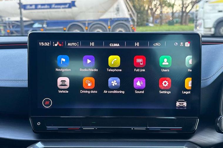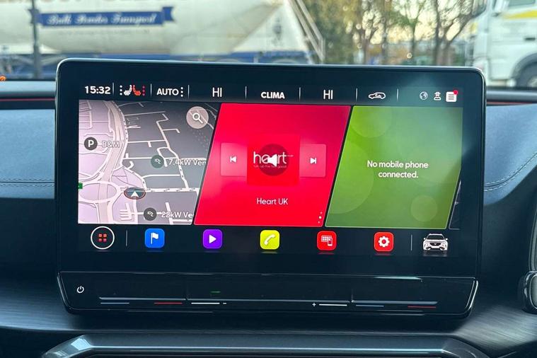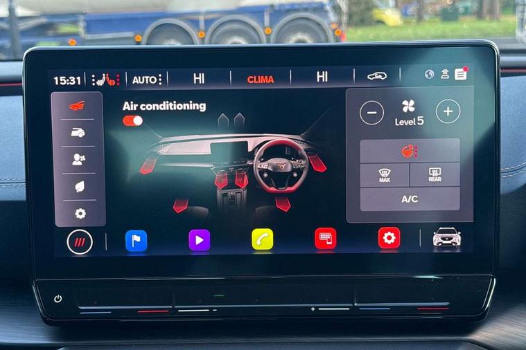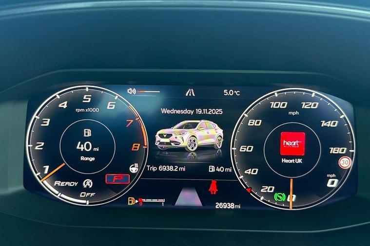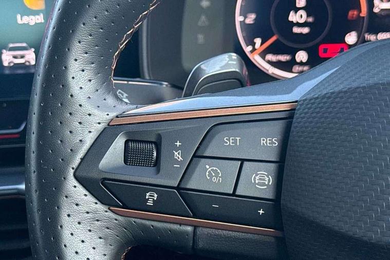 Digital cockpit and configurable dashboard, Driver alert system, Driving profile selection, Forward collision warning with automatic braking, Lane assist, Navigation system with 12'' Touchscreen Display, Park assist (inc front/rear parking sensors), PAS, Predictive adaptive cruise control with speed limiter, Rear view camera, RPM, trip computer, outside temp gauge, instrument light brightness, low fuel warning light, lights on reminder, gearshift indicator, Service interval indicator, Start/stop system with regenerative braking, Voice control system, Wireless apple carplay, Wireless phone charger, Electronic locking differential and dynamic traction support, Standard suspension, 2 front and 2 rear USB type C sockets, Auxiliary input socket, DAB radio, Auto dimming rear view mirror, Body colour door handles, Body coloured bumpers, Dark grey wing mirror, Daytime running light with automatic headlight control and coming home feature, Dynamic headlight range control, Electric front/rear windows, Electrically adjustable heated and folding door mirrors with memory function, Front fog lamps with cornering function, Gloss black roof rails and window surrounds, LED Headlights, LED Taillights with dynamic indicator, Rain sensing wipers, Rear diffuser with black simulated exhaust pipes, Rear side wing doors, Rear wash/wipe, Third brake light, Tinted rear windows, Welcome lights, 12v power supply in centre console, 12V socket, 12v socket in loadspace, 2 front and 2 rear reading lights, 230V socket, 3 seat bench in 2nd row, 60/40 split rear bench seat with armrest and mechanical seat release, Black headlining, Dust/pollen filter, Front and rear head restraints, Front centre armrest, Height/reach adjust steering wheel, Illuminated interior front door sills, Illuminated sunvisor with mirror, Isofix, Leather multi function heated steering wheel with gear shift paddles, Luggage tie-down hooks, Single front passenger seat, Three zone climate control with control panel in rear, Variable luggage/load compartment floor, Wraparound lighting, Genuine Nappa leather Pack - Cupra, 3 point seatbelts on all rear seats, ABS, Brake control system - ESC and brake booster, Child proof door locks, Driver and front passenger airbags with front passenger airbag de-activation, Electronic parking brake, Front and rear disc brakes, Front side curtain airbags, Hill hold control, Public e-call, Seat belt reminder for front and rear seats, Tyre pressure monitoring system, Anti theft alarm system, Keyless entry and start system (KESSY), Locking wheel bolts, Copper and aluminium interior detailing, 19" 'Exclusive' machined sport matte black and silver alloy wheels,