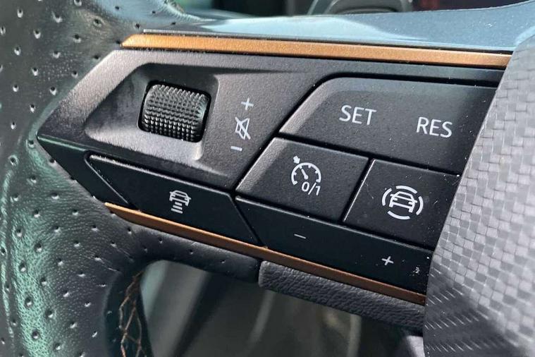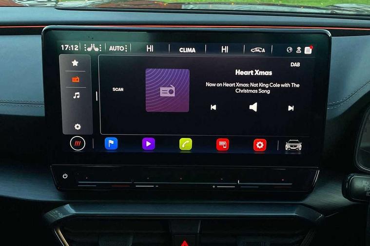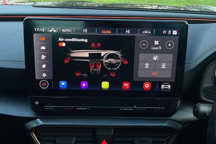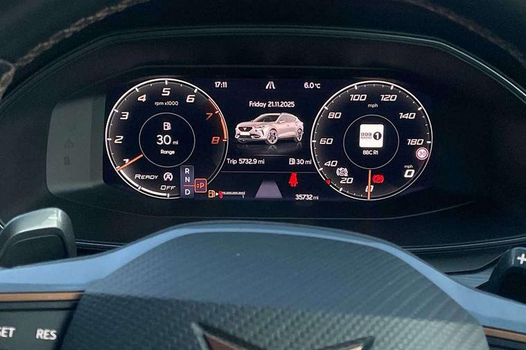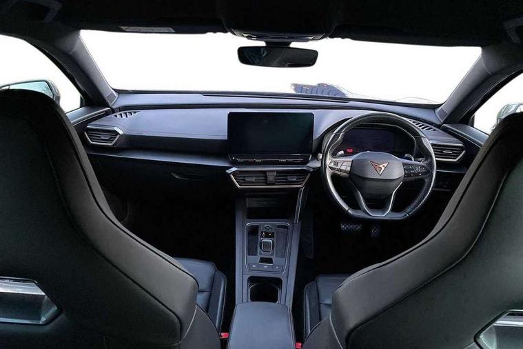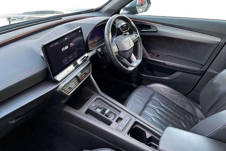 Digital cockpit and configurable dashboard, Driver alert system, Driving profile selection, Forward collision warning with automatic braking, Lane assist, Navigation system with 12'' Touchscreen Display, Park assist (inc front/rear parking sensors), PAS, Predictive adaptive cruise control with speed limiter, Rear view camera, RPM, trip computer, outside temp gauge, instrument light brightness, low fuel warning light, lights on reminder, gearshift indicator, Service interval indicator, Start/stop system with regenerative braking, Voice control system, Wireless apple carplay, Wireless phone charger, Electronic locking differential and dynamic traction support, Standard suspension, 2 front and 2 rear USB type C sockets, Auxiliary input socket, DAB radio, Auto dimming rear view mirror, Body colour door handles, Body coloured bumpers, Dark grey wing mirror, Daytime running light with automatic headlight control and coming home feature, Dynamic headlight range control, Electric front/rear windows, Electrically adjustable heated and folding door mirrors with memory function, Front fog lamps with cornering function, Gloss black roof rails and window surrounds, LED Headlights, LED Taillights with dynamic indicator, Rain sensing wipers, Rear diffuser with black simulated exhaust pipes, Rear side wing doors, Rear wash/wipe, Third brake light, Tinted rear windows, Welcome lights, 12v power supply in centre console, 12V socket, 12v socket in loadspace, 2 front and 2 rear reading lights, 230V socket, 3 seat bench in 2nd row, 60/40 split rear bench seat with armrest and mechanical seat release, Black headlining, Dust/pollen filter, Front and rear head restraints, Front centre armrest, Height/reach adjust steering wheel, Illuminated interior front door sills, Illuminated sunvisor with mirror, Isofix, Leather multi function heated steering wheel with gear shift paddles, Luggage tie-down hooks, Single front passenger seat, Three zone climate control with control panel in rear, Variable luggage/load compartment floor, Wraparound lighting, Genuine Nappa leather Pack - Cupra, 3 point seatbelts on all rear seats, ABS, Brake control system - ESC and brake booster, Child proof door locks, Driver and front passenger airbags with front passenger airbag de-activation, Electronic parking brake, Front and rear disc brakes, Front side curtain airbags, Hill hold control, Public e-call, Seat belt reminder for front and rear seats, Tyre pressure monitoring system, Anti theft alarm system, Keyless entry and start system (KESSY), Locking wheel bolts, Copper and aluminium interior detailing, 19" 'Exclusive' machined sport matte black and silver alloy wheels,
