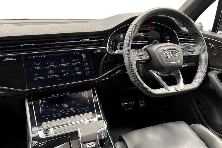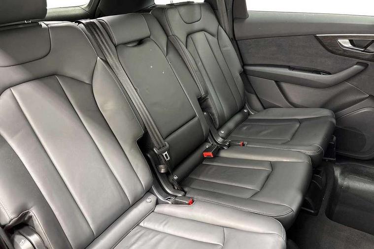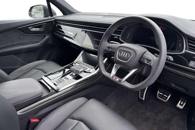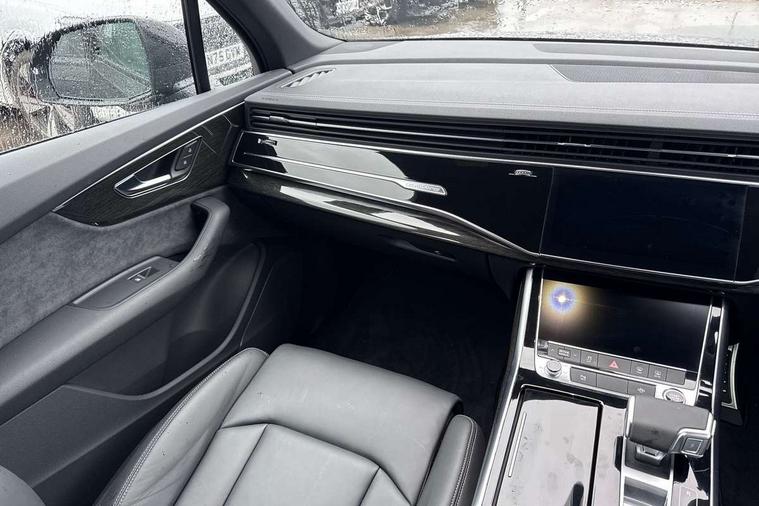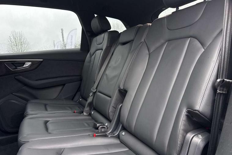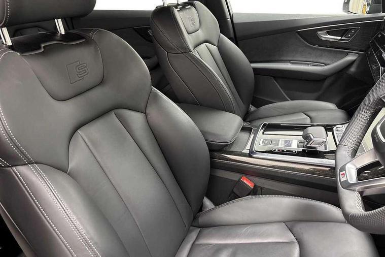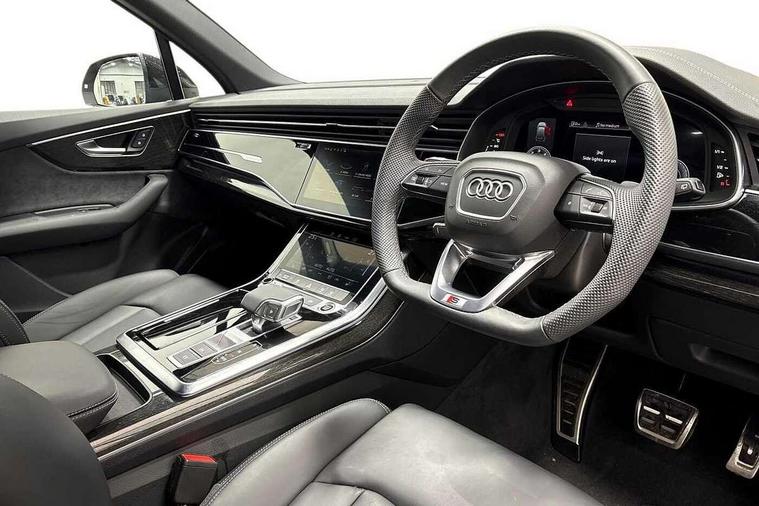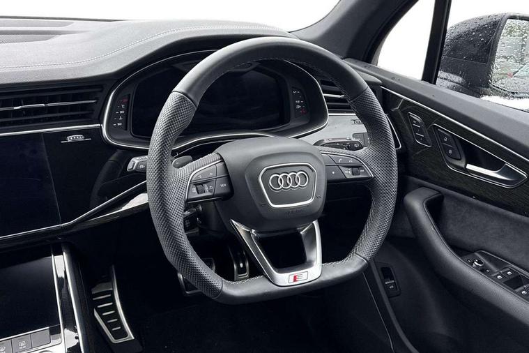 Audi connect safety and service (e-call), Audi connect with Amazon Alexa Integration, Audi drive select (Auto, Comfort, Dynamic, Efficiency, Individual, Off-road and All road), Audi phone box light with wireless charging, Audi virtual cockpit - 12.3" high-resolution LCD display with fully customisable instrument cluster, Bluetooth interface, Camera based traffic sign recognition, Electromechanical power steering, MMI navigation plus with MMI touch screens includes 10.1" and 8.6" screens with haptic feedback, Natural voice recognition, Operating buttons in Matte black, Parking system plus with 360 degree display (front, rear and side sensors) - acoustic and visual park assist system, Power operated tailgate, Rear view camera, Smartphone interface includes wireless Apple carplay/Android Auto, Start/stop system, 48V Mild hybrid technology, Adaptive air sports suspension, Quattro all wheel drive with self locking centre differential, Audi music interface - front 2 USB-C ports with charger and data functions, Audi sound system with 6 channel amplifier, 180 watt amplifying capacity and 10 loudspeakers including subwoofer, DAB digital radio module, Audi Beam uses LEDs to project S emblem with red rhombus onto the ground when opening the side doors (front/rear), Auto dimming frameless rear view mirror, Black exhausts, Black roof rails, Electrically adj heated/folding + automatically dimming exterior mirrors with memory + automatic kerb side function for passenger side exterior mirror, Heat insulating glass in windshield, Integrated LED indications in door mirrors, LED 3rd brake light, LED daytime running lights, LED rear tail lights, Loading edge protection in stainless steel, Matrix LED headlights with dynamic front and rear indicators, Privacy glass - dark tinted rear and rear side windows from B-pillar backwards, Rear side wing doors, Rear wiper, 2 seat bench in 3rd row, 2 zone automatic climate control, 3 seat bench in 2nd row, 7 seat layout with ISOFIX points for the front passenger seat and rear passenger seat, Black cloth headlining, Comfort front centre armrest, Electric adjustable front seat with 4 way lumbar support, driver memory functionality, Folding rear seats, Front head restraints, Front/rear floor mats, Heated front seats, Illuminated door sill trims with S logo, ISOFIX child seat mounting for front passenger seat and 2 outer rear seats with top tether child seat mounting for all 3 rear seats, LED interior ambient lighting, Luggage compartment cover, Luggage compartment sill protection in stainless steel, Rear head restraints, Single front passenger seat, Stainless steel pedals, Sunvisors with illuminated vanity mirrors, Black styling pack plus - Q7, 3 point seatbelts on all rear seats, Audi pre sense front, Child locks on rear doors, Convenience key with safelock and gesture tailgate, Driver and front passenger, front side and curtain airbags, Electromechanical parking brake, Electronic Stabilisation Control (ESC) including ABS, ASR and EDL, Extended pedestrian protection measures, Hill hold assist, Seatbelt reminder, Tyre pressure loss indicator, Warning triangle and first aid kit, Anti theft alarm with tow away protection, Anti-theft wheel bolts and wheel loosening detection, Keyless Go, Remote central locking, Polished oak trim with grey finish inlay, Tool kit, Tyre repair kit,