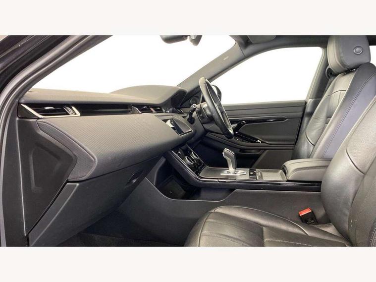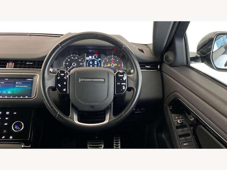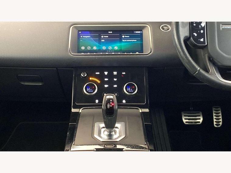Android Auto, Apple car play, Bluetooth connectivity, Brake pad wear indicator warning light, Driver condition monitor, Electronic power assisted steering (EPAS), InControl remote, Land Rover InControl apps, Lane keep assist, Navigation pro system, Pro services and wifi hotspot, Push button starter, Smart settings, Traffic sign recognition with adaptive speed limiter, Voice control system, All terrain progress control, Efficient Driveline, Passive suspension, Terrain Response 2 Auto, Digital Audio Broadcast radio-DAB, Steering wheel mounted controls, Electric windows with one touch open/close and anti trap, Evoque and R-Dynamic badge, Flush deployable exterior door handles, Heated rear window with timer, Heated washer jets, Heated windscreen, Rain sensing windscreen wipers, Rear fog lights, Shadow atlas bonnet and tailgate script, Tailgate spoiler, 40:20:40 split folding rear seats, Black gearshift paddles, Bright metal pedals, Isofix system on outer rear seats, Overhead lighting console, Overhead stowage for sunglasses, Passive front head restraints, Rear air vents, Rear centre headrest, Sunvisors with illuminated vanity mirrors, Twin front cupholders with cover, Twin sliding front centre armrest, Two zone climate control, Anti-lock braking system (ABS), Customer configurable autolock, DSC - Dynamic Stability Control, Electronic brake force distribution, Electronic parking brake, Electronic traction control, Front and rear seatbelt reminder, Hill descent control, Hill launch assist, Low traction launch, Power operated child locks, Roll stability control, Six airbags - Driver and passenger airbags/driver knee airbag/front side airbag and curtain airbags, Torque vectoring brake, Tyre pressure monitoring system, Alarm, Immobiliser, Intrusion sensor, Locking wheel nuts,