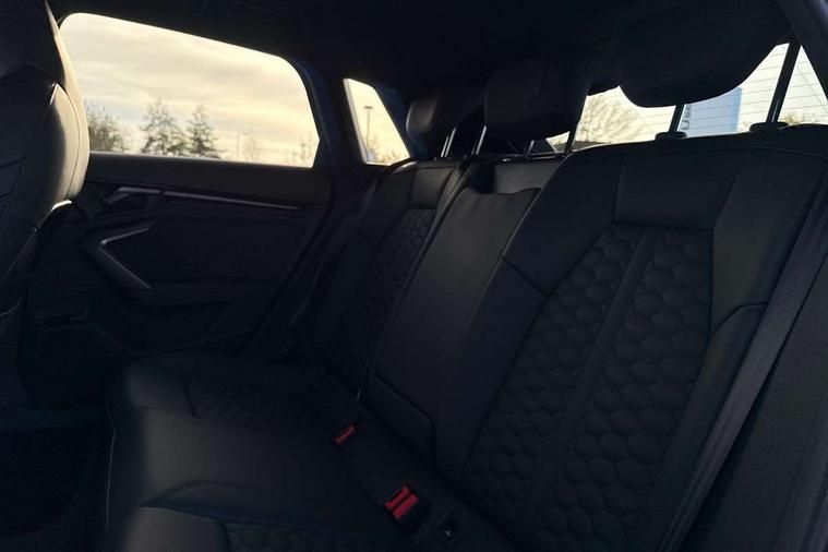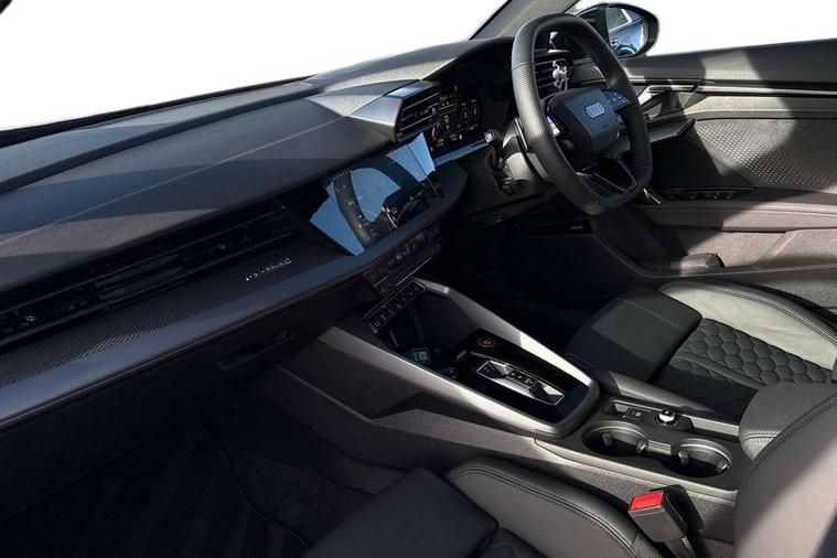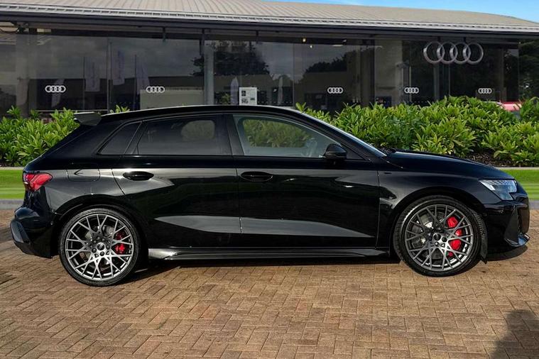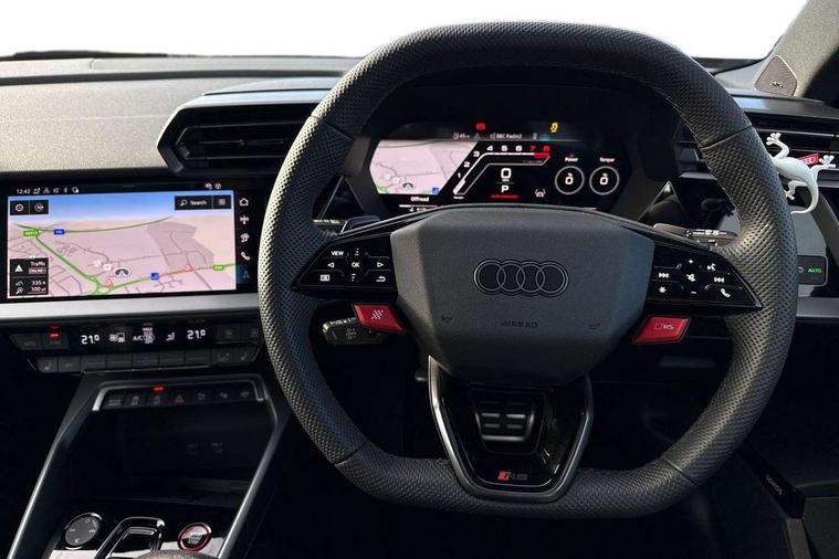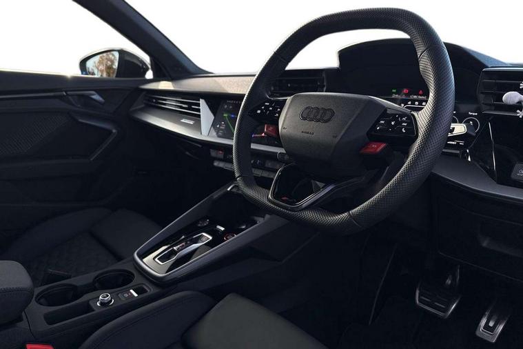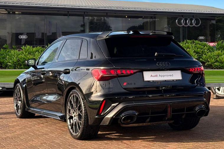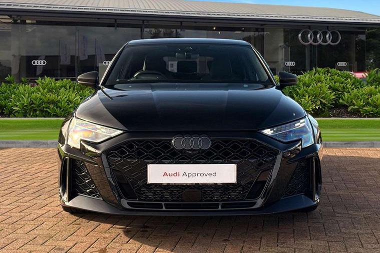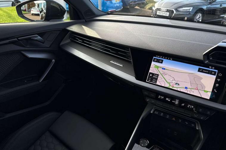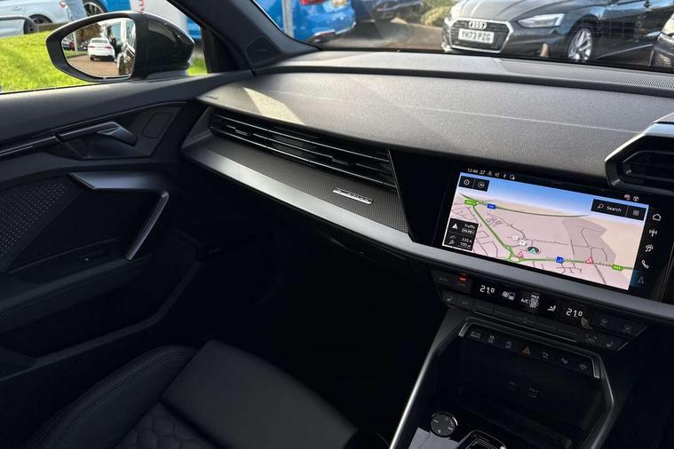 Adjustable speed limiter, Audi drive select comfort, auto, dynamic and efficiency, Audi smartphone interface with app store includes wireless Apple carplay, Android auto and Amazon alexa integration, Audi virtual cockpit plus with RS specific design and 12.3" display with additional graphic display options, Automatic start/stop system with recuperation, Bluetooth interface, Camera based traffic sign recognition, Collision avoidance assistant, Distraction and Fatigue warning, e-Call (emergency call), Lane departure warning system, MMI Navigation Plus with high resolution 10.1" colour touch screen display, Park Assist with parking system Plus, Progressive steering, RS specific driving modes - RS Individual, RS Performance and RS Torque rear, Voice control system with natural language interaction, Quattro permanent four wheel drive, Audi Phonebox light with wireless charging, DAB Digital radio, USB ports with charging function in the rear, All weather light, Audi beam LED projection of RS logo on ground as you exit, Audi darkened matrix LED headlights with dynamic light sequencing and dynamic indicator, Auto dimming frameless rear view mirror, Automatic dynamic range control, Carbon door mirror housings, Carbon fibre engine cover, Dipped beam, main beam, position light and turning light, Dynamic RS specific light sequencing of the coming home and leaving home function, Electrically adjustable/heated/folding/auto dimming door mirrors with integrated LED indications + kerb view function for passenger side, Exterior model badging, Front electric windows, Headlight cleaning system, Heat insulating glass windscreen, Intersection light, LED 3rd brake light, LED brake lights, LED rear lights with dynamic light sequencing and dynamic indicator, LED rear number plate lights, LED reverse light, LED tail lights, Light and rain sensors, Manoeuvring light, Motorway light, Privacy glass - dark tinted rear window, rear door and side windows, Rear electric windows, Rear side wing doors, Rear wiper, Roof edge spoiler in carbon, RS dual branch exhaust system with two chrome plated oval tailpipe trims, Static Cornering lights, Visually upgraded RS specific daytime running light choice of 4 digital signature in chequered flag design within the headlight, 12V socket and storage compartment in front centre console, 3 seat bench in 2nd row, 3 Spoke flat top and bottomed black leather multi function steering and gear shift paddles, 3-zone deluxe automatic air conditioning, 40/20/40 split folding rear seat bench, Black cloth headlining, Black front and rear floor mats, Front and rear headrests, Front centre armrest, Front door sill trims with RS 3 logo, Front sports seats RS embossed logo, Heated front seats, Height and reach adjustable steering wheel, Manual boot compartment lid, Manually adjustable front seats, Rear centre armrest with cupholder, Seat side bolsters, Single front passenger seat, Stainless steel pedals and front footrest in black, Vanadium look - Interior door handles, Door trim, power latching, Air vents, window controls, mirror adjust, rear door lock, Selector lever in centre console, Black Styling plus package - RS3, Extended ambient lighting package Pro with Multi-coloured contour lighting of instrument panel - RS3, RS exterior features pack in carbon and gloss black - RS3, RS sport suspension pack - RS3, Storage package - RS3 Sportback, Technology package without speed limiter - RS3, 3x3 point rear seat belts, Driver and front passenger airbag with passenger airbag deactivation, Electronic Stabilisation Control (ESC) including ABS, ASR and EDL, First aid kit with warning triangle and 2 safety vests, Hill hold assist, Pre-sense front with pedestrian and cyclist detection, RS steel brakes, Seatbelt monitoring, Tyre pressure loss indicator, Anti theft alarm, Anti-theft wheel bolts, Electronically operated child locks, Immobiliser, Remote central locking with safelock, Black dashboard, Inlays in carbon atlas structure, 19" 10 cross spoke silk matt grey alloy wheels, Tyre repair kit,