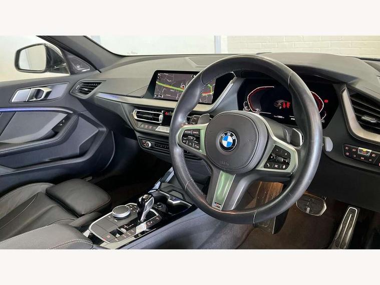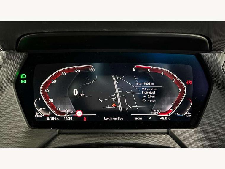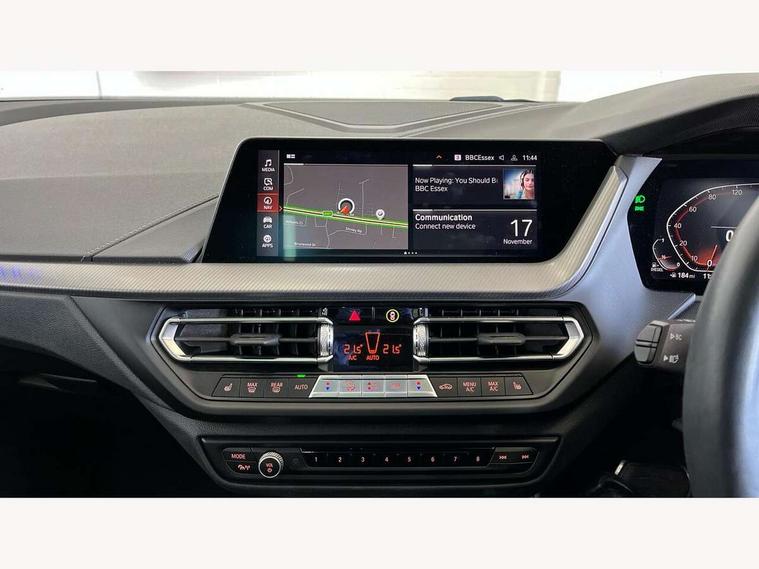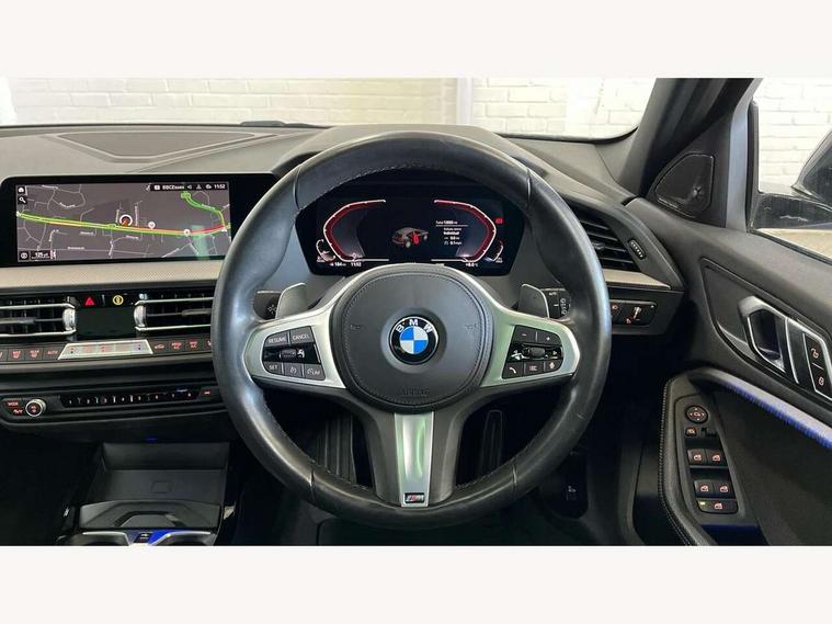 Active guard plus, Attentiveness assist, BMW ConnectedDrive online services, BMW Teleservices, Characteristic map controlled oil pump system, Check Control warning system for monitoring of lights and door/luggage compartment open warning, Cruise control with brake assist, Eco pro mode, Front axle single joint with specific axle kinematics to minimise drive influences on steering + provide increased rigidity agile driving behaviour, Integrated owners handbook, Lane departure warning system, Oil sensor for level and grade, On board computer, Optimum shift indicator, Personal Profile, Pull away assistant, Rigidly mounted rear subframe - Multi link construction with separate spring / damper configuration and excellent driving characteristics, Speed limit Info including no-overtaking indicator, Speed limiter, AdBlue tank, Aluminium lightweight construction, Anti roll bar front and rear, Balancer shaft, Diesel particulate filter, DOHC valve train with two overhead camshafts, Drive Performance Control, Eight speed sport automatic transmission with gearshift paddle switches, Electronic differential lock, Single turbo charger with variable vane geometry, Twin tube gas filled shock absorbers with degressive characteristic curve, Two-stage charging, DAB Digital radio, Auto dimming rear view mirror, Automatic headlight beam throw control, Automatic windscreen wipers and automatic headlight, Body colour door handles, Body colour mirror caps, Body colour roof trims, Chrome 'M' logo side designation, Chrome exhaust twin tailpipes round 90mm in left and right split, Chrome kidney grille frame with Satin Aluminium struts, Direction indicator side lights in exterior mirrors, Fading support, Folding side mirrors with auto dimming/folding wing mirrors with auto dimming, Follow me home headlights, Front and rear bumper system with replaceable deformation elements, Front and rear electric windows with open and close fingertip control, anti trap facility and comfort closing, Front door sill finishers in black plastic with M designation in metallic look, Green tinted heat protection glazing, Heated, electrically adjustable exterior mirror aspheric on driver side, convex on passenger side, High gloss shadowline window frame, Recess cover mirror frames and B/C pillar embelisher trim, High level third brake light, Integrated front windscreen with washer jets, LED daytime running lights, LED eyebrow turn indicators, LED front fog lights, LED Headlights, Lightweight engineering, Matt black air guide grilles, Matt black wheel arch trim, Model designation on electric bootlid, Nearside reverse light in rear light cluster, Preparation for high beam assistant, Rear fog lights, Rear side wing doors, Rear window wiper, Shark fin antenna, Trailer stabilisation logic, Visible VIN plate, Welcome lighting, 12V power socket in front centre console with blanking plug, 3 rear seat head restraints, 3 seat bench in 2nd row, 3 spoke sports leather steering wheel with black leather and stitching, pearl chrome decorative finish, specific M Badge, Anthracite headlining, Black boot net with lashing eyes, Cargo function on 2nd seat row, Child seat ISOFIX attachment for two outer rear seats and front passenger seat with anchorage points, Conditioned based service, Driver and front passenger seat heating, Folding rear clothes hook, Four grab handles integrated in roof lining, Front and rear door pockets with bottle holders, Front and rear side armrest integrated into door trim, Front armrest, Front sports seats, Glove compartment, Height adjustable front head restraints, Luggage compartment for bag hooks on left and right, foldable luggage compartment liner and four lashing eyelets, Manual adjust steering wheel, Multi-function controls for steering wheel, Single front passenger seat, Storage compartment in centre console, Sun visors with vanity mirrors and insert tab, Two front centre console cupholders, Two zone automatic air conditioning, Velour floor mats, Additional interior lighting pack - 1 Series, BMW live cockpit professional pack- 1 Series, Connected pack professional - 1 Series, Interior lights pack - 1 Series, M Sport exterior styling aerodynamics pack - 1 Series, 2 tone horn, 3 point seatbelts on all seats, front pyrotechnic belt tensioners, stopper and belt force limiters, rear coded belt buckles, Airbags - Front driver/passenger, front and rear curtain head protection, front side, manual deactivation of front passenger airbag, Anti lock braking system (ABS) with brake assist, BMW emergency call, Brake drying, Braking readiness, Child proof locking system in rear door, City braking function, Comfort modes, Cornering brake control, Crash sensor activating central locking release, hazard warning lights, fuel cut off, interior lighting + activation of safety battery terminal clamp, Driver and front passenger seat belt security check, Dynamic stability control + (DSC+), Dynamic Traction Control - DTC, Electrically operated hand brake including automatic hold function, Front and rear disc brakes, Seatbelt warning, Side impact protection, Tyre pressure monitoring system, Warning triangle and first aid kit, Central locking switch for all doors, fuel filler cap and luggage compartment, Deadlocking function system to all doors, Drive away locking system on all doors and luggage compartment, Incorrect fuel protection system, Locking wheel bolts, Remote control with integrated key with High-gloss Black inlay and M designation and 1 button for open/ close lock, window, open luggage compartment, Start/stop button illuminated in centre console with keyless engine start and auto start stop deactivation button, Thatcham Cat.1 alarm and immobiliser, Wheel slip limitation close to the actuator (ARB), Contrast stitching on instrument panel, Electrically powered 12V compressor, Reduced rolling resistance tyres,
