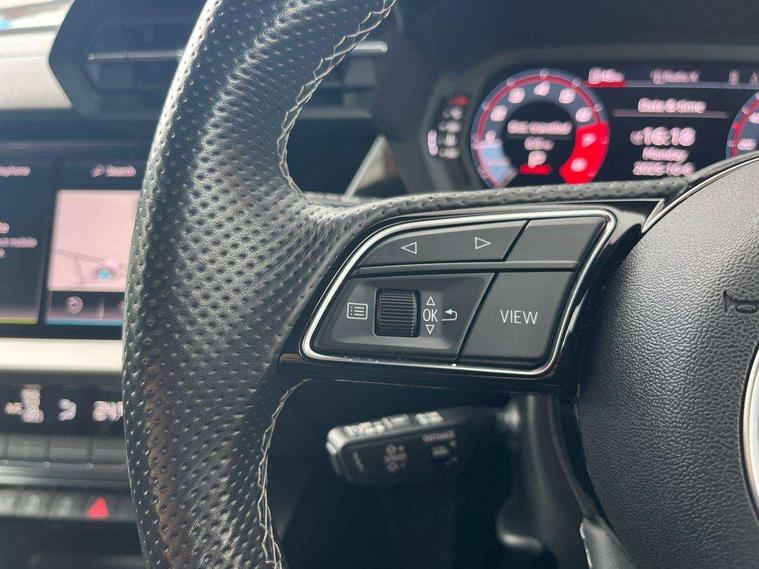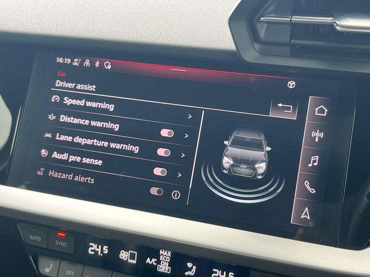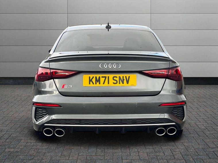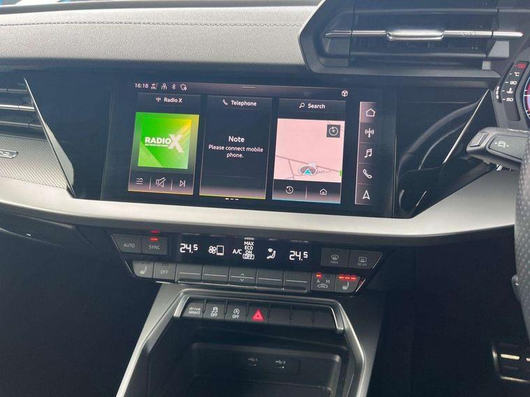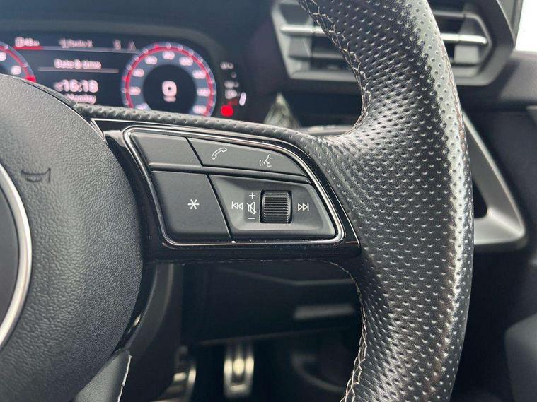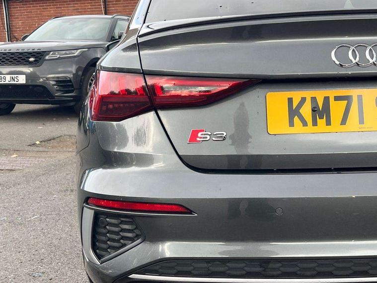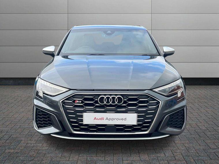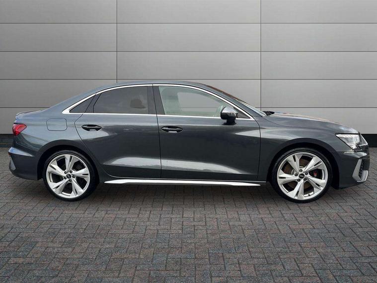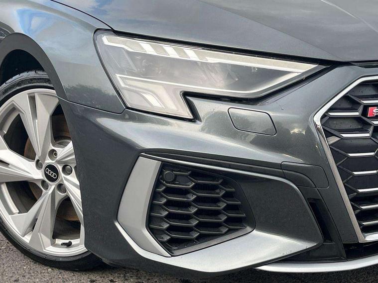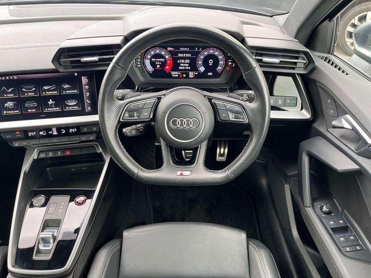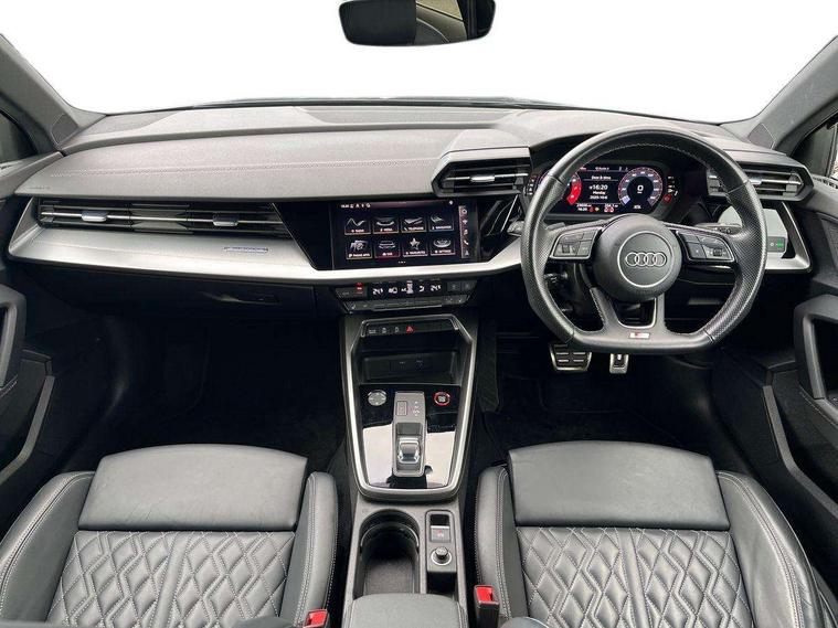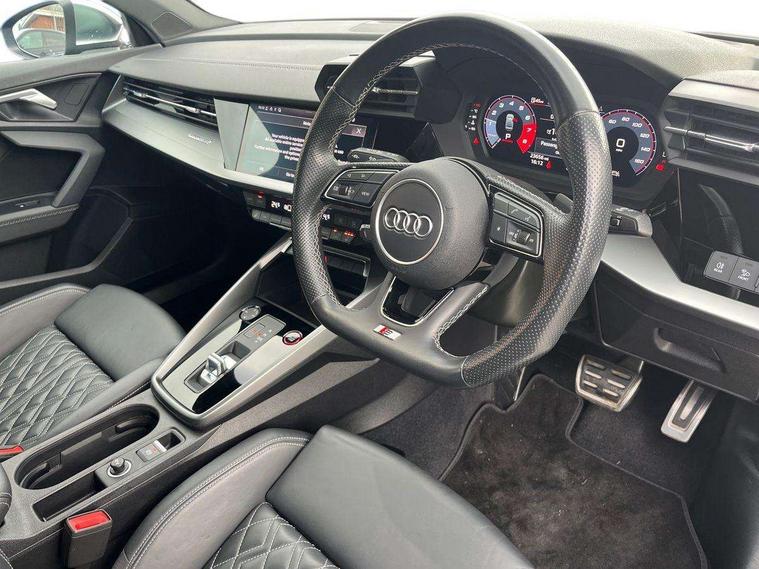 Audi connect emergency call and service, Audi drive select (Auto, Comfort, Dynamic, Efficiency and Individual), Audi smartphone interface, Audi Virtual Cockpit - 10.25" digital and colour instrument cluster, Automatic start/stop system with recuperation, Bluetooth interface, Collision avoidance assistant, Lane departure warning system, MMI Navigation Plus with high resolution 10.1" colour touch screen display, Progressive steering, Service indicator, Voice control system with natural language interaction, Quattro permanent all wheel drive, S sport suspension with spring damper adjustment and lowering by 15mm, 2x USB Type C ports (for charging and data transfer), 6 passive loudspeakers, CD player, DAB Digital radio, 3rd brake light, Acoustic glass windscreen, Audi Beam uses LEDs to project the Audi logo onto the ground as you exit your S3, Auto dimming frameless rear view mirror, Electrically adjustable/heated/folding/dimming door mirrors with kerb view includes integrated LED indications + kerb view function for passenger side, Front electric windows, Headlight washers, Illuminated door sills with aluminium inserts at the front with S logo, LED daytime running lights, LED headlights with LED rear lights and dynamic rear indicators, Light and rain sensors, Model and engine designation badges at rear, Privacy glass - dark tinted rear window, rear door and side windows, Rear electric windows, 12V socket and storage compartment in front centre console, 40/20/40 split folding rear seat bench with cupholder, Black cloth headlining, Dual zone electronic climate control, Front and rear centre armrest in leather, Front and rear headrests, Front/rear floor mats, Heated front seats, Height and reach adjustable steering wheel, Interior lighting - glove compartment light and right hand side, Luggage compartment floor covering, Seat side bolsters, Stainless steel pedals and front footrest in black, Body styling design pack - S3, Storage pack - A3/S3 Saloon, 3x3 point rear seat belts, Driver and front passenger airbag with passenger airbag deactivation, Electronic Stabilisation Control (ESC) including ABS, ASR and EDL, First aid kit with warning triangle and 2 safety vests, Front side airbags with head airbags and interaction airbag, Hill hold assist, Pre-sense front with pedestrian and cyclist detection, Seatbelt monitoring, Tyre pressure loss indicator, Anti theft alarm, Anti-theft wheel bolts, Electronically operated child lock, Immobiliser, Remote control central locking, Aluminium air vent surrounds, Aluminium trim elements, Dark spectrum aluminium inlays, accent surfaces in the dashboard and centre console in platinum grey silk effect paint finish,