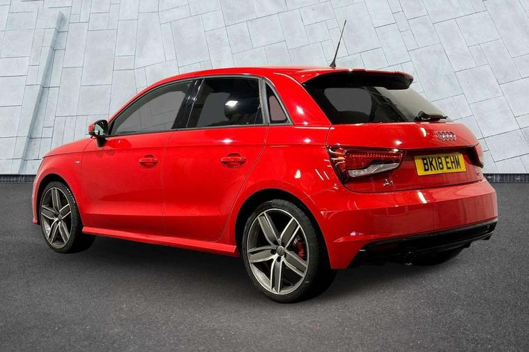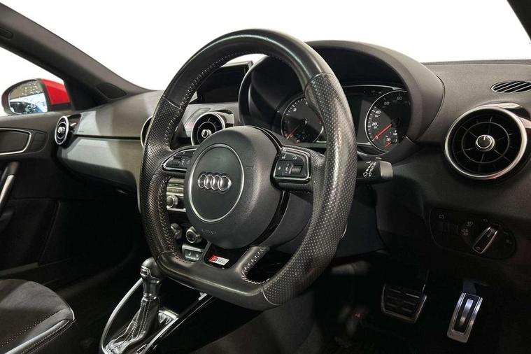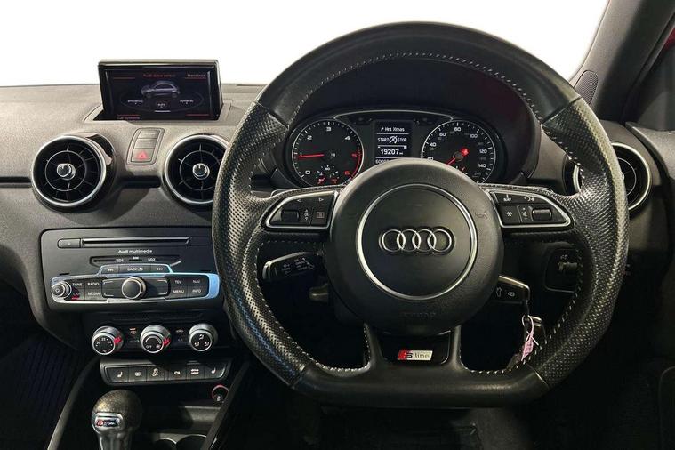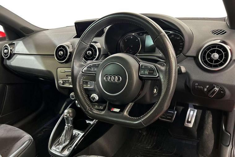 Audi drive select, Cruise control, Driver's information system, Electro-mechanical PAS, Low washer fluid indicator, Service interval indicator, Voice control system, Additional SD card reader, Audi music interface, Bluetooth audio streaming, DAB Digital radio, Adaptive brake lights, Body coloured bumpers, Body coloured door mirrors, Electric adjustable door mirrors, Electric front windows, Electric rear windows, Front fog lights, Heat insulating glass, Heated door mirrors, Heated rear windscreen, Privacy glass, Rain and light sensors, Rear diffuser, Rear wiper, Roof spoiler, S Line body styling, Twin oval high gloss black exhaust tail pipes, Xenon plus headlights including automatic headlights, LED daytime running lights, LED rear lights, dynamic range control and headlight washers, 12V Accessory socket in centre console, 3 rear seats, 3 spoke flat bottom multi-function leather steering wheel including paddle shift, Adjustable rear head restraints, Alcantara/leather upholstery, Black cloth headlining, Cupholders in centre console, Door sills trims with aluminium inlays, Electronic climate control (ECC), Front floor mats, Front head restraints, Front sports seats, Height adjustable front seats, Isofix attachments on outer rear seats, Jack and tool kit, Leather gear knob, Leather handbrake, Lumbar adjustment for front seats, Rake/reach adjustable steering wheel, Split folding rear seats, Stainless steel pedals, High-gloss black styling pack - A1, 3x3 point rear seatbelts, ABS/EBD, Brake assist function, Driver and passenger side airbags, Driver/Front Passenger airbags, EDL, ESP with ASR, First aid kit, Front and rear seatbelt reminder, Front passenger airbag deactivation, Head airbags, Height adjustable front seatbelts, Tyre pressure monitor, Warning triangle, Locking wheel bolts, Remote central locking with 2 remote folding keys, Thatcham category 1 alarm + immobiliser, Aluminium trim, High gloss black air vent sleeves, High gloss black centre console, Tyre repair kit,