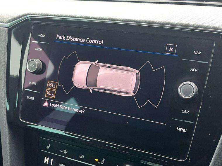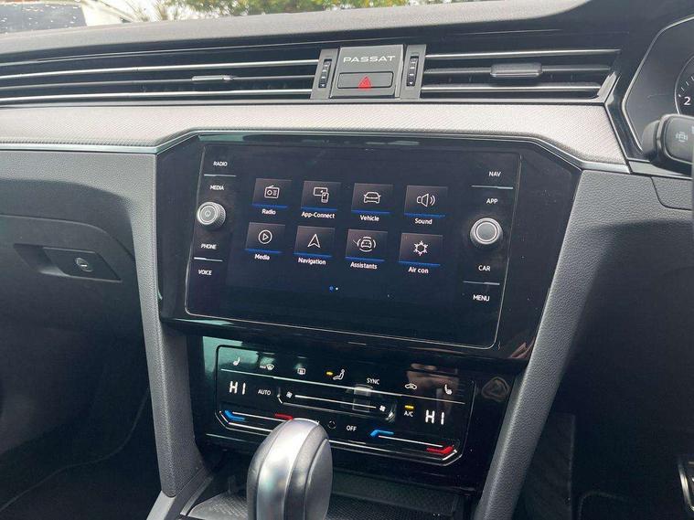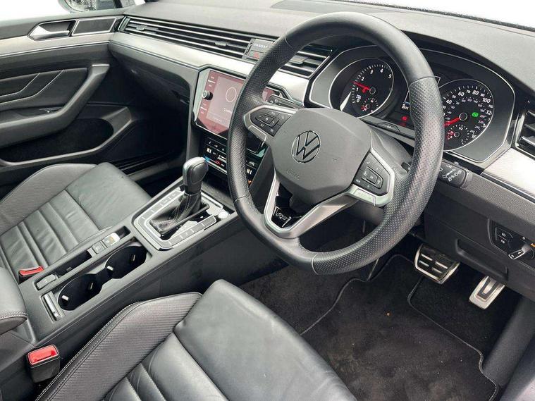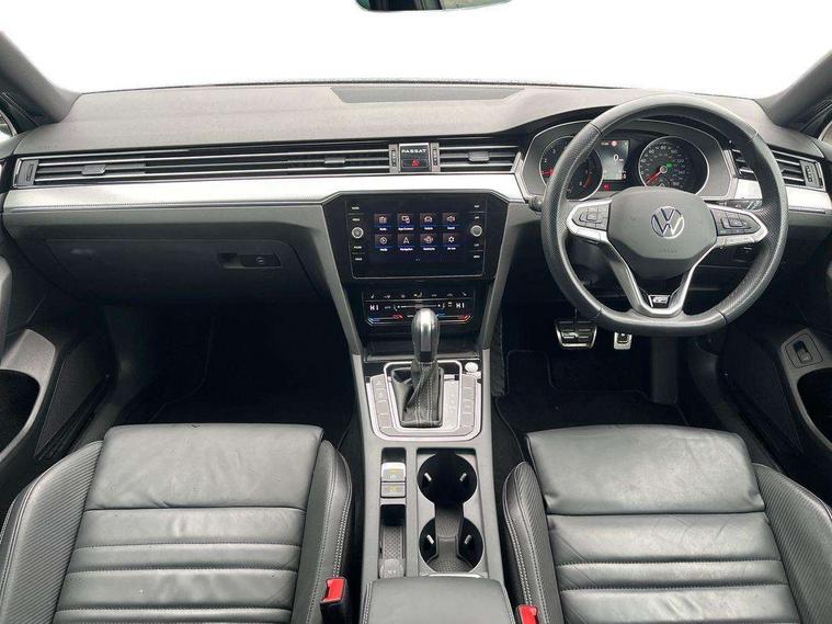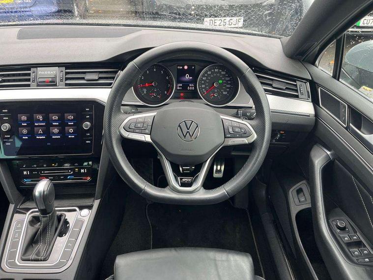 Adaptive cruise control including Front Assist, radar sensor controlled distance monitoring system, City emergency braking system, Driver alert system, Driver profile selection, Exterior temperature gauge with frost alarm, Lane assist, Low washer fluid warning light, Multifunction computer includes visual gear, One touch indicator turn signal, Proactive occupant protection, Security and service including e-call, Speed sensitive power steering, Speedo and rev counter, electronic odometer, trip, service interval display and fuel gauge, Start/Stop function, Traffic jam assist, Warning buzzer and light for front seatbelts unfastened, We connect plus, Battery regeneration during braking, Misfuel prevention device, Petrol Particulate Filter, Aerial for radio integrated into rear windscreen, DAB Digital radio receiver, External, USB type C data sockets with increased charging performance front (45 Watt), Auto dimming interior rear view mirror, Automatic headlights with dusk sensor, Automatic leaving home and manual coming home lighting functions, Black radiator grille with chrome louvres, Body colour bumpers, Body colour door handles, Body coloured door mirrors with integrated indicators, Chrome side window surrounds, Electric heated windscreen washer jets, Front and rear electric windows, Fully galvanised body, Gloss black finish on B pillar, Heated rear window, LED rear lights, LED rear number plate lights, LED third brake light, Plastic load sill protection, Rain sensor, Rear side wing doors, Rear tinted glass from B pillar backwards, approx 65% tinted, Rear window wash/wipe, Remote electrically adjustable and foldable heated door mirrors including automatic dimming function on drivers side door mirror puddle lights, Silver anodised roof rails, Warning lights for open tailgate and doors, White instrument lighting, Windscreen wipers/ intermittent wipe + 4 position delay, 12V socket in front centre console, 12V socket in luggage compartment, 3 seat bench in 2nd row, 40:20:40 split folding rear seat backrests, Carbon optic side bolsters, Climate control - 3 Zone electronic air conditioning with automatic air recirculation, Driver's door storage compartment for 1.0 litre bottle, Extending luggage compartment cover with convenience opening, stowable, Front and rear interior lighting with delay and dimming function, Front centre armrest with storage compartment and two rear air vents, Front cupholders x2 with covers, Front passenger storage compartment for 1.5 litre bottle, Front seats with embroidered R Line logo on backrest, Height adjustable and removable variable boot floor, Height adjustable rear seat head restraints (x3), Height/reach adjust steering wheel, Illuminated vanity mirrors, Isofix child seat preparation, outer rear seats, Load lashing points x 4 in luggage compartment, Load through provision, Lockable, illuminated, cooled glovebox, Luggage compartment lighting, Nappa leather upholstery, Rear seat centre armrest with storage compartment, Single front passenger seat, Stainless steel pedals, Storage compartment in rear doors, Storage compartment in roof console with cover, Unique R Line door sill protectors, Unique R Line front and rear carpet mats, Easy open package with full electric tailgate/ boot - Passat (Estate), R line styling pack - Passat (Estate), 3x3 point rear seatbelts, ABS (Anti locking brake system) includes BAS (Brake assist) and EBD (Electronic brake pressure distribution), Automatic post collision braking, Disc brakes front and rear, Door open warning reflectors, Driver/Front Passenger airbags, Drivers and front passengers safety optimised head restraints, longitudinal and height adjustable, Drivers knee airbag, Electronic parking brake with auto hold, First aid kit and warning triange with 2 face masks, Front and rear passenger curtain airbags, Front passenger airbag deactivation switch, Front side impact airbag, Height adjustable front 3 point seatbelts + pretensioners, Hill hold function, Pre crash preventive occupant protection, Rear door child safety locks, Rear seat side impact airbags, Rigid safety cell with front and rear crumple zones, Tyre pressure loss indicator, Volkswagen roadside assistance, Warning light for rear seat belts if unfastened, Alarm with interior protection and deactivation via infotainment system, Electronic engine immobiliser, Locking wheel nuts, Remote central locking, Chrome air vent and instrument surround, Unique R Line dark diamond flag decorative inserts in dash and door panels,