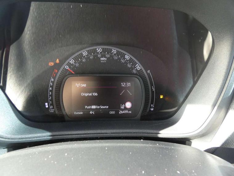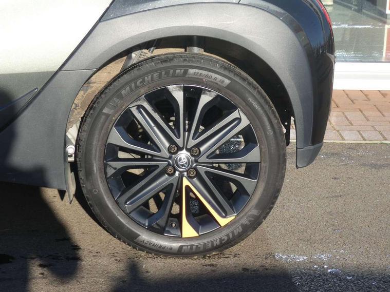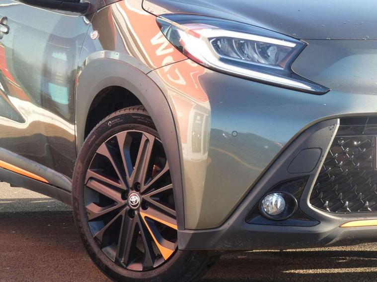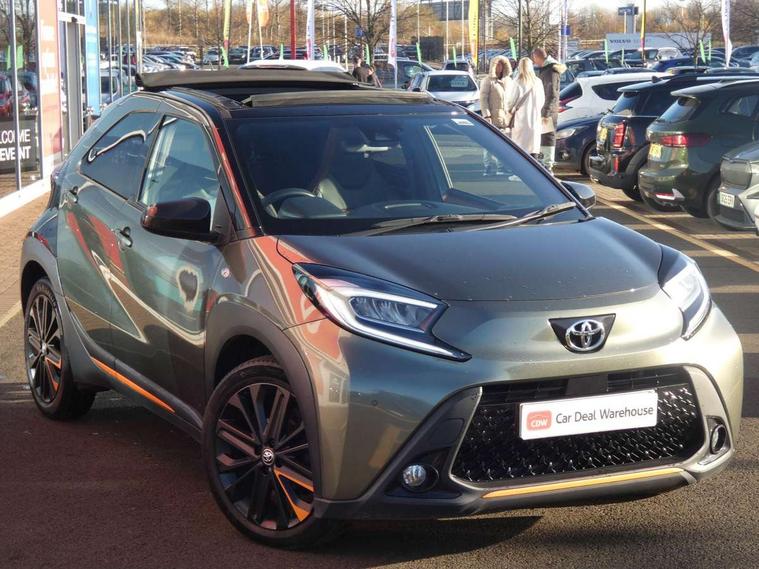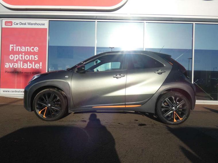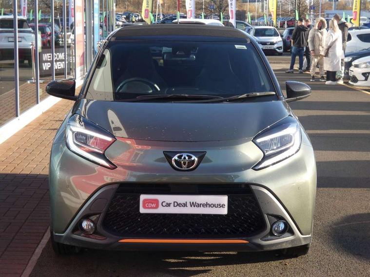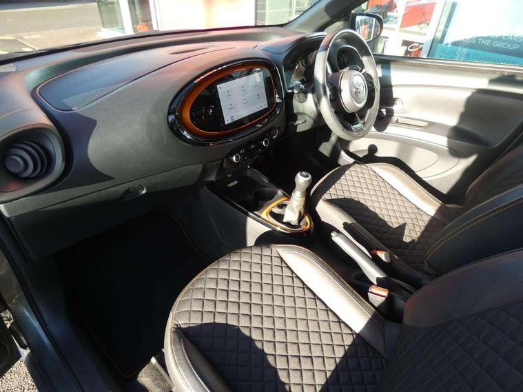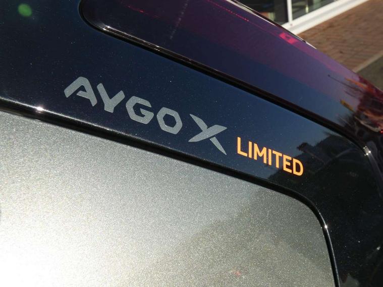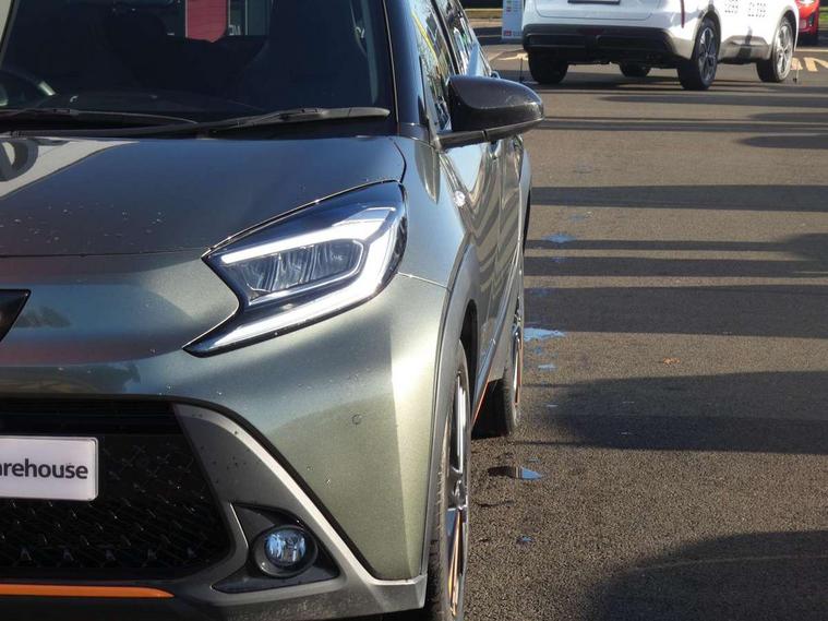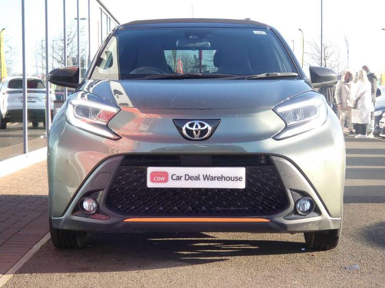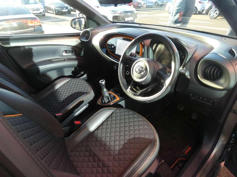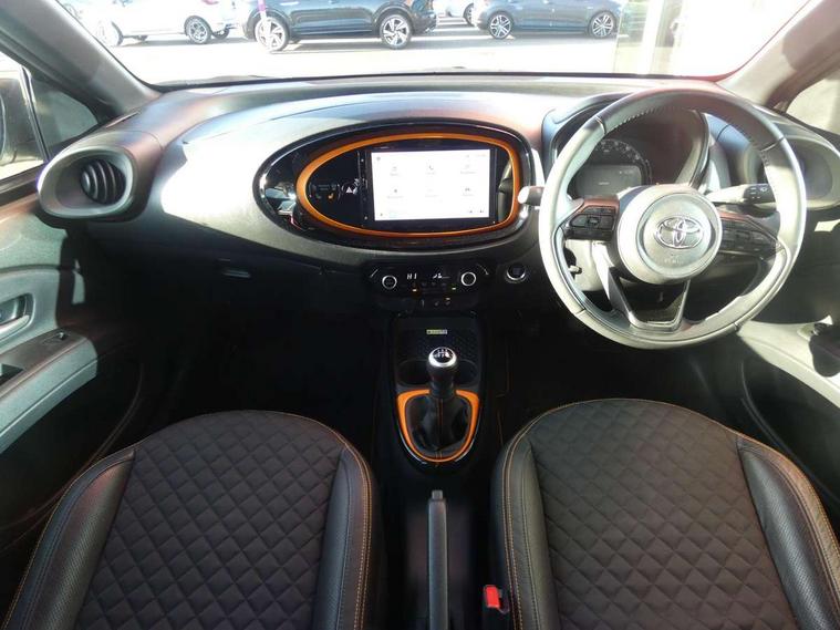 4.2" TFT colour screen, Adjustable speed limiter, Analogue speedometer, Bluetooth connectivity, Digital tachograph, Driver attention alert system, eCall emergency call system, Electric power steering, Front and rear parking sensors with auto brake, Intersection turn assist, Key reminder warning, Noise reduction kit, Pre collision system with emergency steering assist, Remote boot door release on key, Reversing camera with static guide lines, Smart entry and push button start, Speed limit display, Start and stop, Wireless charger, Wireless Smartphone Integration includes Apple CarPlay and Android auto, Vehicle Stability Control (VSC), 4 speakers, 9" HD multimedia display touch screen with Toyota smart connect, DAB digital audio broadcast, USB connector, Auto headlights, Auto wipers, Automatic headlights cut-off, Automatic high beam On/Off switch, Bicycle towing hook, Black fog light surrounds, Black side protection mouldings, Black wheel arch mouldings, Body colour door handles, Body coloured front bumper, Boot door scuff plate, Canvas roof, Eclipse black rear bumper, Electric heated door mirrors, Follow me home headlights, Front fog lights, Front power windows, Gloss black door mirrors, Gloss black upper front grille, Headlight cut-off reminder, LED daytime running lights guide, LED front light guide, LED High mounted stop lamp, LED projector headlights, Limited edition logo on C pillar, Magnolia strip on lower front and rear bumpers, Manual day/night rear view mirror, Manual headlight levelling, Metallic Bi-tone paint, Power adjustable door mirrors, Privacy glass, Rain sensor, Rear combination lights LED bulb type, Rear side wing doors, Rear windscreen defogger, Rear windscreen wiper, Remote hazard lights system, Short antenna, Variable intermittent windscreen wipers, 12v power outlet - front, 2 seat bench in 2nd row, 3 spoke leather steering wheel, 50/50 split folding rear seat, Adjustable speed limiter switch on steering wheel, Audio and telephone switches on steering wheel, Auto air conditioning, Black insert on steering wheel, Black roof lining, Boot light, Canvas top headlining, Centre room light, Chrome interior door handles, Chrome surround on air conditioning buttons, Clean air filter, Driver and front passenger heated seats, Floor mats, Front and rear cup holders, Front head rest deco art, Front head restraints, Height adjustable driver seat, Intelligent adaptive cruise control switch on steering wheel, ISOFIX child restraint system on rear seats, Lane departure alert switch on steering wheel, Leather gearshift knob, Light blue ambient lighting in centre console, Manual tilt steering wheel, Manually reclining and sliding driver seat, Manually reclining and sliding front passenger seat, Multimedia switches on steering wheel, Partial leather seats, Pollen filter, Rear door pockets, Rear head restraints, Satin silver insert on gear shift knob, Single compartment glovebox with lights, Single front passenger seat, Soft tonneau cover, Sun visors with mirror on driver and passenger side, Voice recognition switch on steering wheel, Toyota safety sense pack - Aygo X, Anti lock braking system + Electronic brake force distribution, Child safety door lock, Emergency brake light signal (EBS), Hill start assist control (HAC), Passenger airbag on/off switch, Seat belt reminder for front and rear seats, Supplement restraints system (SRS) - 6 airbags, Traction control, Tyre pressure warning system, Immobiliser, Remote power door locks, Black wheel centre caps, Mandarina Orange wheel insert, Tyre repair kit,