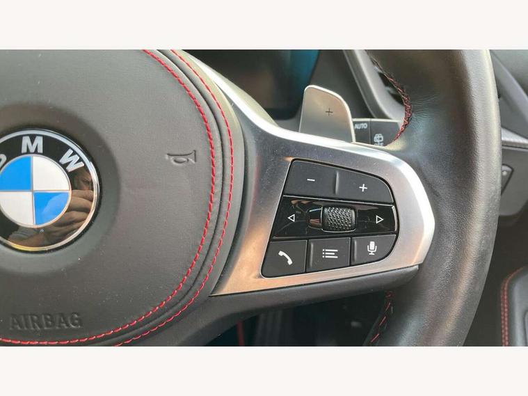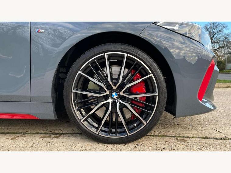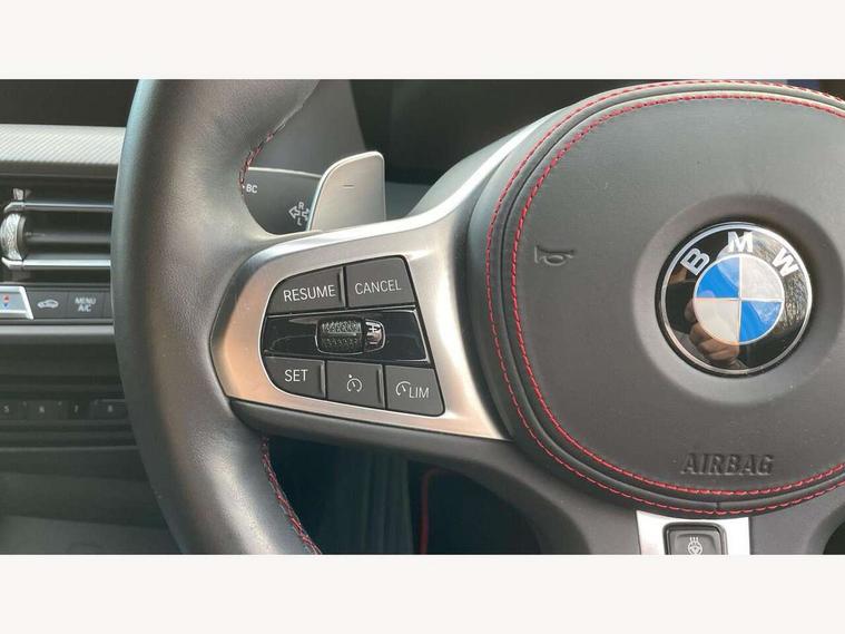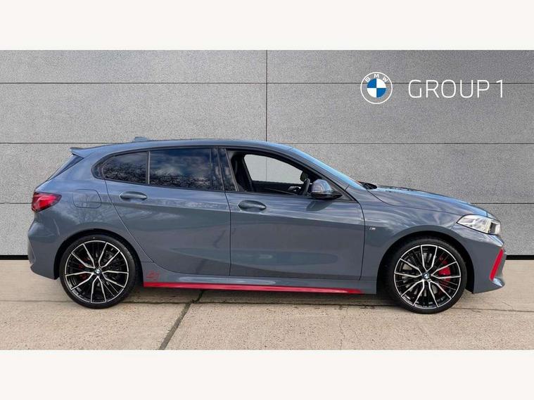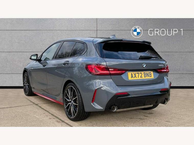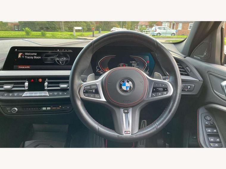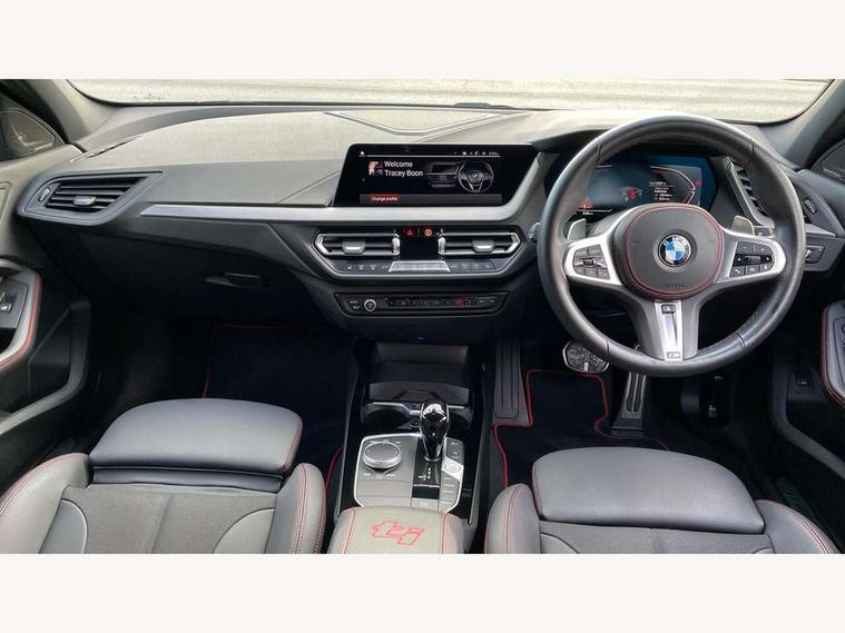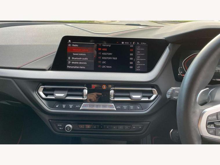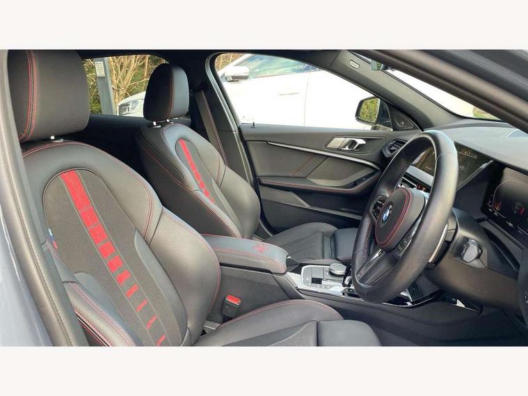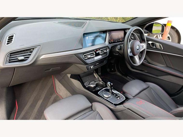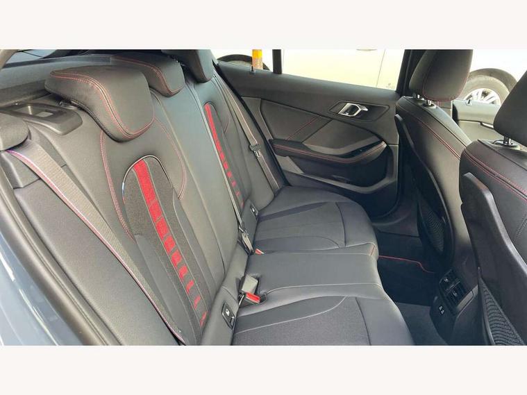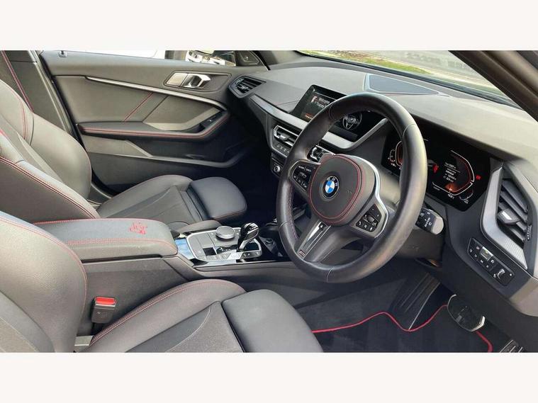 Active guard plus, Attentiveness assist, BMW ConnectedDrive online services, BMW Teleservices, Check Control warning system for monitoring of lights and door/luggage compartment open warning, Cruise control with brake assist, Eco pro mode, Electric power steering with Servotronic steering optimised at all speed ranges, Front axle single joint with specific axle kinematics to minimise drive influences on steering + provide increased rigidity agile driving behaviour, Integrated owners handbook, Lane departure warning system, Oil sensor for level and grade, On board computer, Optimum shift indicator, Personal Profile, Pull away assistant, Rigidly mounted rear subframe - Multi link construction with separate spring / damper configuration and excellent driving characteristics, Speed limit Info including no-overtaking indicator, Speed limiter, Aluminium lightweight construction, Anti roll bar front and rear, Balancer shaft, Double VANOS twin scroll turbocharging system, Drive Performance Control, Eight speed sport automatic transmission with gearshift paddle switches, Electronic differential lock, High precision injection, Larger fuel tank capacity (50 litres), M sport suspension with M128i xDrive specific settings, Petrol Particulate Filter, Twin tube gas filled shock absorbers with degressive characteristic curve, VALVETRONIC engine management, DAB Digital radio, Auto dimming rear view mirror, Automatic headlight beam throw control, Automatic windscreen wipers and automatic headlight, Black chrome tailpipe finishers, BMW individual high gloss shadow line with extended content, Body colour door handles, Body colour mirror caps, Body colour roof trims, Chrome 'M' logo side designation, Chrome kidney grille frame with Satin Aluminium struts, Direction indicator side lights in exterior mirrors, Fading support, Folding side mirrors with auto dimming/folding wing mirrors with auto dimming, Follow me home headlights, Front and rear bumper system with replaceable deformation elements, Front and rear electric windows with open and close fingertip control, anti trap facility and comfort closing, Front door sill finishers in black plastic with M designation in metallic look, Green tinted heat protection glazing, Heated, electrically adjustable exterior mirror aspheric on driver side, convex on passenger side, High gloss shadowline window frame, Recess cover mirror frames and B/C pillar embelisher trim, High level third brake light, Integrated front windscreen with washer jets, Kidney frame and struts in high gloss black extended, LED daytime running lights, LED eyebrow turn indicators, LED front fog lights, LED Headlights, Lightweight engineering, Matt black air guide grilles, Matt black wheel arch trim, Model designation on electric bootlid, Nearside reverse light in rear light cluster, Preparation for high beam assistant, Rear fog lights, Rear side wing doors, Rear window wiper, Shark fin antenna, Trailer stabilisation logic, Visible VIN plate, Welcome lighting, 12V power socket in front centre console with blanking plug, 3 rear seat head restraints, 3 seat bench in 2nd row, Anthracite headlining, Black boot net with lashing eyes, Cargo function on 2nd seat row, Centre armrest in black/red highlight including embroidered 'ti' designation in red, Child seat ISOFIX attachment for two outer rear seats and front passenger seat with anchorage points, Conditioned based service, Driver and front passenger seat heating, Floor mats with red binding, Folding rear clothes hook, Four grab handles integrated in roof lining, Front and rear door pockets with bottle holders, Front and rear side armrest integrated into door trim, Front armrest, Front sports seats, Glove compartment, Height adjustable front head restraints, Instrument panel top section , door armrests and door panels in black/red highlight, Luggage compartment for bag hooks on left and right, foldable luggage compartment liner and four lashing eyelets, Manual adjust steering wheel, Multi-function controls for steering wheel, Single front passenger seat, Storage compartment in centre console, Sun visors with vanity mirrors and insert tab, Three spoke M sport design multi function leather steering wheel in unique red stitching, Two front centre console cupholders, Two zone automatic air conditioning, Additional interior lighting pack - 1 Series, BMW live cockpit professional pack- 1 Series, Connected pack professional - 1 Series, Interior lights pack - 1 Series, M Sport exterior styling aerodynamics pack - 1 Series, 2 tone horn, 3 point seatbelts on all seats, front pyrotechnic belt tensioners, stopper and belt force limiters, rear coded belt buckles, Airbags - Front driver/passenger, front and rear curtain head protection, front side, manual deactivation of front passenger airbag, Anti lock braking system (ABS) with brake assist, BMW emergency call, Brake drying, Braking readiness, Child proof locking system in rear door, City braking function, Comfort modes, Cornering brake control, Crash sensor activating central locking release, hazard warning lights, fuel cut off, interior lighting + activation of safety battery terminal clamp, Driver and front passenger seat belt security check, Dynamic stability control + (DSC+), Dynamic Traction Control - DTC, Electrically operated hand brake including automatic hold function, Front and rear disc brakes, M Sport brakes with red calipers, M Sport seatbelts, Seatbelt warning, Side impact protection, Tyre pressure monitoring system, Warning triangle and first aid kit, Central locking switch for all doors, fuel filler cap and luggage compartment, Deadlocking function system to all doors, Drive away locking system on all doors and luggage compartment with de-activated in iDrive settings, Locking wheel bolts, Remote control with integrated key with High-gloss Black inlay and M designation and 1 button for open/ close lock, window, open luggage compartment, Start/stop button illuminated in centre console with keyless e