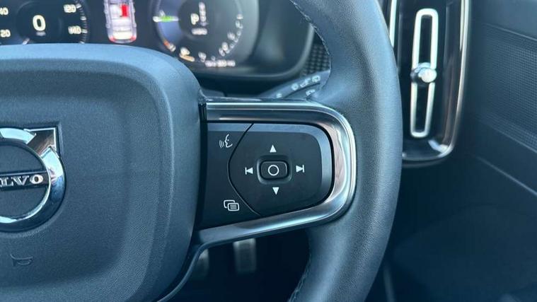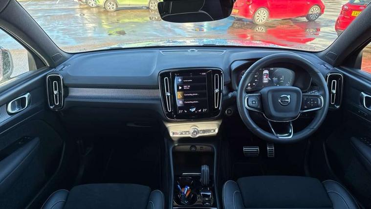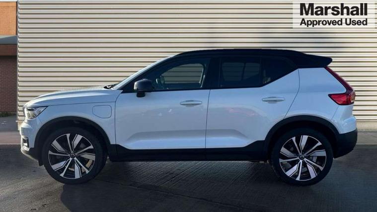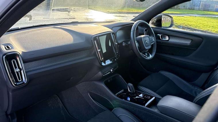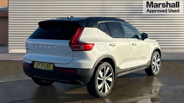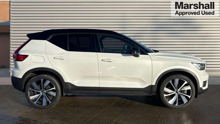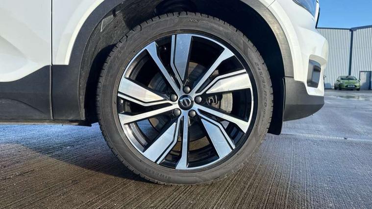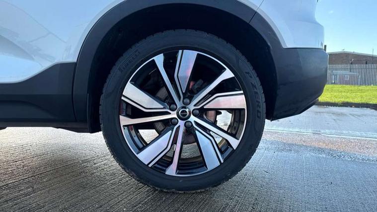 12.3" Active TFT crystal driver's instrument display, 9" centre console portrait touch screen, Adjustable steering wheel force, Bluetooth hands free telephone kit, Drive mode selector, E-call, Lane keep assist with driver alert control, Oncoming Lane Mitigation, Power operated tailgate, Sensus navigation with European mapping and traffic information, Speed limiter, Speed sensitive steering, Voice activated control for key functions, Volvo on call, 7m 10amp charge cable with 3 pin plug and 7m 1 phase 16amp type 2/mode 3 charge cable, Electric front axle drive, Recharging port located in nearside front wing, Sports chassis, DAB Digital radio, Low speed exterior sound speaker, Steering wheel mounted remote controls, Adaptive brake lights with high level LED brake lights, Auto dimming interior mirror, Automatic headlamp levelling, Automatic LED Headlights + Active high beam incorporating daytime running lights, Dark tinted windows for rear door side windows and cargo compartment, Electric adjustable/heated/auto folding door mirrors, Front aluminium tread plates, Front and rear electric windows, Heated front windscreen, High gloss black front and rear skid plate, High gloss black lower front bumper, High gloss black mesh front grille with high gloss black surround, High gloss black sensus surround deco, High gloss black window trim, Home safe and approach lighting, Integrated roof rails in high gloss black, Rain sensor with automatic windscreen wiper activation, Rear side wing doors, Rear wiper, Roof antenna, Roof spoiler, Visible VIN plate, 12V socket in front tunnel console and luggage compartment, 2 zone electronic climate control and rear air vent, 3 seat bench in 2nd row, 60/40 versatile split folding rear seat, A-pillar parking ticket holder, Bright metal luggage threshold, Centre console cupholders and storage, Charcoal headlining, Front footwell illumination, Front headrests, Front reading light and theatre lighting, Front seat cushion extensions, Glovebox bag hook, Heated front seats, Height/reach adjustable steering column, Height/tilt adjustable driver's seat, High gloss centre tunnel deco, Illuminated glovebox, Illuminated luggage compartment, Illuminated vanity mirrors, Isofix attachments on outer rear seats, Leather gearknob, Load protection net, Multi directional lumbar support, Power driver seat with memory + exterior mirrors memory, Rear armrest / integral cup holders / storage tray, Rear coat hook, Single front passenger seat, Sports floor mats, Sports pedals, Sports tailored steering wheel, Underfloor cargo storage, Vanity mirror with ticket holder, Lighting pack - XC40, 3x3 point rear seatbelts, City safety includes pedestrian, cyclist and large animal detection and front collision warning with full auto brake, Drivers knee airbag, Dual stage driver/passenger airbags, Electronic parking brake with auto hold, First aid kit, Front and outer rear seatbelt reminder and pretensioners, Front seats SIPS airbags, Hill descent control, Hill start assist, Inflatable curtain, Passenger airbag cut-off device, Road sign information display, Run off Road Mitigation, Run off Road Protection, SIPS (Side Impact Protection System), Slippery road and hazard light alert, Stability and Traction Control with Spin control, Engine Drag Control and Corner Traction Control, Tyre pressure monitoring system, Vehicle deceleration control with Anti-lock Brake System, Electronic Brake Distribution and Emergency Brake Assist, Warning triangle, WHIPS whiplash protection system - front, Anti-theft alarm including immobiliser/volume sensor + level sensor, Care key with user defined top speed, Key integrated remote control central locking + fuel flap with deadlocking system and auto open/close power windows, Locking wheel nuts, Private locking for tailgate, Cutting edge aluminium inlay, Lower dashboard, tunnel console and door panel in charcoal, 20'' 5 double spoke diamond cut/high gloss black alloy wheels,
