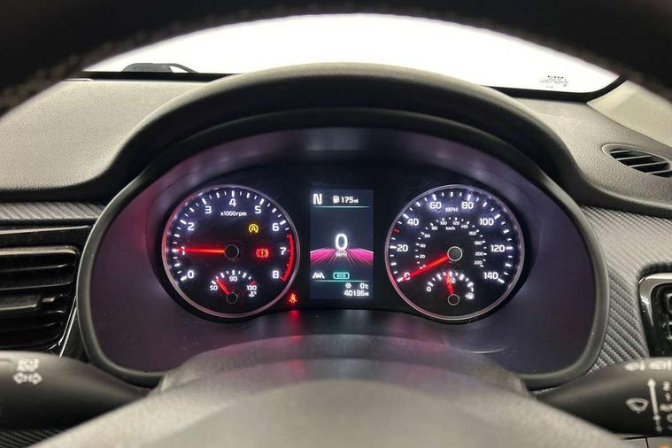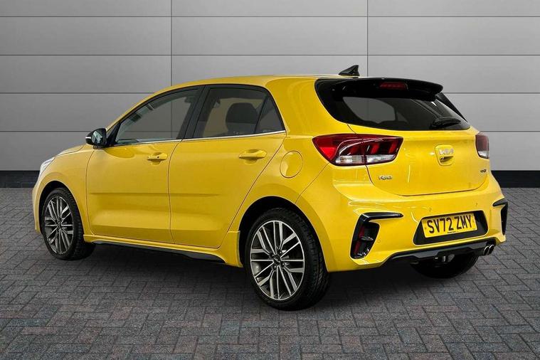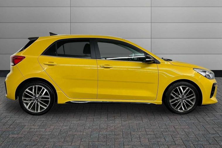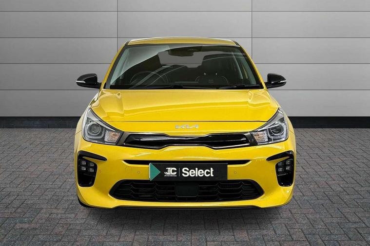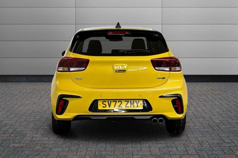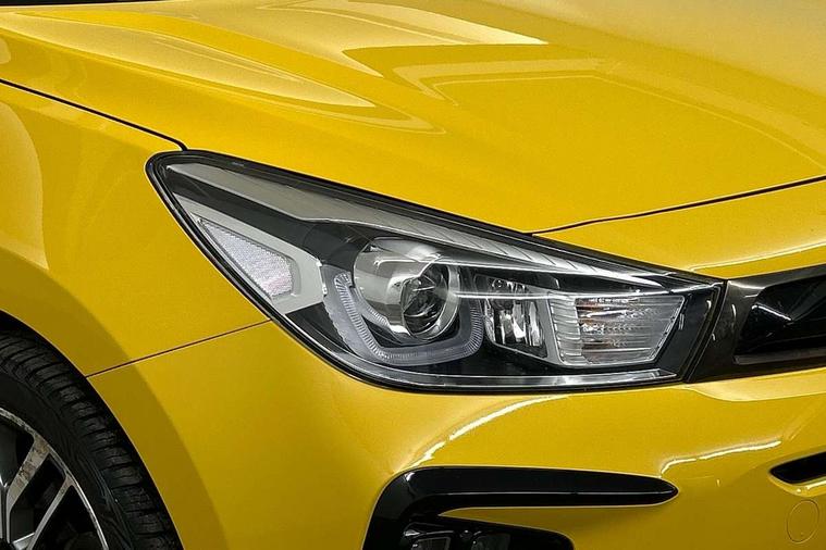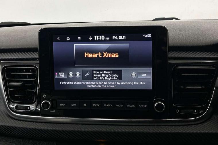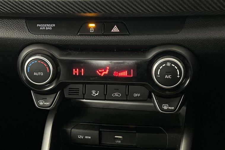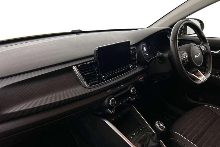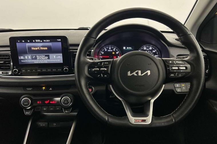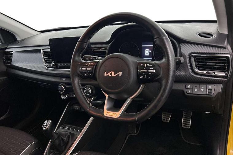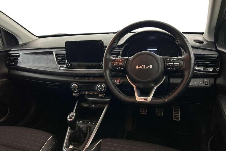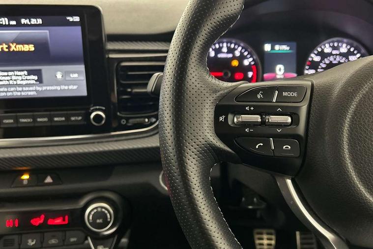 8" touchscreen navigation, Apple car play/Android Auto, Blind spot collision warning, Cruise control + speed limiter, Digital clock, Drive mode selector, Electric power steering, Emergency call service, Emergency stop signalling system, Front parking sensor, Gear selection indicator, Kia Connect (UVO), Manual speed limit assist (MLSA), Outside temperature display, Rear parking sensor, Reversing camera system with dynamic guidelines (Integrated into centre fascia screen), Tachometer, Tailgate, Trip computer, Voice control system, Windscreen washer level indicator, Intelligent Stop and Go, 6 speakers, Bluetooth connectivity including audio streaming, DAB Digital radio, Front USB port for media connection, Rear USB port, Steering wheel mounted audio controls, Aeroblade-type front wipers, Auto dimming rear view mirror, Automatic defog system, Automatic lighting control, Bi-function projection headlights, Body colour door handles, Chrome side window trim, Cornering light, Electric adjustable/heated/folding door mirrors, Front electric windows with driver's auto up/down function, Gloss black and dark chrome surround radiator grille, Headlamp levelling, Heated rear window, High gloss black door mirrors, High Gloss Black rear spoiler, LED "Ice-Cube" Front Fog Lights, LED daytime running lights, LED indicators in door mirrors, LED rear fog light, LED third brake light, Privacy glass (Rear Windows and Tailgate), Rain sensing front wipers, Rear electric windows, Rear side wing doors, Rear wash/wipe, Speed variable front wipers, Sports front bumper, Sports rear bumper, Tinted glass, Twin exhaust pipes, Welcome home function, 3 passenger assist grips, 3 seat bench in 2nd row, 60/40 split/folding 2nd row of seats, All round height adjustable headrests, Automatic air conditioning, Centre Console with Storage Box and Sliding Armrest, Cloth/faux leather upholstery with grey stitching, Dash illumination dimmer switch, Driver's seat height adjuster, Driver/passenger sunvisors and illuminated vanity mirrors, Front and rear door map pockets with bottle holder, Front passenger seatback pockets, Front USB charger port and 12V socket, Heated front seats, Heated steering wheel, ISOFIX top tethers and lower anchor points, Leather D cut steering wheel, Leather trimmed gearshift, Load area light, Luggage area parcel shelf, Luggage hooks, Metal pedals, Overhead console with sunglasses holder, Satin chrome interior door handles, Single front passenger seat, Tilt/telescopic adjustable steering wheel, Advanced driving assistance pack - Rio, 3-point front seatbelts, 3x3 point rear seatbelts, ABS with Electronic Brakeforce Distribution (EBD) and Brake Assist System (BAS), Automatic unlocking of doors in case of impact, Cornering brake control (CBC) and Straight line stability (SLS), Electronic stability control (ESC) and vehicle stability management (VSM), Front seatbelt pretensioners + load limiters, Height adjustable front seatbelt anchors, Hill start assist control (HAC), Passenger airbag deactivate switch, Rear child proof door locks, Seatbelt warning, Traction control, Twin curtain airbags, Twin front airbags, Twin front side airbags, Tyre pressure monitoring system, Anti theft alarm, Deadlocking system, Engine immobiliser, Locking wheel nuts, Smart key with engine start/stop button, Speed sensitive auto door locking, Visible vehicle identification number, Carbon Fascia Trim, 17" Alloy wheels, Tyre mobility system,