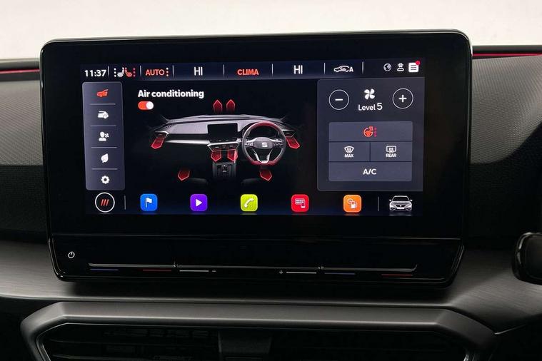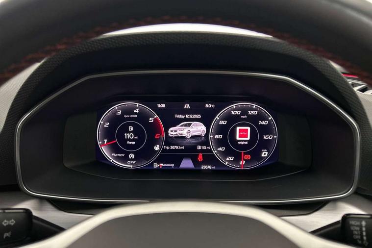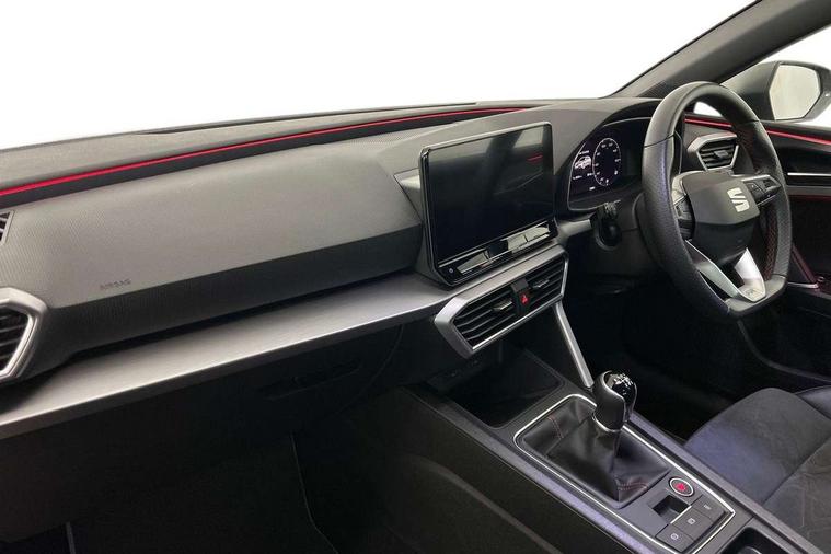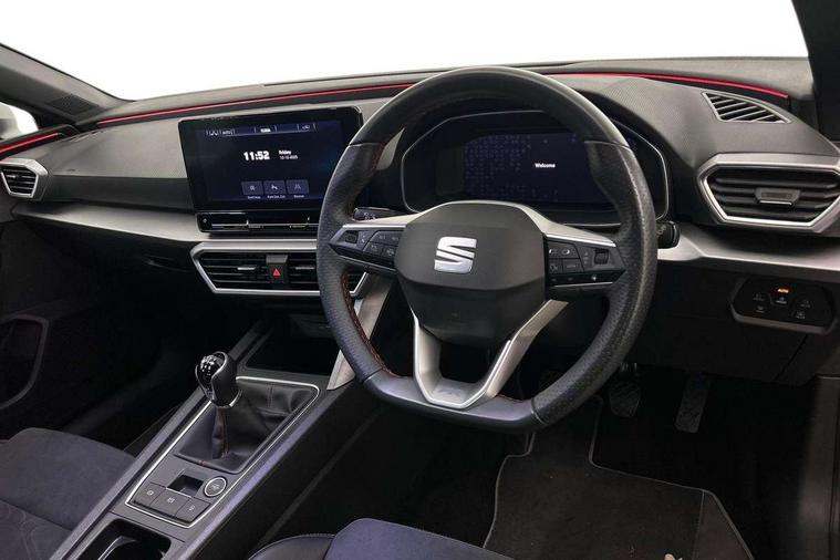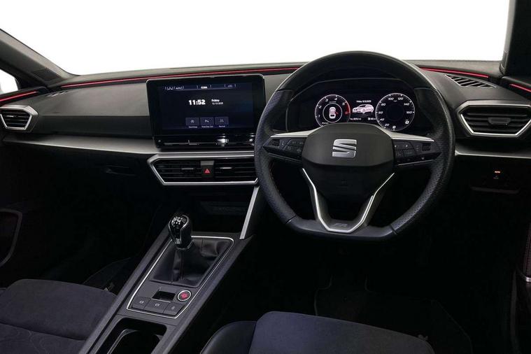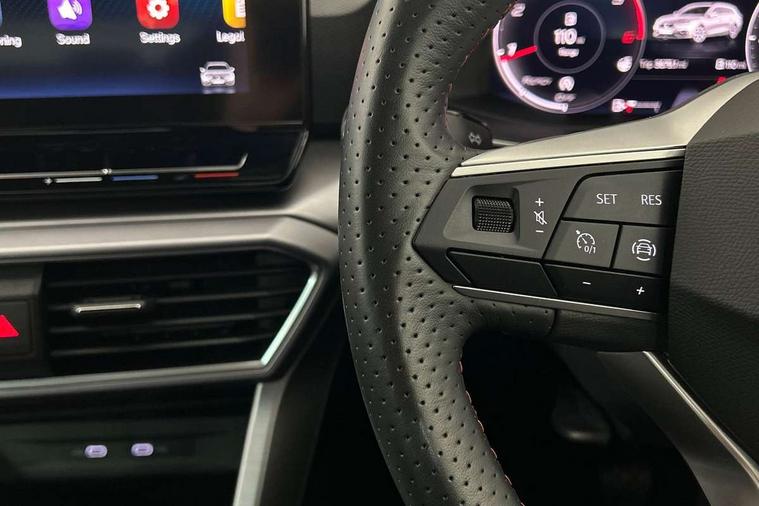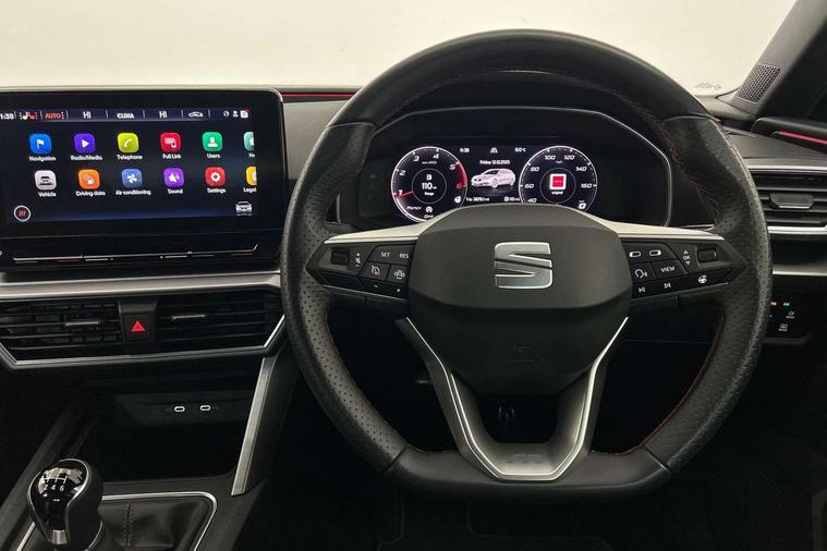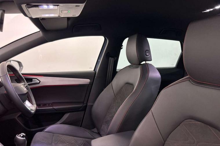 Digital cockpit, E-call, Four x USB Type C ports, Front assist with forward collision warning braking reaction to vehicles, pedestrians and cyclists, Full link smartphone integration with Mirror Link, wireless Apple CarPlay and wired Google Android Auto, Lane assist, Lockable tailgate, Park assist (inc front/rear parking sensors), Power assisted speed sensitive electro-mechanical steering, RPM, trip computer, outside temp gauge, instrument light brightness, low fuel warning light, lights on reminder, gearshift indicator, SEAT drive profile with 4 modes (Eco/Normal/Sport/Individual), throttle response, Service interval indicator, Start/stop system with regenerative braking, Sports suspension, XDS electronic differential lock and dynamic traction support, 7 speakers, Auxiliary input socket, Auto dimming rear view mirror, Body colour door handles, Body coloured bumpers, Dark tinted rear windows, Door mirror LED indicator lights, Electric adjustable/heated/folding door mirrors with memory, Electric front/rear windows, FR sports bumper, Illuminated front door sill, LED front fog lamps with cornering function, LED headlights and tail lights with dynamic turn signals, welcome light silhouette from exterior mirrors and dynamic headlight range control, LED rear fog lamp, Matt black roof rails, Rain sensing wipers, Rear side wing doors, Rear wash/wipe, Separate daytime running light with automatic headlight control and coming home feature, Third brake light, 12V Accessory socket in the load area, 12v power point in centre console, 3 seat bench in 2nd row, 60/40 split rear bench seat with armrest, Ambient lighting with glovebox, footwell and single monocolour, Black headlining, Dust/pollen filter, Electric driver lumbar support + passenger manual lumbar support, Front and rear height adjustable headrests, Front and rear reading lights X 4, Front centre armrest, Front seatback storage pockets, Heated front seats, Heated leather steering wheel with leather gearstick, Height/reach adjust steering wheel, ISOFIX points in outer rear seats with top tether anchorage points, Luggage tie-down hooks, Microsuede cloth upholstery, Power driver seat with memory and manual height adjustable passenger seat, Single front passenger seat, Sliding boot cover, Sunvisors with covered illuminated mirror, Three zone climate control, Wraparound lighting, Media system plus with navigation - Leon, 3 point seatbelts on all rear seats, ABS, Brake control system - ESC and brake booster, Child proof door locks, Driver and front passenger airbags with front passenger airbag de-activation, front side and curtain airbags, Electronic parking brake, Extended safety system - seat belt tensioner, window closure and hazard lights, Hill hold control, Rear disc brakes, Seat belt reminder for front and rear seats, Tiredness recognition system, driver alert system, Tyre pressure monitoring system, Anti theft alarm system with interior monitoring in cab, backup horn and towing protection, KESSY Go (Keyless start), Locking wheel bolts, Wireless phone charging, Chrome interior detailing, 18" Performance machined alloy wheels with 92Y tyres, Tool kit,