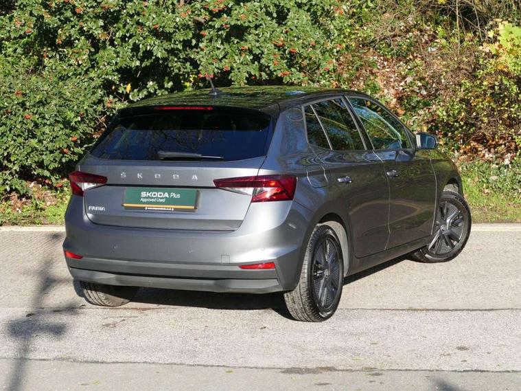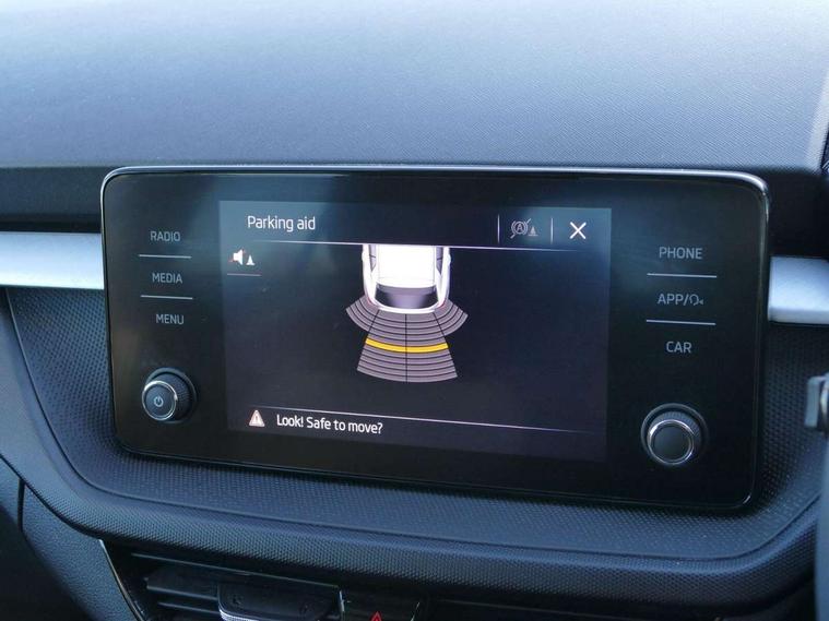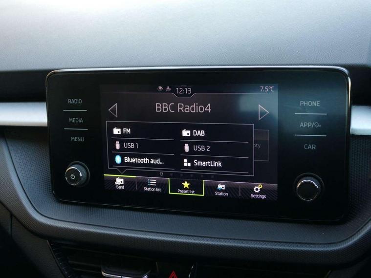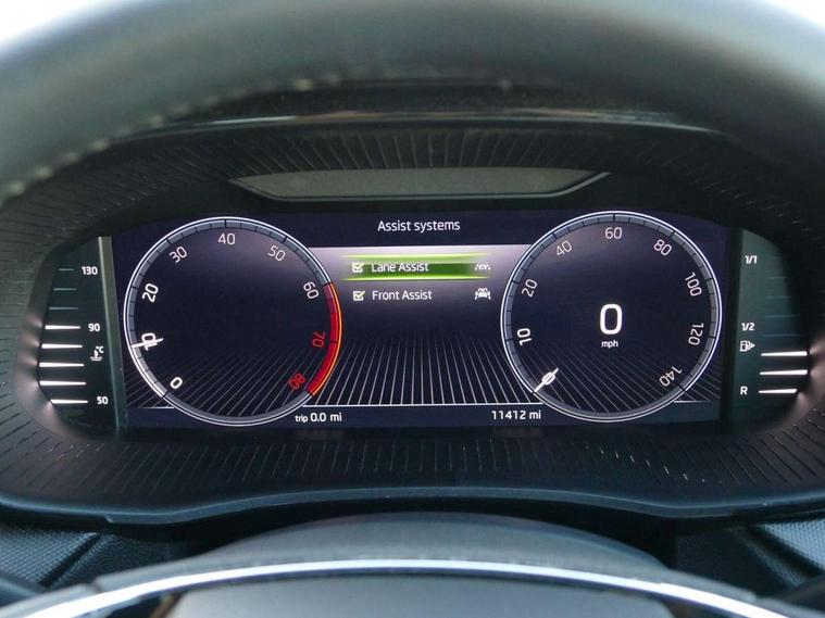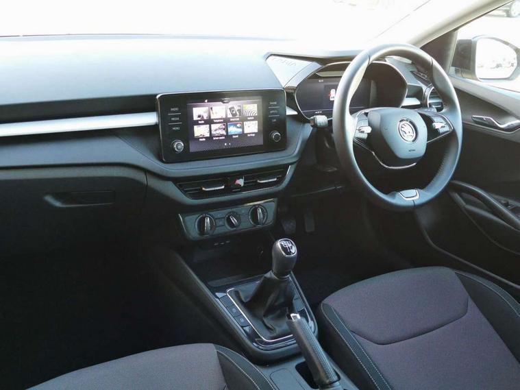 Bluetooth connection, Driver alert system - DAS, Electromechanical power steering, Exterior temperature gauge, Lane assist including road edge detection, Service interval indicator, Virtual cockpit with 10.25" colour display, 2x USB-C in the front (for data transmission and charging), 6 Speakers (4 in front and 2 in rear), Auxiliary socket for external MP3 player, Bolero radio with 8" colour display, DAB digital radio reception, Basic rear lights, Body coloured bumpers, Dimming rear view mirror with black frame, Door mirror integrated indicators, Electrically adjustable and heated door mirrors, Electrically adjustable front windows with function auto up/down, Front window wiper intermittent control, Headlight range control - Automatic, Ice scraper in fuel cap, LED daytime running lights with coming and leaving home feature, Mechanical adjustable rear windows, Privacy glass, Rear LED fog light, Rear side wing doors, Rear window wiper with washing nozzles, Roof mounted spoiler, SKODA tailgate lettering in chrome, Third brake light, 3 rear headrests, Backrest split and folding, Central console with fixed cup holder and storage box, Chrome handbrake release button, Fabric upholstery, Gearshift knob/handle in leather, Grain satin black interior door handles, Hand brake lever handle in leather, Height adjustable front headrests, Height adjustable steering wheel, ISOFIX and TopTether anchorage points to the outer rear seats, ISOFIX and TopTether on the front passenger seat, Luggage compartment lighting, Pollen filter, Rear seat bench unsplit, Single front passenger seat, Storm grey headlining, Sun visors with mirror and airbag label on passenger side, Ticket holder, Umbrella in drivers door, 3-point height adjustable front seats belts with pretensioner and force limiter, Automatic warning lights in case of crash, Driver and passengers airbag with switch off function, e-Call+, ESC including ABS, MSR, ASR, EDS, HBA and XDS, Front and rear seat belt warning, FRONT ASSIST (AEB City and AEB Inter Urban), Front side airbags, Head airbags, One tone horn, Pedestrian protection, Three rear 3-points safety seat belts with pretensioner and force limiter including stop function for outer rear seat belts, Tyre pressure monitoring system, Anti-theft alarm system including immobiliser, interior monitoring, backup horn, and towing protection, Anodized cross line upper decorative trim, Colour Edition air vents, Grain satin black central console cover, Grain satin black lower decorative trim, Satin black door and side trim panel in front, Anti-theft wheel bolts protection, Super-low rolling resistance tyres,