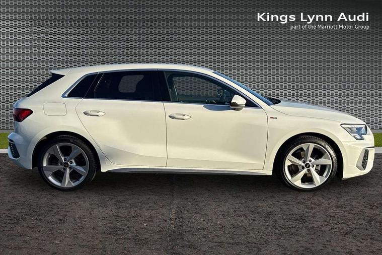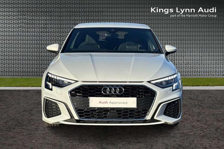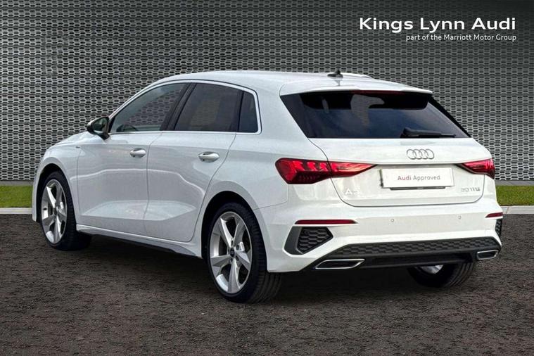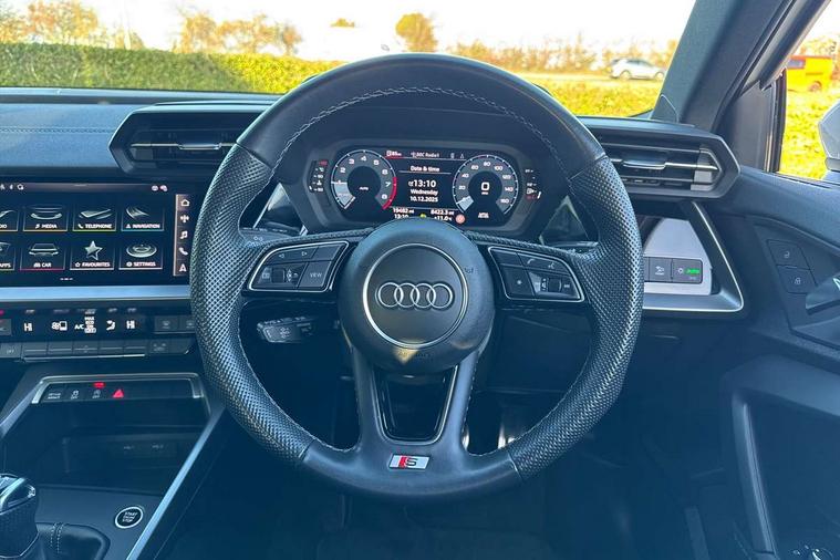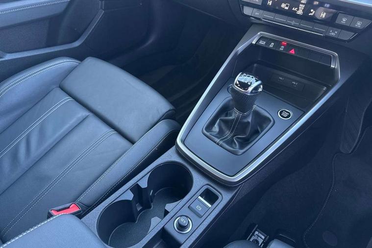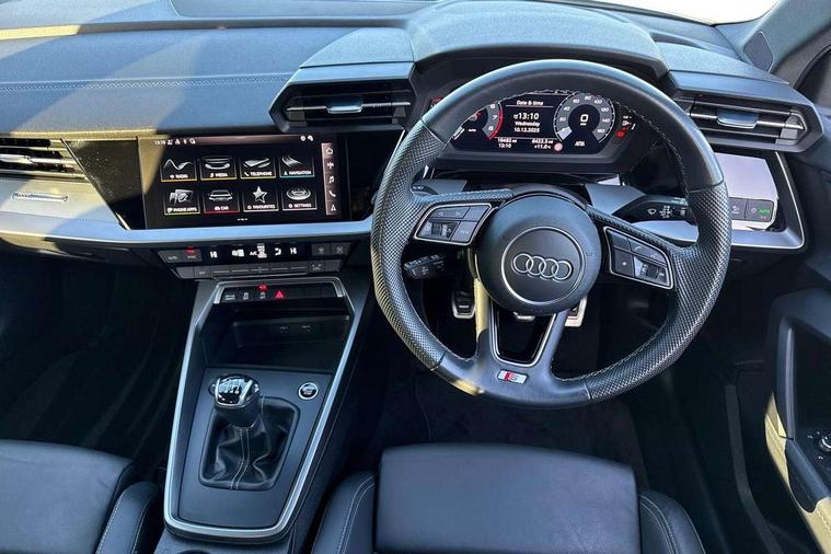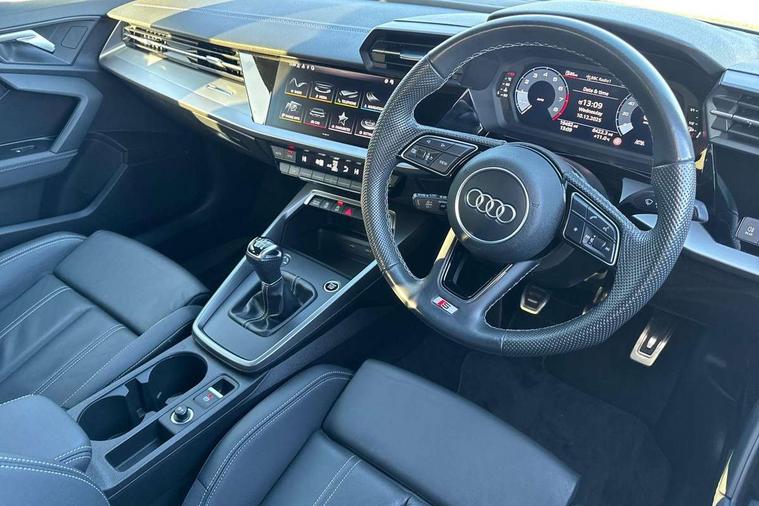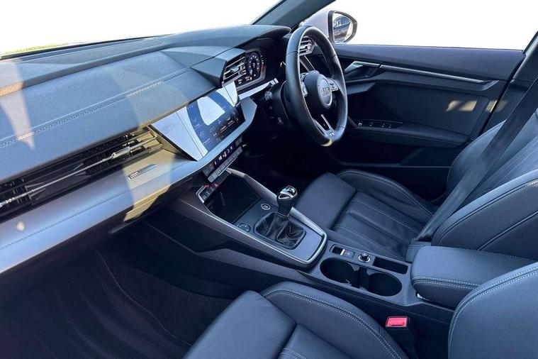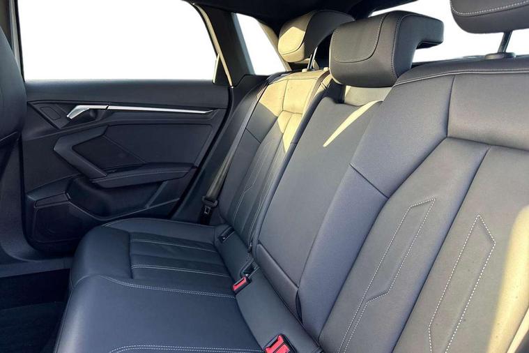Audi drive select (Auto, Comfort, Dynamic and Individual), Audi smartphone interface, Audi Virtual Cockpit - 10.25" digital and colour instrument cluster, Automatic start/stop system with recuperation, Bluetooth interface, Camera based traffic sign recognition, Collision avoidance assistant, Cruise control, e-Call (emergency call), Electromechanical power speed sensitive steering, Lane departure warning system, MMI Navigation Plus with high resolution 10.1" colour touch screen display, Rear parking sensors, Service indicator, Trip computer, Voice control system with natural language interaction, Sports suspension, 2xUSB-C connection with data and charging functions, 6 passive loudspeakers, DAB Digital radio, 3rd brake light, Acoustic glass windscreen, Aluminium window trim, Auto dimming frameless rear view mirror, Body colour exterior mirrors, Electrically adjustable/heated/folding/auto dimming door mirrors with integrated LED indications + kerb view function for passenger side, Front electric windows, Illuminated door sills with aluminium inserts at the front with S logo, LED daytime running lights, LED headlights with LED rear lights and dynamic rear indicators, Light and rain sensors, Privacy glass - dark tinted rear window, rear door and side windows, Rear electric windows, Rear side air outlets in grained matt black, Rear side wing doors, Rear wiper, S line bumpers, S roof spoiler, 12V socket and storage compartment in front centre console, 3 seat bench in 2nd row, 3 spoke leather multifunction steering wheel, 4 way electrically adjustable lumbar support for driver and front passenger, 60/40 split folding rear seat bench, Black cloth headlining, Dual zone electronic climate control, Front and rear centre armrest in artificial leather, Front and rear headrests, Front/rear floor mats, Height and reach adjustable steering wheel, Interior lighting - glove compartment light and right hand side, Luggage compartment floor covering, Manual boot compartment lid, Manually adjustable front seats, Seat side bolsters, Single front passenger seat, Stainless steel pedals and front footrest in black, Twin leather upholstery with front sports seats S embossed logo, Aluminium interior elements pack - A3 Sportback, LED interior lighting pack - A3 Sportback, S line styling pack - A3 Sportback, 3x3 point rear seat belts, Driver and front passenger airbag with passenger airbag deactivation, Electronic Stabilisation Control (ESC) including ABS, ASR and EDL, First aid kit with warning triangle and 2 safety vests, Front side airbags with head airbags and interaction airbag, Pre-sense front with pedestrian and cyclist detection, Seatbelt monitoring, Tyre pressure loss indicator, Anti theft alarm, Anti-theft wheel bolts, Electronically operated child locks, Immobiliser, Remote control central locking, Dark spectrum aluminium inlays, accent surfaces in the dashboard and centre console in platinum grey silk effect paint finish,