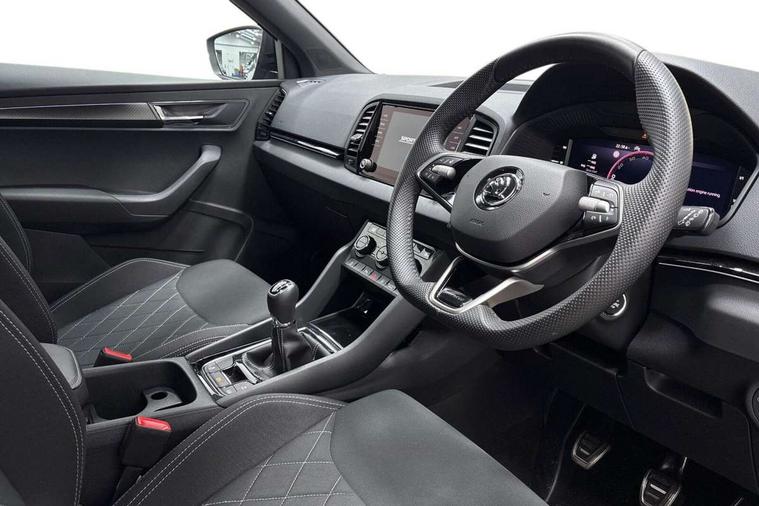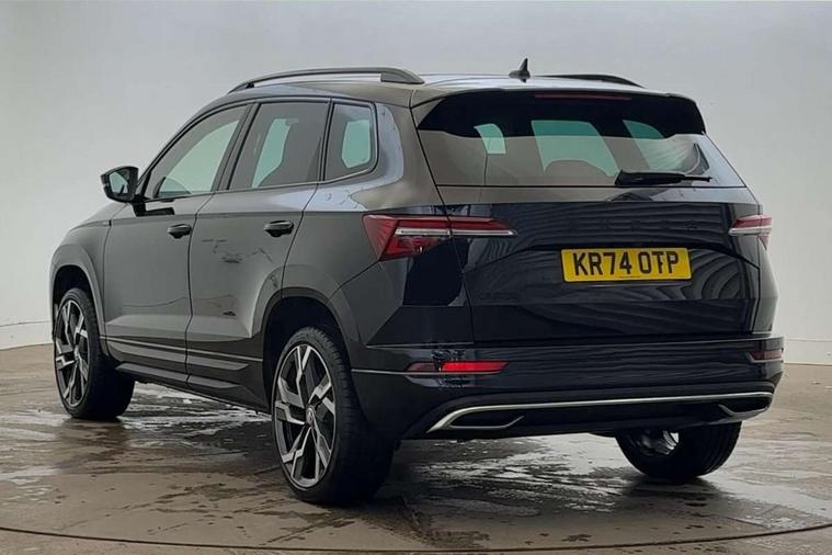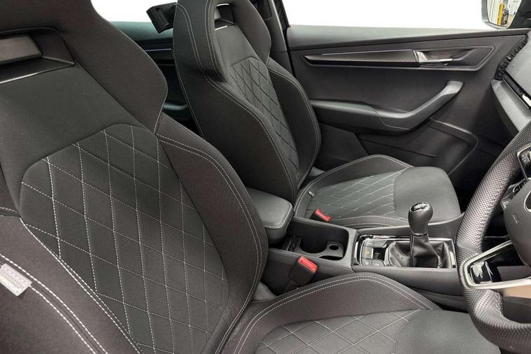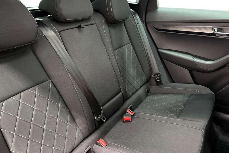 8" Digital display, Advanced driver attention and drowsiness monitor, Emergency services call system, Outside temperature gauge, Sensor for driver assistance systems, Service interval indicator, SmartLink wireless for Apple and wired for Android, Start/stop system with regenerative braking, USB C Port x 2 in front centre console, Virtual Cockpit - 10.25" digital display, Virtual pedal with electrically operated boot door, Wireless smartphone charging, DAB radio with Bluetooth, USB connection, Acoustic glass, Aero front windscreen wipers with intermittent function, Auto dimming rear view mirror with light and rain sensors, Black door mirrors, Black electric window control buttons, Black radiator grille, Black roof rails, Body colour door handles, Electric front and rear windows with child proof lock, Front door steps with SportLine logo, Heated rear windscreen, LED daytime running lights, LED rear lights with high functionality welcome effect and dynamic indicators, Light assistant (coming/leaving home/tunnel light), Panoramic sliding sunroof, Plastic scuff plates in door apertures, Privacy glass, Protective door side sills in body colour, Rear diffuser, Rear side wing doors, Rear spoiler, Rear window wiper with washer system and intermittent control, Safety reflectors on front doors, Skoda lettering on tailgate in black, Sportline badge on front fender, Sportline decorative inserts with badging, Sports front and rear bumpers, Third brake light, 1.5 litre bottle holders in driver and front passenger door panels, 12V socket in boot, 12v socket in front centre armrest with storage compartment and rear air vents, 2 x Tablet holder, 3 rear height adjustable headrests, 3 seat bench in 2nd row, 3 spoke sports leather heated multifunction steering wheel, 4 foldable roof handles with rear coat hooks, Black floor carpet, Black roof headlining, Chrome inner door handles, Foldable hooks in the boot, Front head restraints, Height adjustable front three point seats belts with tensioners, Height/reach adjust steering wheel, Ice scraper, Illuminated glovebox, Illuminated luggage compartment, Isofix child seat preparation for front passenger seat, Isofix child seat preparation outer rear, Manual lumbar support for front seats, Pen holder, Pollen filter, Rear boot cover, Rear reading lights, Rear seats fixed folding and divided 60:40, Rubbish bin door, Safety vest holder, Single front passenger seat, Storage box in upper central dashboard closed, Sunvisors with illuminated vanity mirrors, Textile floor mats, Ticket holder, Titan black interior ceiling, Umbrella under passenger seat, Under passenger seat storage compartment, LED Interior lighting pack with Skoda welcome logo - Karoq, Light Pack - Karoq, Non Smokers pack, Automatic door unlocking in case of crash, Automatic fuel cut off in case of crash, Driver airbag, Electronic parking brake with auto hold function, Emergency rear braking signal, ESC (incl. ABS+MSR+ASR+EDS+HBA+DSR+RBS+MKB), Front side airbags, Head airbags, Hill hold control, Knee airbags, Passenger airbag with switch-off function, Pedestrian monitor, Seatbelt reminder signalisation and pretensioner for all seats, Three point seatbelts rear, Two tone horn, Tyre pressure monitor, Alarm with interior monitoring, back up horn and tilt sensor with safe function, Electronic engine immobiliser, Keyless entry and start/stop, Remote central locking with 2 remote folding keys, Black air vent surround, Black centre console, carbon door decor, Satin black dashboard, Satin black door trim, 19" Sagittarius anthracite alloy wheels, Anti-theft wheel bolts protection, Breakdown and tool kit,