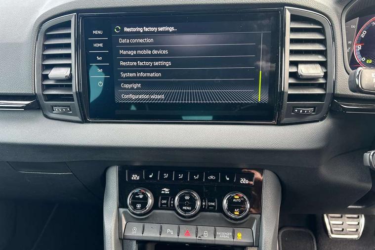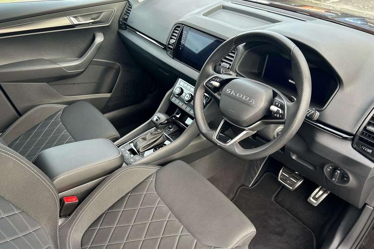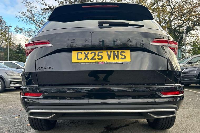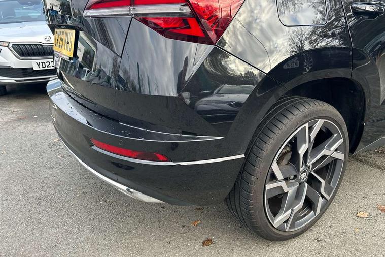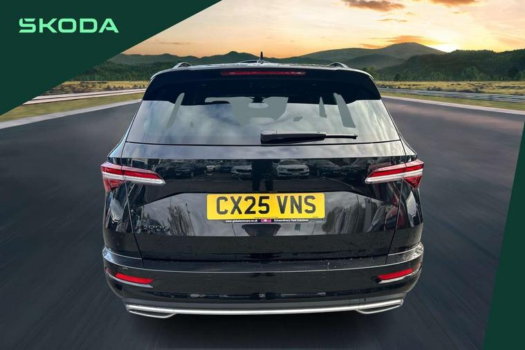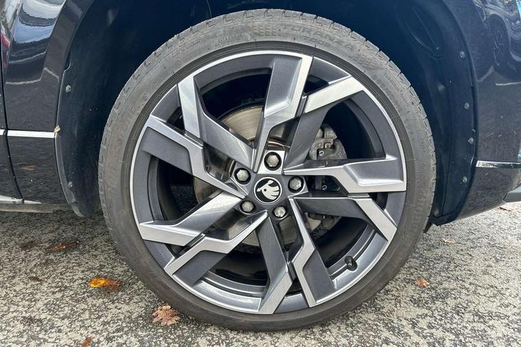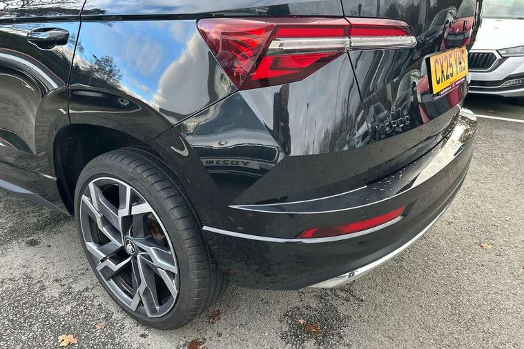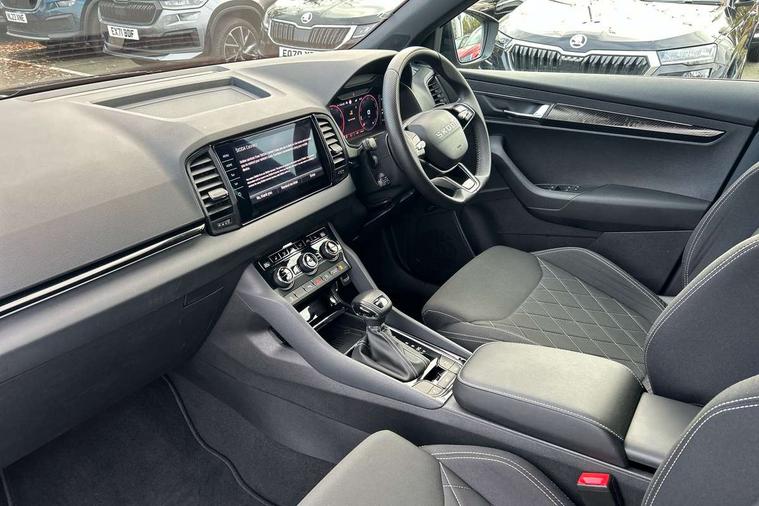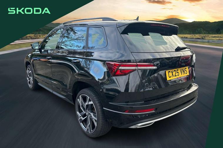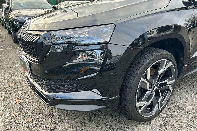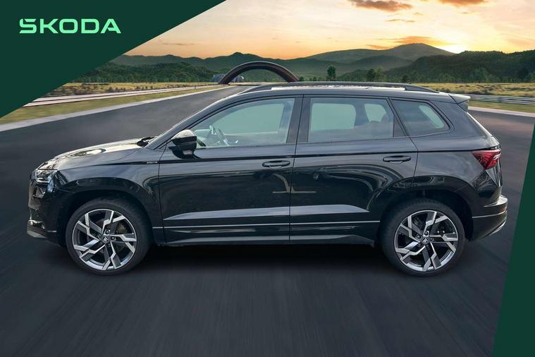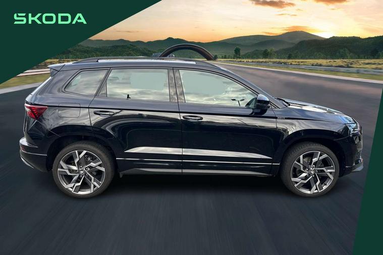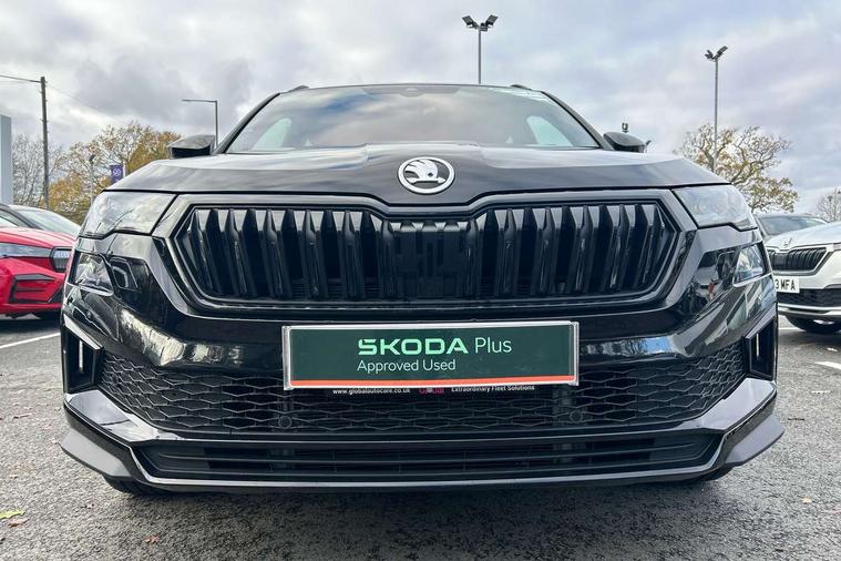 Advanced driver attention and drowsiness monitor, Emergency services call system, Outside temperature gauge, Sensor for driver assistance systems, Service interval indicator, SmartLink wireless for Apple and wired for Android, Start/stop system with regenerative braking, Traffic sign recognition, USB C Port x 2 in front centre console, Virtual Cockpit - 10.25" digital display, Virtual pedal with electrically operated boot door, Wireless smartphone charging, DAB radio with Bluetooth, USB connection, Acoustic glass, Aero front windscreen wipers with intermittent function, Auto dimming rear view mirror with light and rain sensors, Black door mirrors, Black electric window control buttons, Black radiator grille, Black roof rails, Body colour door handles, Electric front and rear windows with child proof lock, Extended rear roof spoiler, Front door steps with SportLine logo, Heated rear windscreen, LED daytime running lights, LED rear lights with high functionality welcome effect and dynamic indicators, Light assistant (coming/leaving home/tunnel light), Panoramic sliding sunroof, Plastic scuff plates in door apertures, Privacy glass, Protective door side sills in body colour, Rear diffuser, Rear side wing doors, Rear window wiper with washer system and intermittent control, Safety reflectors on front doors, Skoda lettering on tailgate in black, Sportline badge on front fender, Sports front and rear bumpers, Third brake light, Unique dark chrome design logo on alloy wheels, 1.5 litre bottle holders in driver and front passenger door panels, 12V socket in boot, 12v socket in front centre armrest with storage compartment and rear air vents, 2 x Tablet holder, 3 rear height adjustable headrests, 3 seat bench in 2nd row, 3 spoke sports leather heated multifunction steering wheel with DSG paddles, 4 foldable roof handles with rear coat hooks, Black floor carpet, Cargo elements in boot, Chrome inner door handles, Foldable hooks in the boot, Front head restraints, Height adjustable front three point seats belts with tensioners, Height/reach adjust steering wheel, Ice scraper, Illuminated glovebox, Illuminated luggage compartment, Isofix child seat preparation for front passenger seat, Isofix child seat preparation outer rear, Manual lumbar support for front seats, Pen holder, Pollen filter, Rear backrest release from boot, Rear boot cover, Rear package tray, Rear reading lights, Rear seats fixed folding and divided 60:40, Rubbish bin door, Safety vest holder, Single front passenger seat, Skoda lettering on steering wheel, Sportline decorative inserts, Storage box in upper central dashboard closed, Sunvisors with illuminated vanity mirrors, Textile floor mats, Ticket holder, Titan black interior ceiling, Umbrella under passenger seat, Under passenger seat storage compartment, Columbus pack - Karoq, LED Interior lighting pack with Skoda welcome logo - Karoq, Light Pack - Karoq, Non Smokers pack, Performance pack - Karoq, Winter plus pack with heated front and rear seats - Karoq, Automatic door unlocking in case of crash, Automatic fuel cut off in case of crash, Driver airbag, Electronic parking brake with auto hold function, Emergency rear braking signal, ESC (incl. ABS+MSR+ASR+EDS+HBA+DSR+RBS+MKB), Front side airbags, Head airbags, Hill hold control, Knee airbags, Passenger airbag with switch-off function, Pedestrian monitor, Seatbelt reminder signalisation and pretensioner for all seats, Three point seatbelts rear, Two tone horn, Tyre pressure monitor, Alarm with interior monitoring, back up horn and tilt sensor with safe function, Electronic engine immobiliser, Keyless entry and start/stop, Remote central locking with 2 remote folding keys, Black air vent surround, Black centre console, carbon door decor, Satin black dashboard, Satin black door trim, 19" Sagittarius anthracite alloy wheels, Anti-theft wheel bolts protection, Breakdown and tool kit,