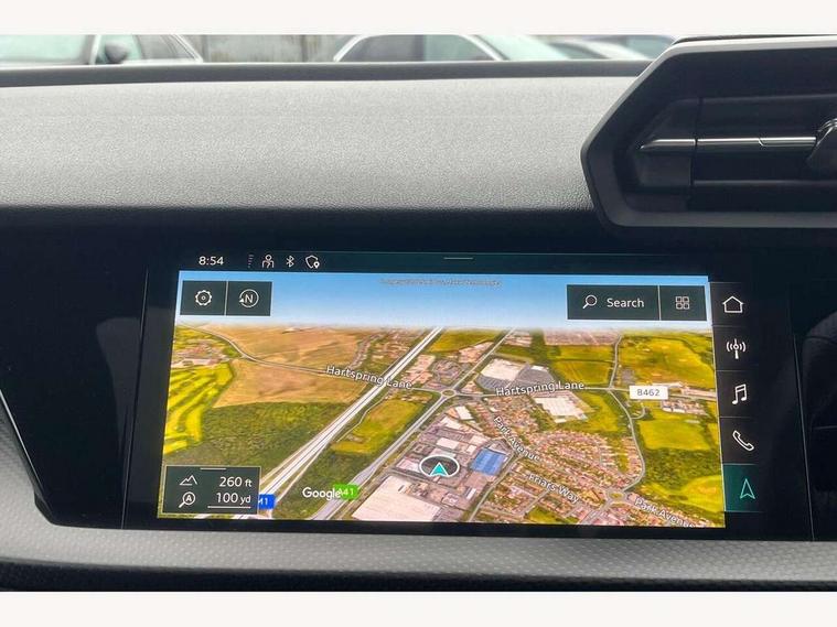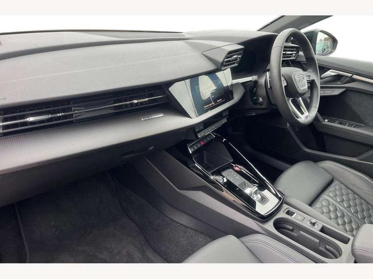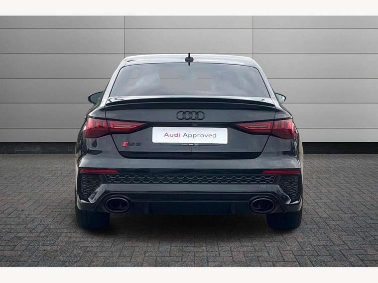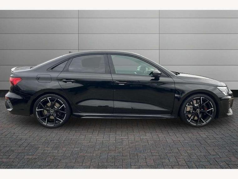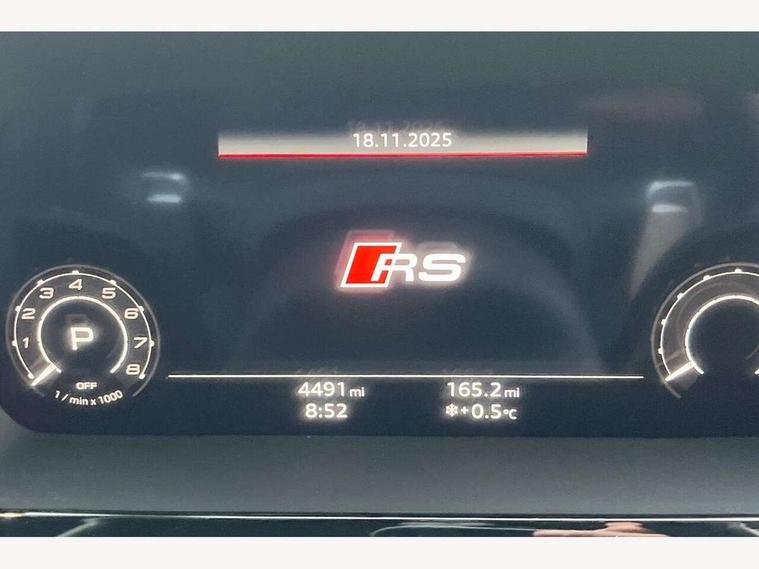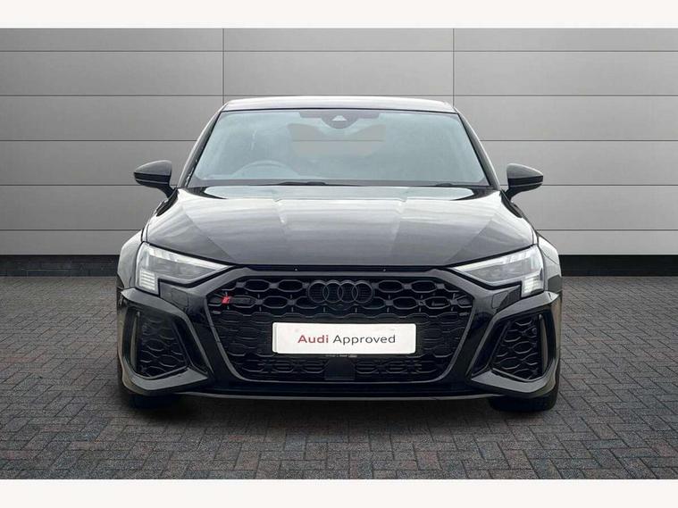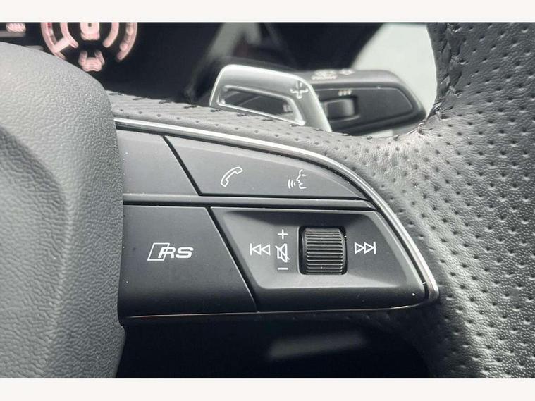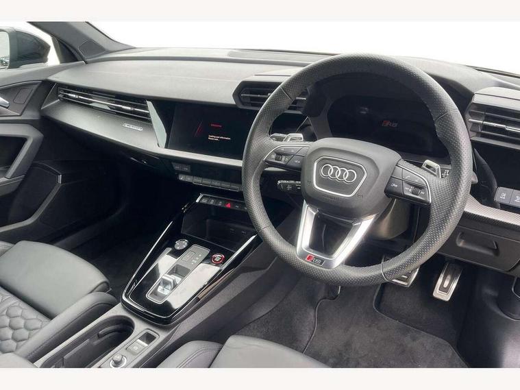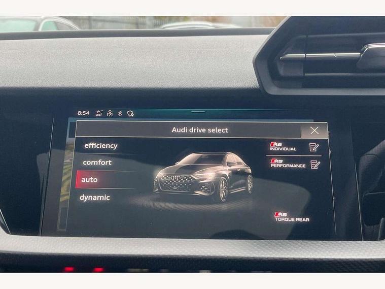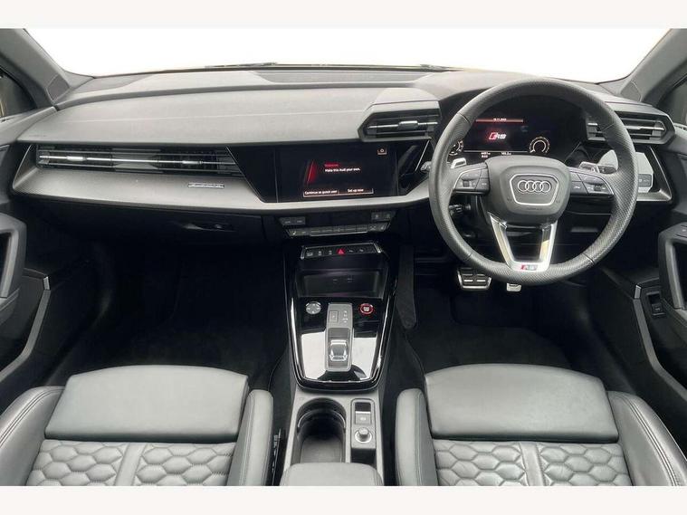 Audi smartphone interface, Audi virtual cockpit with RS specific display 12.3" full colour digital instrument cluster, Automatic start/stop system with recuperation, Bluetooth interface, Collision avoidance assistant, Emergency e-call, Head up Display, Lane departure warning system, Legal emergency call, Parking assist with parking system plus, Power operated tailgate - Luggage compartment lid opens electrically, Progressive power assisted steering, Reversing camera, Quattro permanent four wheel drive, Rear suspension, DAB Digital radio, 3rd brake light, Acoustic glass windscreen, Audi beam uses LEDs to project the Audi sport logo onto the ground as you exit your RS 3, Audi matrix LED headlights, LED rear lights, dynamic front and rear indicators and headlight cleaning system, Auto dimming rear view mirror, Black side skirts, Body colour roof, Carbon fibre engine cover, Electric adj heated/folding + auto dimming exterior mirrors with memory + LED indicator + auto kerb side function for passenger side exterior mirror, Front spoiler in high gloss black, Heat insulating glass windscreen, LED daytime running lights, Light and rain sensors, Panoramic glass sunroof, Privacy glass - dark tinted rear and rear side windows from B-pillar backwards, Rear boot, Rear side wing doors, RS exterior features in gloss black, RS sports exhaust system, 3 seat bench in 2nd row, 3 spoke leather multifunction steering wheel with gear shift paddles, 4 way lumbar support for front seats, 40/20/40 split folding rear seat bench, Black cloth headlining, Dual zone electronic climate control, Electrically adjustable front seats with memory function for driver's side, Front and rear headrests, Front centre armrest, Front sports seats RS embossed logo, Front/rear floor mats, Heated front seats, Honeycomb stitching and RS embossing, Illuminated door sill trims inlays in aluminium with RS 3 logo, RS emblems, Single front passenger seat, Stainless steel pedals and front footrest in black, Aluminium interior elements pack - RS3, Ambient lighting pack - RS3, Comfort and sound pack - RS3, Driver assistance pack with 3 spoke leather multi function steering wheel - RS3, MMI navigation plus with MMI touch - RS3, RS bodystyling - RS3, Storage Pack - RS3, 3x3 point rear seat belts, ABS/EBD, ASR, Audi pre sense front, Driver/Front Passenger airbags, EDL, ESC - Electronic Stability Control + traction control, Front passenger airbag deactivation, Front side airbags with head airbags and interaction airbag, Hill hold assist, Seat belt reminder with passenger presence detection in rear, Tyre pressure loss indicator, Warning triangle and first aid kit, Anti theft alarm, Anti-theft wheel bolts, Electronically operated child lock, Remote control central locking, Full decorative carbon trim, 19" 5 Y spoke black with graphic print alloy wheels, Tool kit, Tyre repair kit,