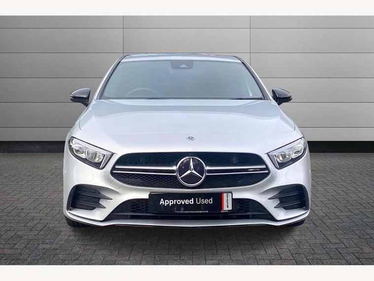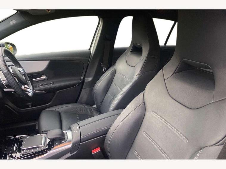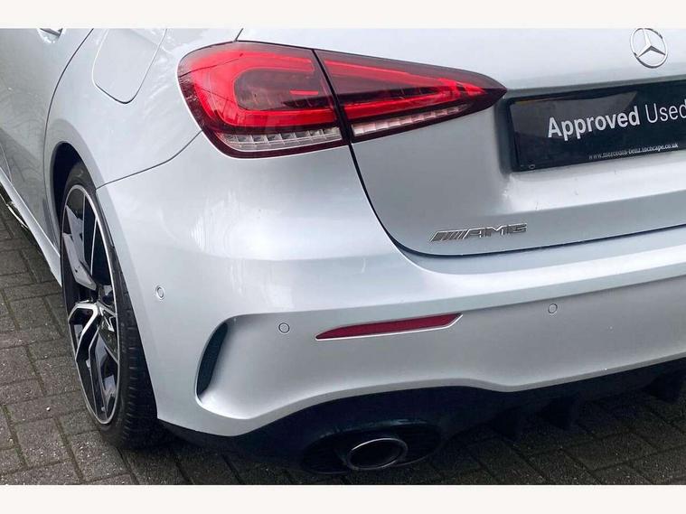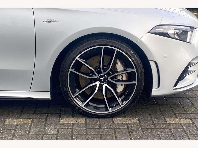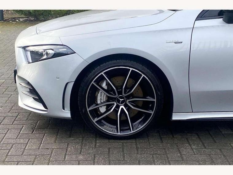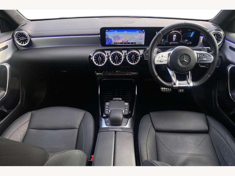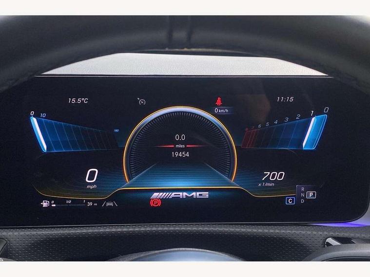 10.25" Digital instrument cluster display screen, 10.25" media display, 180 degree rear view camera with parking guidelines, Active parking assist with visual and audible warning of detected obstacles, Attention assist, Brake pad wear indicator warning light, Car wash mode, Cruise control + speed limiter, Direct steering, Dual bluetooth interfaces, DYNAMIC SELECT with driving programs (Slippery, Comfort, Sport, Sport+ and Individual), ECO start/stop function, Fluid level warning indicator for fuel, oil, coolant and washer fluid, Hard-disk navigation, Hey Mercedes Voice activation, Lamp failure indicator, Lane keeping system, Mercedes me connect including emergency call system, accident recovery, breakdown and maintenance management, Mercedes me remote services, Outside temperature gauge, Owners manual in English, Pre-installation for private car sharing, Preinstallation for Mercedes Benz link, Service indicator (ASSYST), Smartphone integration with Apple CarPlay and Android auto, Speed sensitive power steering, Trip computer, Ultrasonic sensors positioned in the front and rear bumpers, AMG performance suspension, Rear axle multi-link, 10 speakers, 2 USB ports (type C) in rear stowage compartment and one in front of center console, DAB Digital radio, MBUX multimedia system with DAB digital radio and touchpad including satellite navigation, Mercedes-Benz sound system - 100W, 4 Electric Front and Rear windows, Adaptive brake lights, AMG bodystyling - Front apron with splitter in chrome, rear apron with chrome trim and chrome visible trim elements in tailpipe, AMG Front apron with flics as air deflector elements on the outer air intakes, AMG radiator grille with twin blade lamella and AMG Lettering, AMG Rear apron with specific diffuser look with four vertical fins and two round chrome plated tailpipe trim elements with a diameter of 90 mm, AMG spoiler lip on roof, AMG Sports exhaust system with two round tailpipes measuring 90 mm in diameter attached in rear apron, AMG lettering plus ribbing on the inside of the, Automatic headlights, Black weather strip, Body colour bumpers, Body colour door handles, Body colour side skirt, Electric adjustable and heated door mirrors with integrated LED side indicators, Front wings wheel arches with TURBO 4MATIC lettering, Headlamp assist automatic headlamp activation, Heated glass rear windscreen + timer control, High gloss black beltline, LED High level third brake light, LED high performance headlamps with integrated LED daytime running lights, LED tail lamp, Privacy glass, Radio aerial, Rain sensing windscreen wipers with two sensitivity settings, Rear fog lights, Rear side wing doors, Rear wiper, Trim elements on louvres in outer air inlets in high gloss black, Wider wheel arches for AMG wheels, Window line trim strip in high gloss black, 3 seat bench in 2nd row, 40:20:40 split folding rear seats, AMG Performance steering wheel in nappa leather, Auto Mercedes-Benz child seat recognition sensor, Black air vents with surround in silver chrome, Black roof lining, Brushed stainless steel sports pedals with rubber studs, Controller on centre console with chrome surround, Floor mats with stitched edging and AMG lettering, Front centre armrest with storage compartment, Front seat backs luggage nets, Front seat cushion length adjustment, Heated front seats, Height/reach adjustable steering column, Illuminated AMG front door sills with changeable cover, Interior lighting - 64 colour Ambient lighting, Interior mirror with reading lamps in black and frameless, Manual height adjustable front seats, Rear armrest with 2 cupholders, Rear head restraints, Seat occupancy sensor for front passenger seat, Silver coloured aluminium gear shift paddles on steering wheel, Single front passenger seat, Sports seats with integrated headrests, Stowage compartment in centre console with retractable cover, Sunvisors with illuminated vanity mirrors, Touchpad on center console, Twin front cupholders, Two zone thermotronic luxury automatic climate control, AMG night pack - A Class, Light and sight pack - A Class, Mirror package - A Class, Seat comfort pack - A Class, 3 rear 3 point seatbelts, ABS with Brake Assist, Active bonnet, Active brake assist includes forward collision warning system with autonomous braking, Adaptive brake assist with hold function and hill start assist, Black seatbelts, Childproof locks manually operated for rear doors and electrically operated for rear power windows, Crash responsive emergency lighting, Driver and passenger head and side airbags, Drivers knee airbag, Dual stage driver/passenger airbags, Electronic parking brake, ESP curve dynamic assist, ESP with ASR, Front and rear seatbelt reminder, Front brake calipers with AMG lettering, ISOFIX and top tether child seat fixing points in two outer rear seats, Perforated front brake discs, Tyre pressure monitoring system, Warning triangle and first aid kit, Window airbags, Alarm system/interior protection/immobiliser, Keyless entry lock/unlock, Keyless Go, Remote central locking and crash sensor with emergency opening function, Urban guard vehicle protection system with immobiliser and interior protection, Light aluminium with longitudinal grain interior trim, 19" AMG 5 twin spoke light alloy wheels, Summer tyres, Tirefit sealant kit,