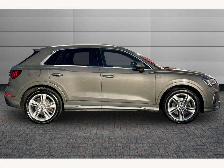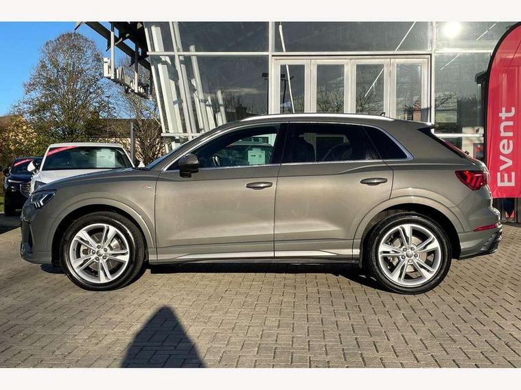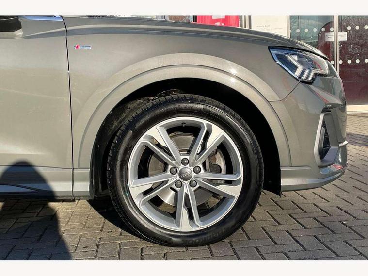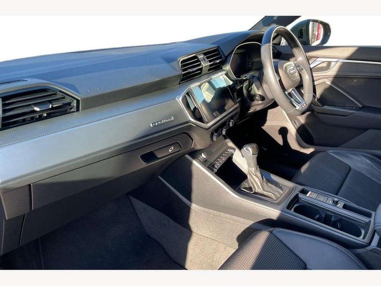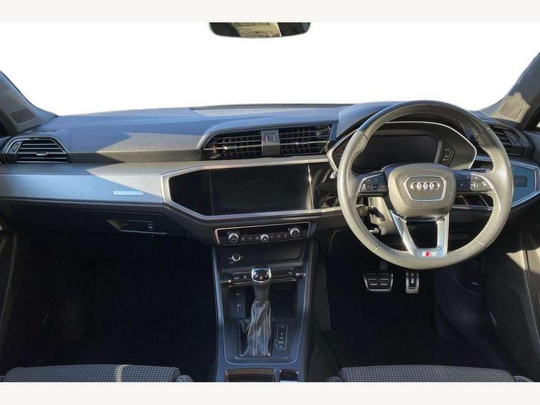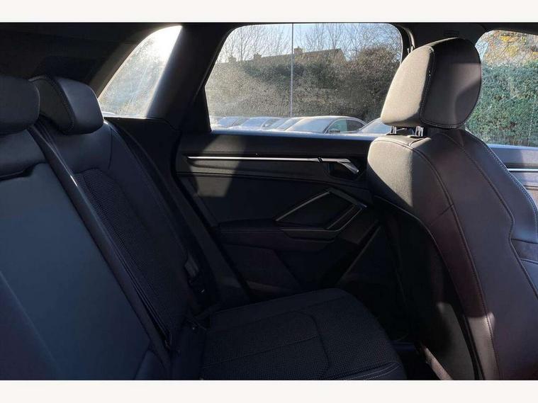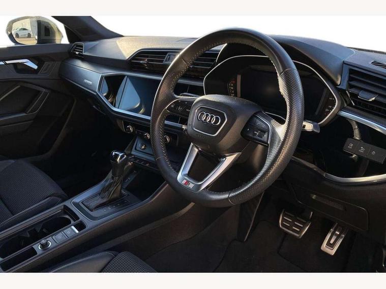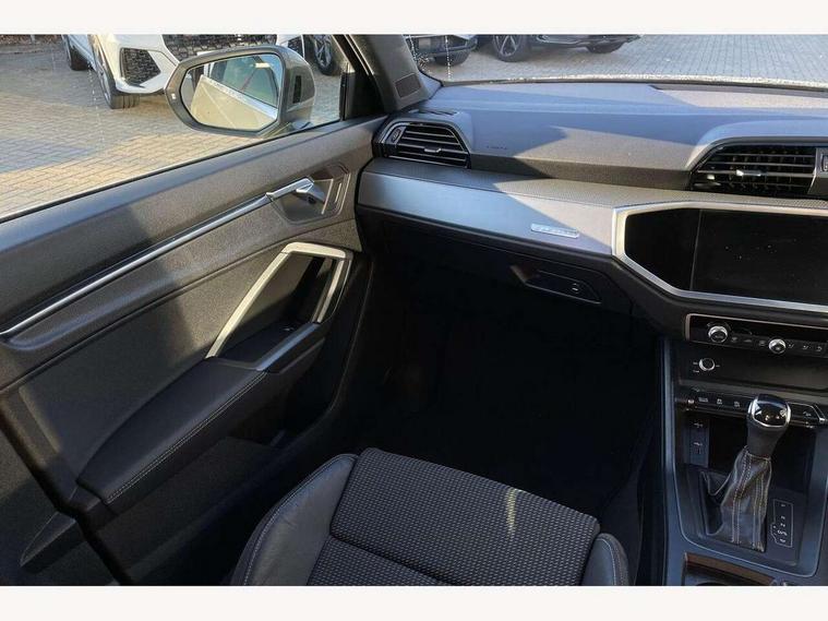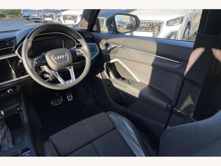 Audi connect safety and service (e-call), Audi drive select, Audi lane departure warning, Audi side assist, Audi smartphone interface, Audi Virtual Cockpit - 10.25" display, Bluetooth interface, Camera based traffic sign recognition, MMI navigation plus with MMI touch, Power opening/closing tailgate, Progressive steering, Service interval indicator, Stop/start system, Voice control system, Sports suspension, 1 x USB type C and 1 USB type A charging points, 6 speakers, DAB digital radio module, Acoustic windscreen, Aluminium roof rails, Aluminium window trim, Auto dimming rear view mirror, Body coloured bumpers, Diffuser in matt Platinum grey, Electrically adjustable and heated door mirrors with integrated LED side indicators, Front and rear electric windows, Front fog lights, Front side air inlets in matt platinum grey, Front spoiler blade in matt platinum grey, Grille vertical bars in aluminium silver/Matt, High gloss black finish B and C pillars, LED headlights with LED daytime running lights and dynamic rear indicator, LED rear lights, Privacy glass, Rain and light sensors, Rear diffuser strip in matt titanium black, S Line badge on wings, S Line front and rear bumpers, Side skirt insert in matt Platinium grey, Titanium black radiator grille, 12V socket in rear centre console, 40:20:40 split folding rear seat, Adjustable rear seat bench/backrest with centre armrest and cupholder, Aluminium door sill trims, Black cloth headlining, Dual zone climate control, Front and rear black floor mats with contrast stitching in rock grey, Front and rear headrests, Front and rear roof module including reading lights, Front centre armrest with storage compartment and angle adjustment, Glove compartment lighting, Height and reach adjustable steering wheel, Illuminated door sill trims with S logo, ISOFIX child seat mounting and Top Tether with front passenger airbag deactivation, Luggage compartment light, Manual front seats with height adjustment, Perforated leather gearknob, Stainless steel luggage compartment sill finisher, Stainless steel pedals, Non smoking pack - Q3, 3x3 point rear seatbelts, 6 airbags - Driver, front passenger, curtain and side windows, Electrically operated child locks on rear doors, Electromechanical parking brake, Electronic stabilisation control including ABS, ASR and EDL, Hill descent control, Hill hold assist, Pre sense basic, Seatbelt monitoring, Tyre pressure warning, Warning triangle and first aid kit, Anti theft alarm, Anti theft wheel bolts, Audi pre-sense front with pedestrain and cyclist recognition, Remote central locking, Dark matt brushed aluminium inlay, MMI touch colour display in gloss black with aluminium surround,