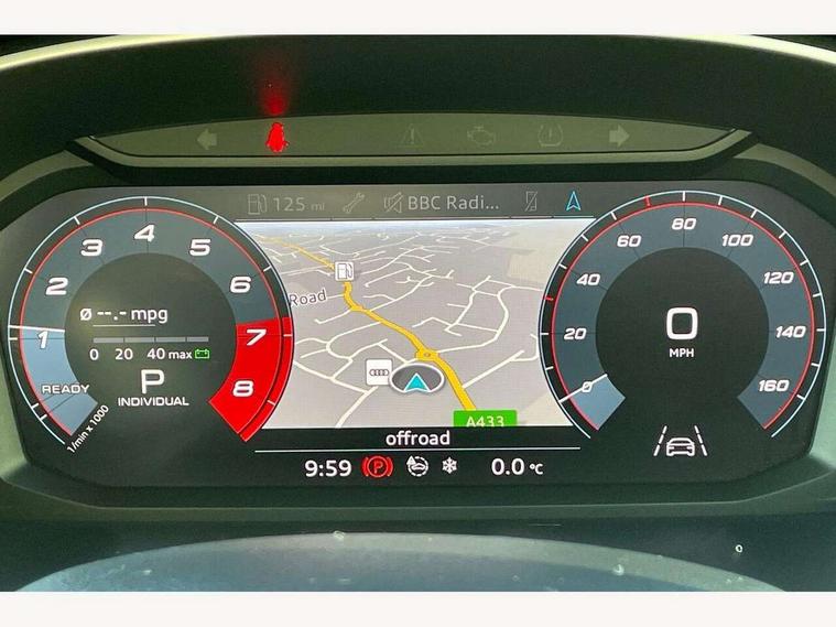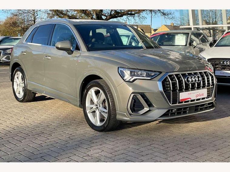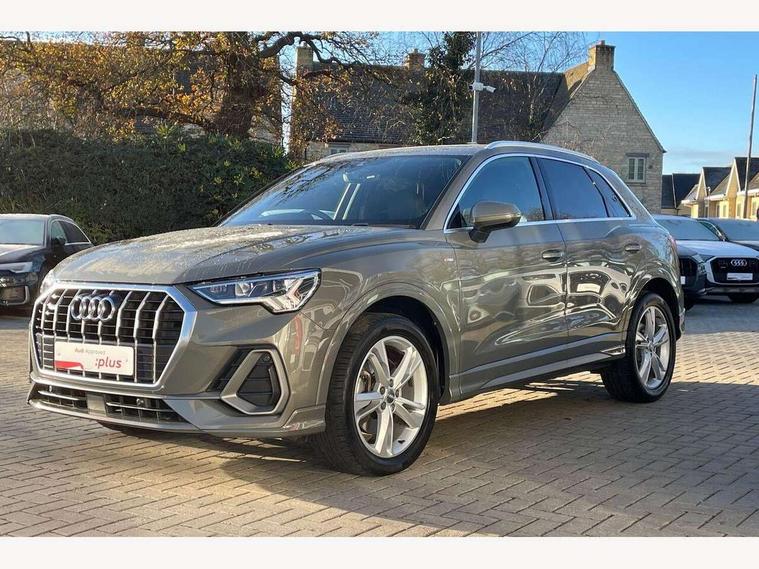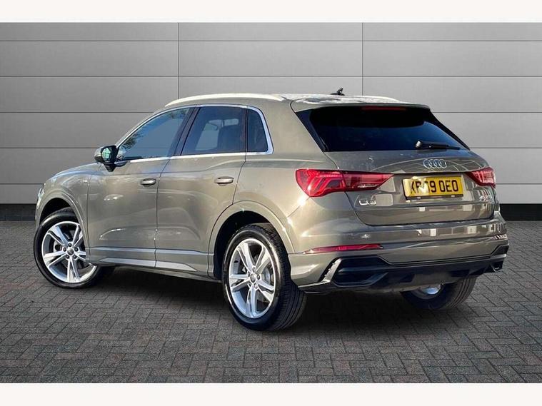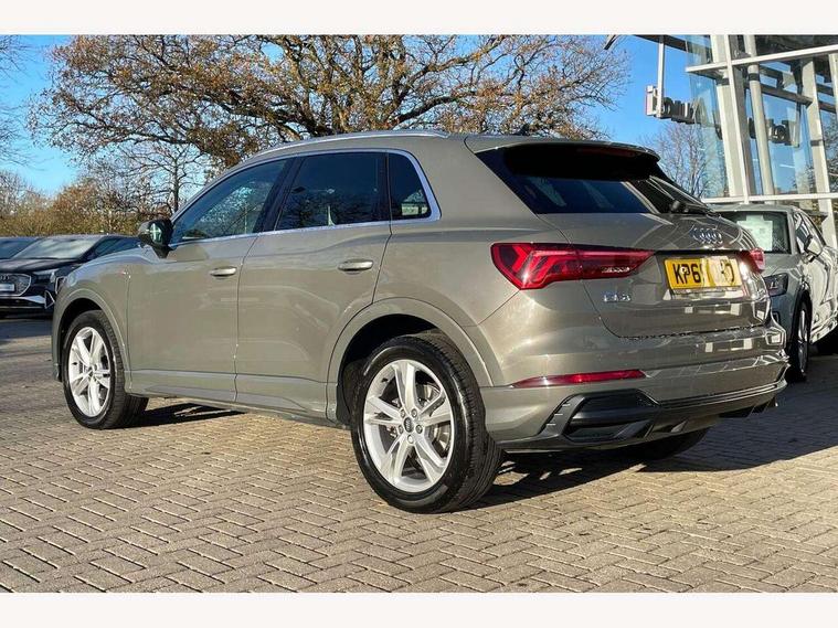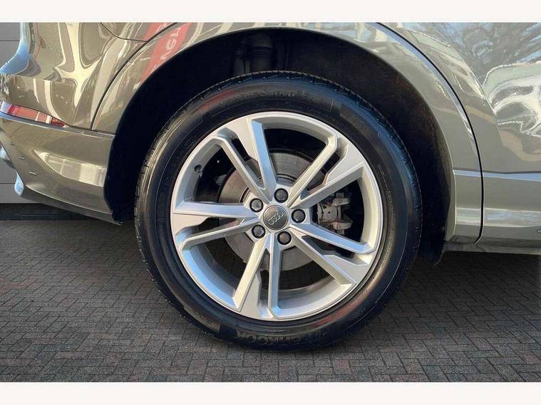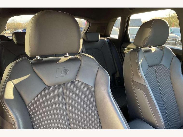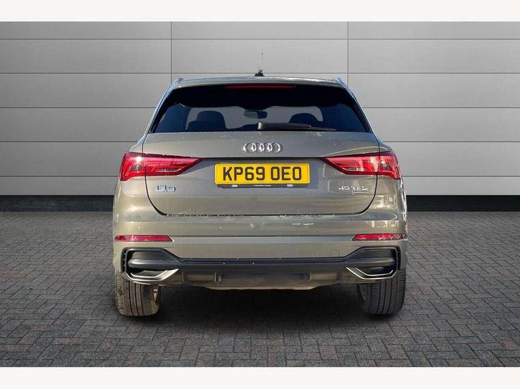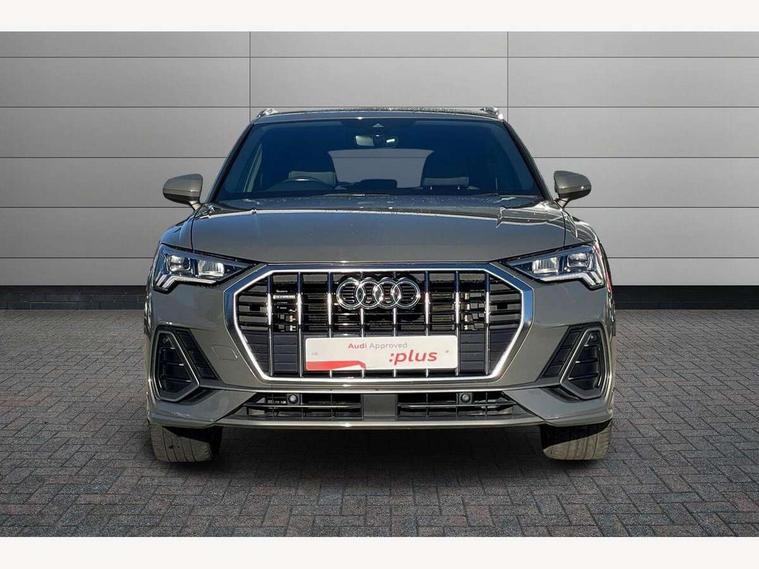 Audi connect safety and service (e-call), Audi drive select, Audi lane departure warning, Audi side assist, Audi smartphone interface, Audi Virtual Cockpit - 10.25" display, Bluetooth interface, Camera based traffic sign recognition, MMI navigation plus with MMI touch, Power opening/closing tailgate, Progressive steering, Service interval indicator, Stop/start system, Voice control system, Sports suspension, 1 x USB type C and 1 USB type A charging points, 6 speakers, DAB digital radio module, Acoustic windscreen, Aluminium roof rails, Aluminium window trim, Auto dimming rear view mirror, Body coloured bumpers, Diffuser in matt Platinum grey, Electrically adjustable and heated door mirrors with integrated LED side indicators, Front and rear electric windows, Front fog lights, Front side air inlets in matt platinum grey, Front spoiler blade in matt platinum grey, Grille vertical bars in aluminium silver/Matt, High gloss black finish B and C pillars, LED headlights with LED daytime running lights and dynamic rear indicator, LED rear lights, Privacy glass, Rain and light sensors, Rear diffuser strip in matt titanium black, S Line badge on wings, S Line front and rear bumpers, Side skirt insert in matt Platinium grey, Titanium black radiator grille, 12V socket in rear centre console, 40:20:40 split folding rear seat, Adjustable rear seat bench/backrest with centre armrest and cupholder, Aluminium door sill trims, Black cloth headlining, Dual zone climate control, Front and rear black floor mats with contrast stitching in rock grey, Front and rear headrests, Front and rear roof module including reading lights, Front centre armrest with storage compartment and angle adjustment, Glove compartment lighting, Height and reach adjustable steering wheel, Illuminated door sill trims with S logo, ISOFIX child seat mounting and Top Tether with front passenger airbag deactivation, Luggage compartment light, Manual front seats with height adjustment, Perforated leather gearknob, Stainless steel luggage compartment sill finisher, Stainless steel pedals, Non smoking pack - Q3, 3x3 point rear seatbelts, 6 airbags - Driver, front passenger, curtain and side windows, Electrically operated child locks on rear doors, Electromechanical parking brake, Electronic stabilisation control including ABS, ASR and EDL, Hill descent control, Hill hold assist, Pre sense basic, Seatbelt monitoring, Tyre pressure warning, Warning triangle and first aid kit, Anti theft alarm, Anti theft wheel bolts, Audi pre-sense front with pedestrain and cyclist recognition, Remote central locking, Dark matt brushed aluminium inlay, MMI touch colour display in gloss black with aluminium surround,