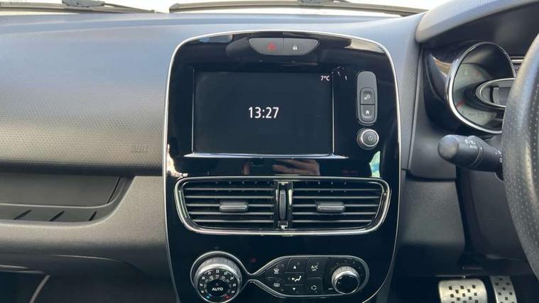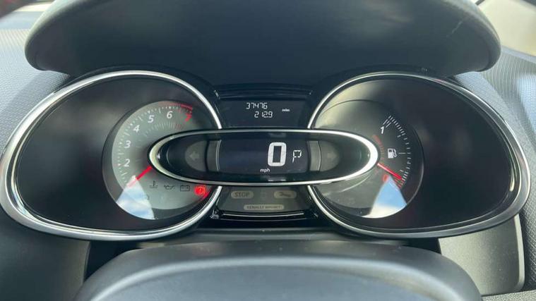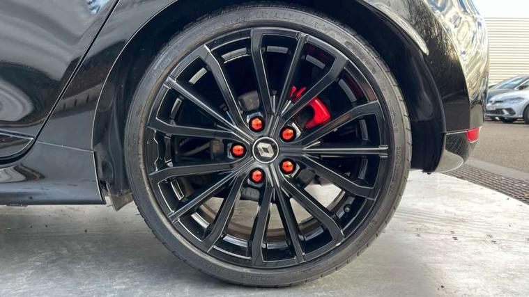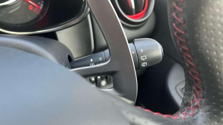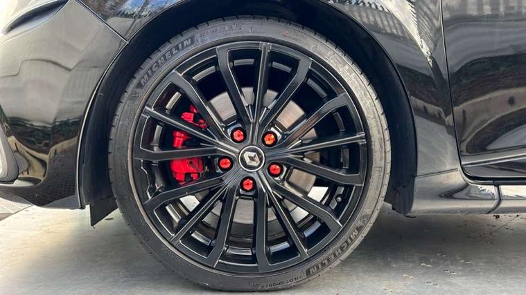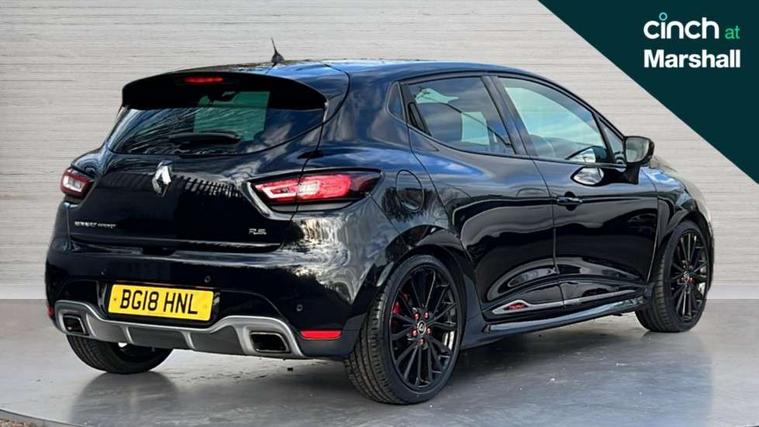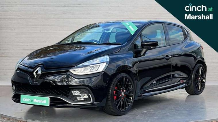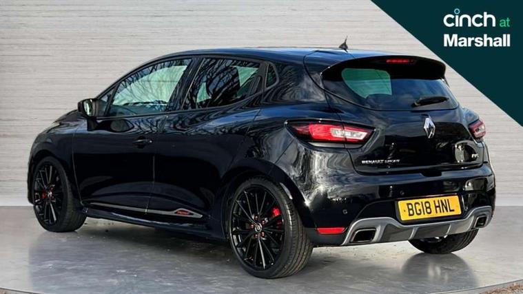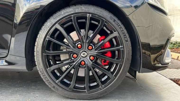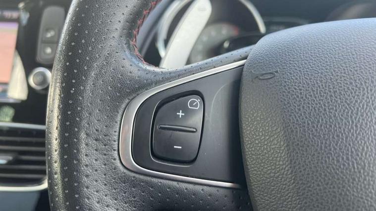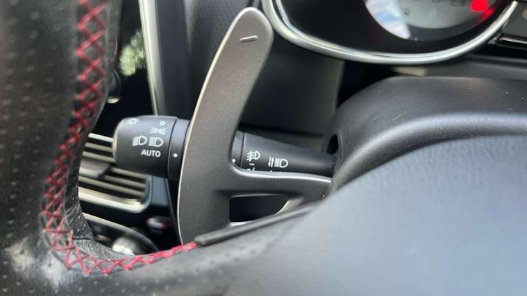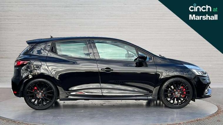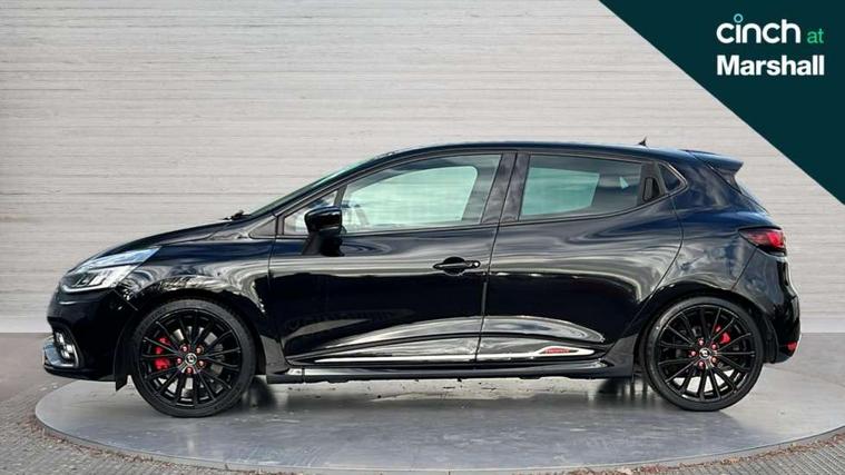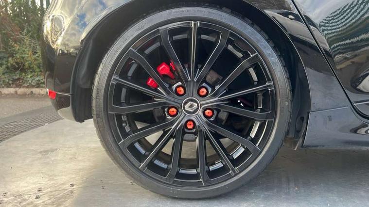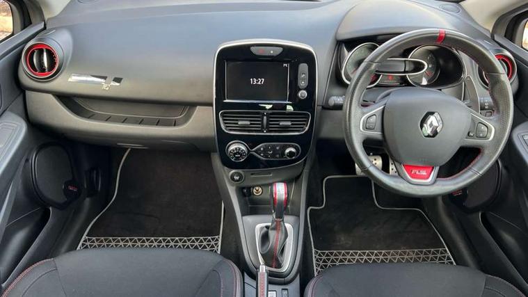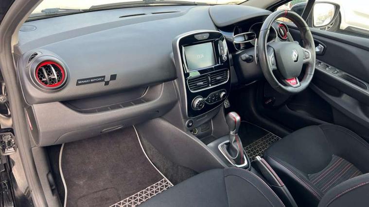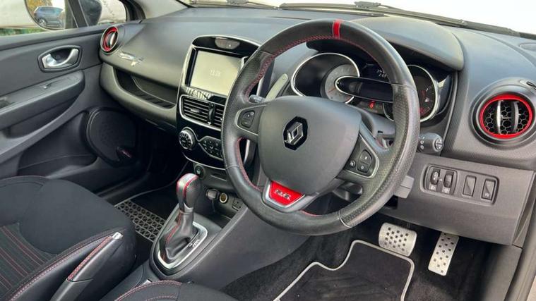 Cruise control + speed limiter, Drive mode selector, Push button starter, Smartphone cradle, Trip computer, Variable PAS, Launch control, Trophy chassis + black insert and red calipers, Aux-in socket, Anthracite front bumper insert, Automatic headlights + automatic windscreen wipers, Black headlamp surrounds, Body colour door protectors with chrome insert, Body coloured bumpers, Body coloured side skirts, Electric adjustable door mirrors, Electric folding door mirrors, Electric front windows + one touch + anti-pinch, Electric rear windows, Front fog lamps, Gloss black door mirrors, Heated door mirrors, LED daytime running lights, LED Headlights, Rear wiper, Renaultsport kick plates, Renaultsport rear spoiler, Silver boot lid strip finisher, Silver front grille strips, Silver side door inserts, Twin chromed exhaust pipes, Variable front intermittent wipers, 12V Accessory socket, 3 rear height adjustable headrests, 60/40 split rear seats, Aluminium foot pedals, Chrome gear knob insert, Chrome interior door handles, Driver's seat height adjustment, Front cupholders, Front door storage bin, Glovebox, Height adjustable front headrests, Height/reach adjust steering wheel, Isofix system on outer rear seats, Leather gearshift/handbrake with red stitching, LED interior lighting, vanity mirror and electrochrome rear view mirror, Multi function steering wheel, Pollen filter, Renaultsport leather steering wheel with stitched red centre band, System for Restraint and Protection SRP-front seats, Climate pack - Clio, Techno Pack - Clio Hatchback, 3 point seatbelts on all rear seats, ABS+EBD+Brake assist, Driver and passenger front and side airbag deactivation, Driver/Front Passenger airbags, Driver/front passenger side airbags, ESP + Traction control + Understeer control, Front side airbags(head+thorax), Height adjustable driver's seatbelt, Hill start assist, Seatbelt warning, Tyre pressure warning, Anti-drill door locks, Child lock control of rear doors and windows, Deadlocking system, Hands free Renault card, Locking fuel filler cap, RAID (Renault Anti-Intruder Device) with automatic door locking, Remote central locking, Thatcham Cat 2 engine immobiliser, Dark carbon soft touch dashboard, Gloss black air vent surround with red insert, 18" Renault sport black alloy wheel, Tyre inflation kit,
