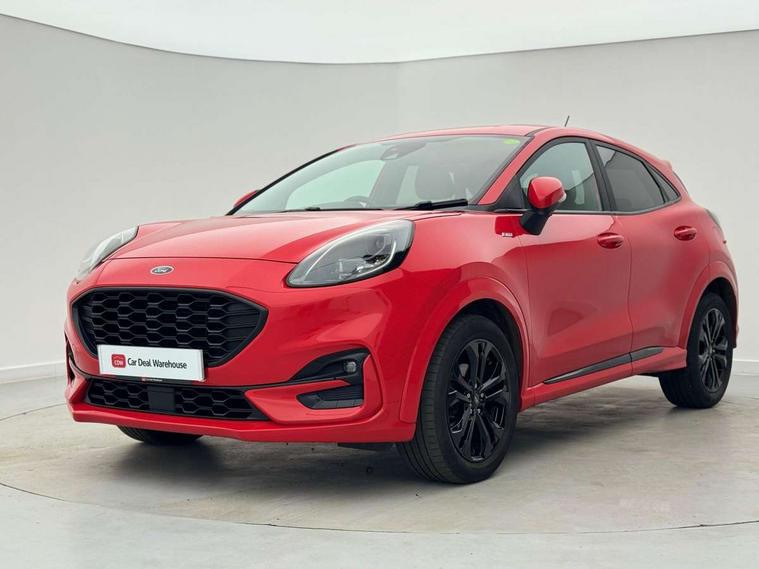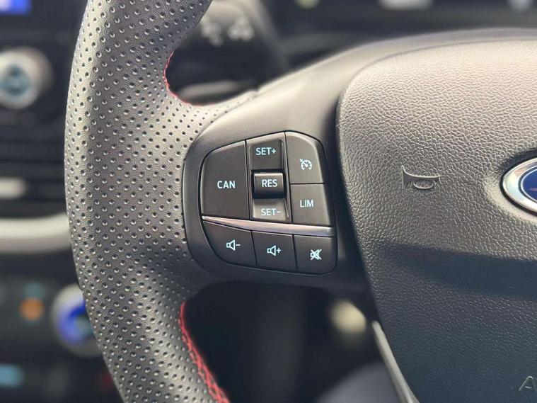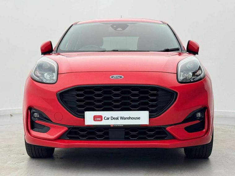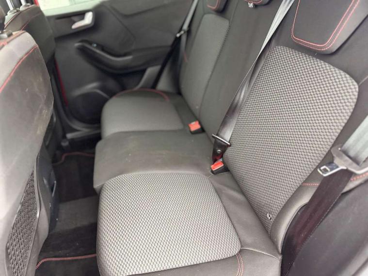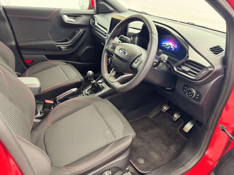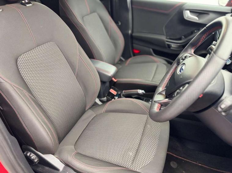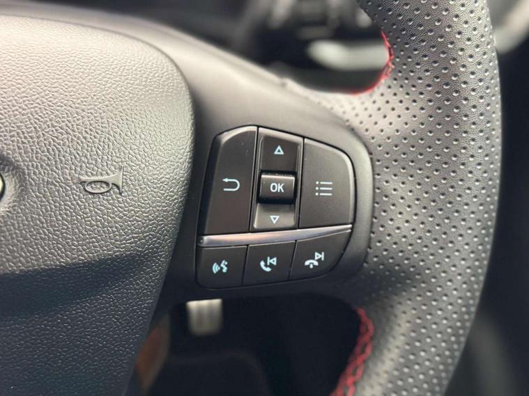 Ford easy fuel, Full digital 12.3" instrument cluster, Power assist steering, Power start button, Rear parking sensor, Selectable drive modes(Normal, sport, Eco, trail, slippery), Automatic rain sensing wipers, Body coloured door mirrors, Front fog lights with cornering lights and LED rear lamps, Power foldable heated door mirrors with puddle lamps, Projector headlamps with LED day time running lights, Quickclear heated windscreen, Rear wiper, ST-Line body kit with large rear spoiler wth sports suspension, Centre console with armrest and stowage, Cloth upholstery, Driver seat height/lumbar adjust, Ford megabox extended bootspace, Front and rear floor mats, Front and rear head restraints, Manual air conditioning, ST-Line flat bottomed sensico leather steering wheel with leather handbrake and aluminium gear knob, Driver assistance pack with Lane departure warning - Puma, Ford SYNC 3 navigation pack - Puma, 3 rear seatbelts, Electronic stability control (ESC) and hill start assist, Pedestrian/cyclist detection & post-collision braking, Tyre pressure monitoring system (TPMS), Thatcham alarm,