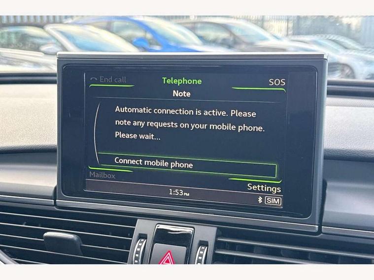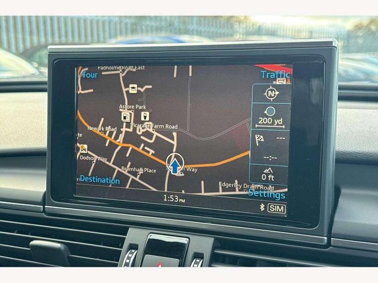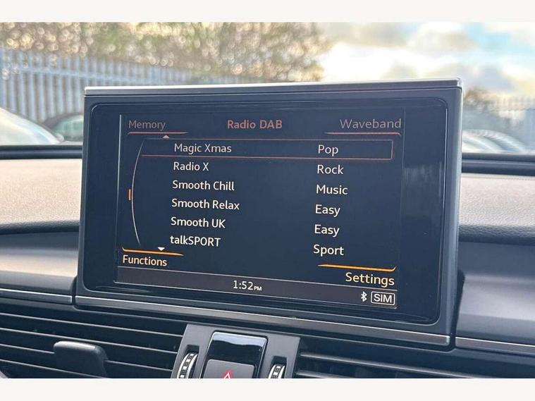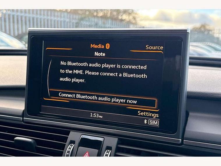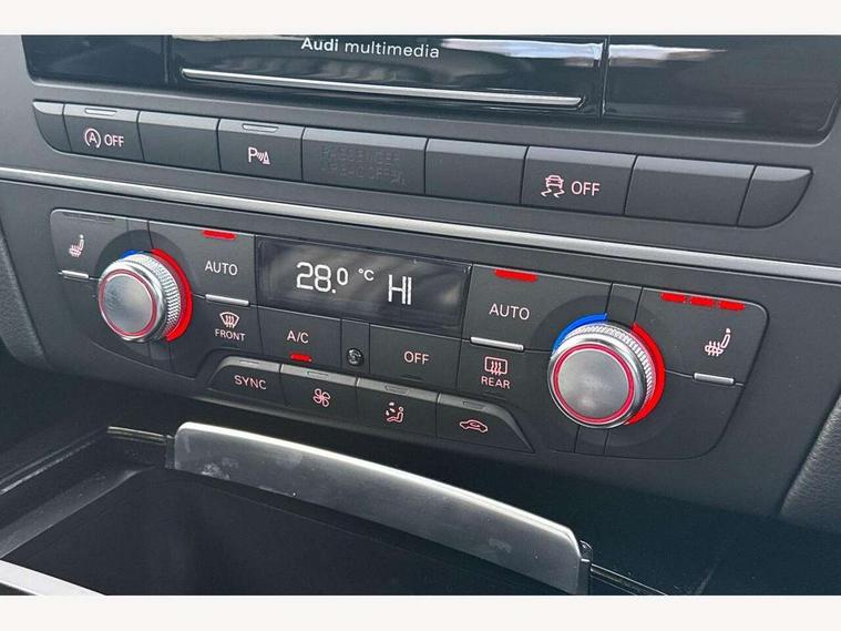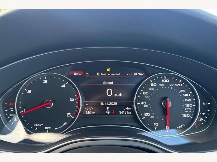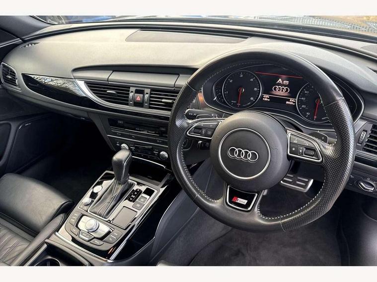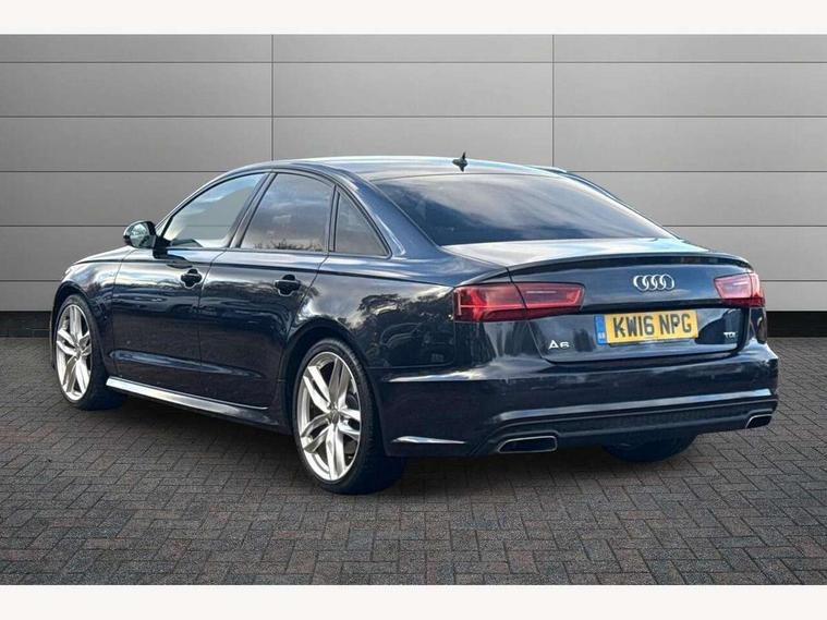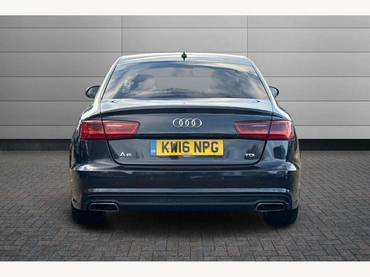 Audi drive select, Audi parking system plus with front and rear sensors, Audible and visual fasten seat belt warning - front and rear, Mobile telephone preparation - bluetooth interface, PAS, Service interval indicator, Diesel particulate filter, Audi music interface, Auxiliary input socket, DAB digital radio module, Auto dimming rear view mirror, Automatic headlights + automatic windscreen wipers, Body colour bumpers, Body colour door mirrors and handles, Body coloured door mirrors, Electric front/rear windows, Headlight washers, LED daytime running lights, LED rear lights, Platinum grey front lip spoiler, Privacy glass (to rear of B post), S Line body styling, 12 way electric front seats with driver's memory function, 12V power in rear centre console, 4 way electric lumbar support for driver and front passenger, 4 zone climate control, Aluminium door sill trims, Door sill trims with S line logo, Front centre armrest, Front head restraints, Front/rear floor mats, Height adjustable front seats, Height/reach adjust steering wheel, Isofix front passenger and rear seat preparation, Jack and tool kit, Perforated leather gearknob, Rear headrests, Split folding rear seat, Black styling pack - A6, Non smoking pack - A6, 3 point seatbelts on all seats, ABS/EBD, ASR traction control, Curtain airbags, Driver and passenger airbags, Driver/front passenger side airbags, Electromechanical parking brake, Electronic stability control, Front passenger airbag deactivation, Hill hold assist, Tyre pressure monitoring system, Warning triangle and first aid kit, Anti theft alarm, Anti-theft wheel bolts, Immobiliser, Keyless Start, Remote central locking, Alcantara door trim, Space saver spare wheel,