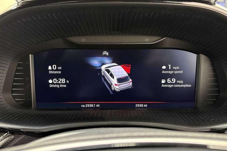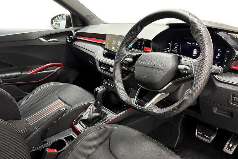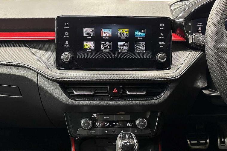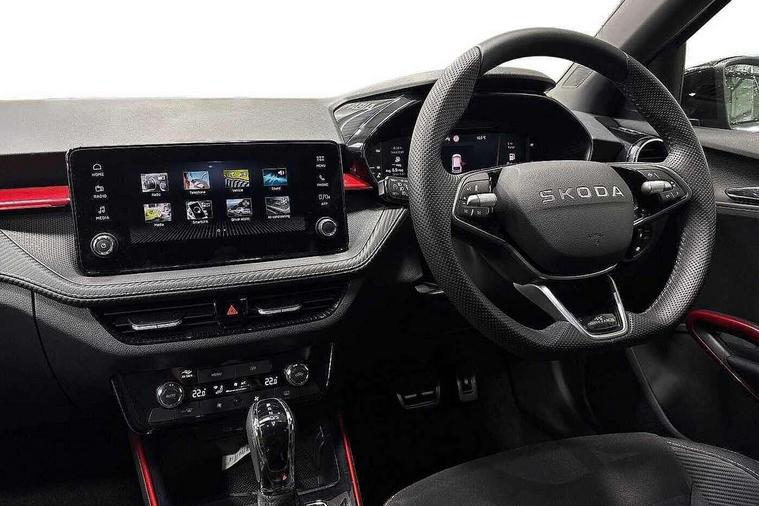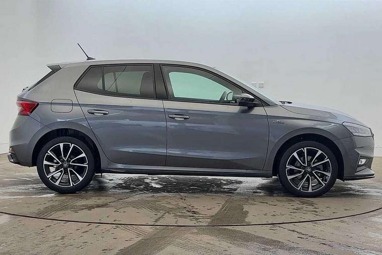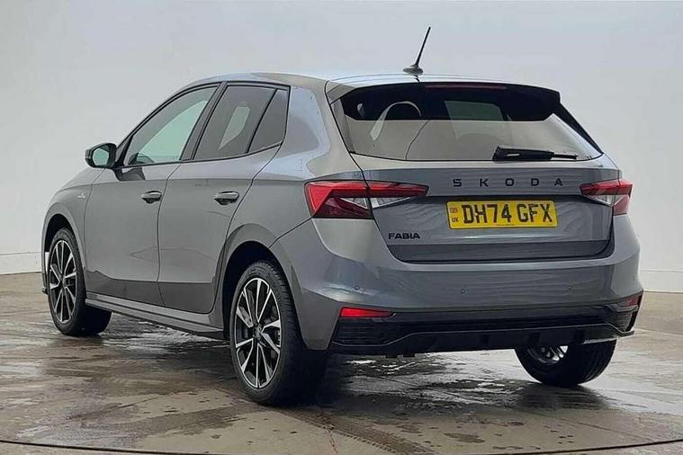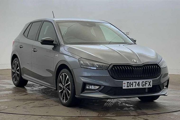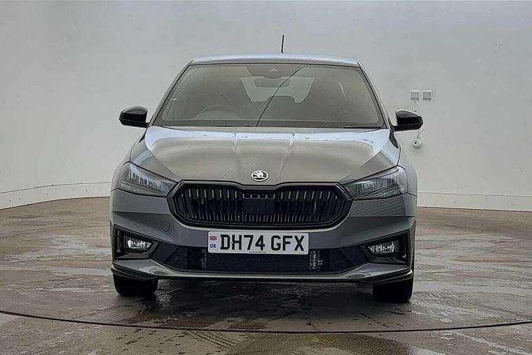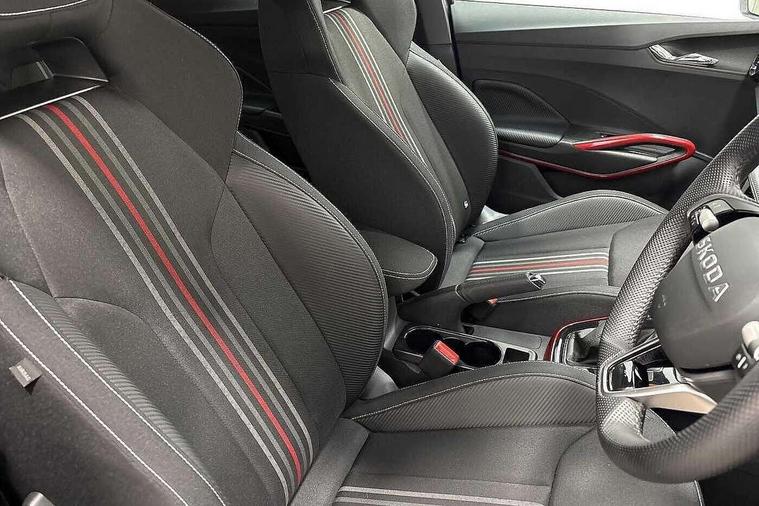 Advanced driver attention and drowsiness monitor, Bluetooth connection, Electromechanical power steering, Exterior temperature gauge, Service interval indicator, Traffic sign recognition, Virtual cockpit with 10.25" colour display, Wireless SmartLink for Apple CarPlay and Android Auto, 6 Speakers (4 in front and 2 in rear), Auxiliary socket for external MP3 player, DAB digital radio reception, Auto dimming rear view mirror, Black radiator grille, Body coloured bumpers, Door mirror integrated indicators, Front and rear electric windows, Front window wiper intermittent control, Headlight range control - Automatic, Ice scraper in fuel cap, LED daytime running lights with coming and leaving home feature, LED rear lights, Monte Carlo badging, Privacy glass, Rear LED fog light, Rear side wing doors, Rear window wiper with washing nozzles, Roof mounted spoiler, SKODA tailgate lettering in black, Sports bumpers, Third brake light, 2 reading lights in front and 2 reading lights in rear, 3 rear headrests, Aluminium pedals, Backrest split and folding, Black headlining, Central console with removable cup holder and storage box, Chrome handbrake release button, Door sills with fabia badging, Dual zone air conditioning with climatronic electronic control, Fabric/artificial leather upholstery, Front centre armrest, Front sports seats, Gearshift knob/handle in leather, Hand brake lever handle in leather, Height adjustable front headrests, Height adjustable front seats, Height adjustable steering wheel, ISOFIX and TopTether anchorage points to the outer rear seats, ISOFIX and TopTether on the front passenger seat, Luggage compartment lighting, Manually adjustable lumbar support in front seats, Metallic painted red central console cover, Metallic red interior door handles, Pollen filter, Rear seat bench unsplit, Single front passenger seat, Sun visors with mirror and airbag label on passenger side, Textile floor mats, Ticket holder, Umbrella in drivers door, 3-point height adjustable front seats belts with pretensioner and force limiter, Automatic warning lights in case of crash, Driver and passengers airbag with switch off function, e-Call+, ESC including ABS, MSR, ASR, EDS, HBA and XDS, Front and rear seat belt warning, FRONT ASSIST (AEB City and AEB Inter Urban), Front side airbags, Head airbags, Hill hold control, One tone horn, Pedestrian protection, Three rear 3-points safety seat belts with pretensioner and force limiter including stop function for outer rear seat belts, Tyre pressure monitoring system, Anti-theft alarm system including immobiliser, interior monitoring, backup horn, and towing protection, Central locking with radio remote control, interior controls, SAFE function and 2 foldable keys, Carbon effect door and side trim panels, Carbon effect lower decorative trim with white stitching, Monte carlo air vents, Red metallic upper decorative trim, Anti-theft wheel bolts protection, Super-low rolling resistance tyres,