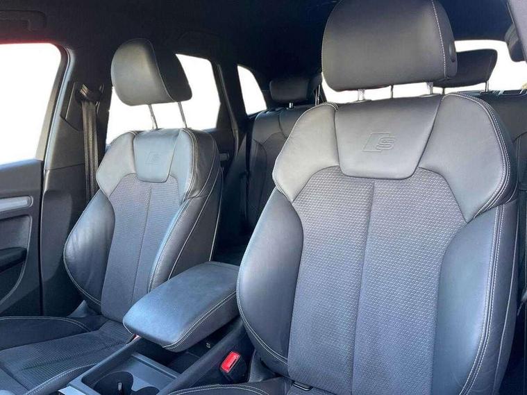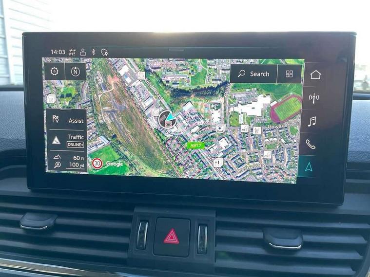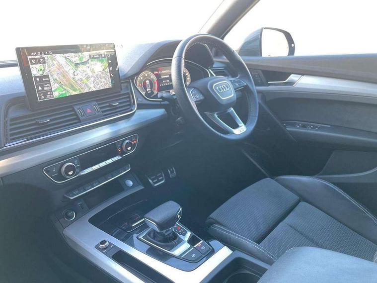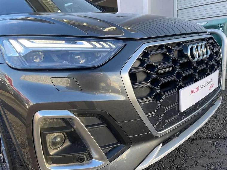Acoustic front and rear parking sensor, Audi connect safety and service (e-call), Audi connect with Amazon Alexa Integration, Audi drive select, Audi virtual cockpit plus with 12.3" screen and three different layout designs, Audi wireless smartphone interface, Automatic start-stop system with coasting functionality and efficiency programme, Bluetooth interface, Electro - mechanical power assisted steering, MMI navigation plus with 10.1" touch screen, Power tailgate, Reversing camera, Service interval indicator, Voice control system with Audi hotword activation "Hey Audi", Diesel particulate filter, Quattro on demand, S line sports suspension, 2 x USB charging port with aux input socket, 8 loudspeakers, DAB Digital radio, Acoustic windscreen, Aluminium roof rails, Audi matrix LED headlights with dynamic front and rear indicators, Auto dimming door mirrors, Auto dimming frameless rear view mirror, Automatic headlight adjustment, Automatic headlights and windscreen wipers, Body colour bumpers, Body colour door mirrors, Body colour rear diffuser with matt aluminium silver surrounds, Body colour underbody protection, Chrome plated exhaust trims, Daytime running lights, Door sills in Selenite silver, Electric adjustable/heated/folding door mirrors, Front air inlet surrounds in aluminium, Front and rear electric windows, Front radiator grille in honeycomb design, Headlight washers, High level LED brake light, Lower bumpers painted in contrast Manhattan grey, Rear chrome trim strip below lights, Rear privacy glass and rear side windows, Rear side wing doors, Rear wiper, Roof bars, S Line badges on the front wings, S Line front and rear bumpers, S Line rear spoiler, S Line side skirts, 3 rear headrests, 3 spoke leather multifunction steering wheel with S badging perforated leather grips, 40:20:40 split folding 3 rear bench seat in 2nd row with rear centre armrest, Black cloth headlining, Comfort front centre armrest, Contrast stitching on seats, steering wheel and gear lever gaiter, Deluxe 3 zone electronic climate control, Front/rear floor mats, Gear lever in black leather, Heated front seats, Height adjustable front head restraints, Height/reach adjustable steering column, Illuminated door sill trims with S logo, Luggage compartment cover, Manual seat adjustment with 4-way electric lumbar support, Removable luggage compartment floor, Single front passenger seat, Stainless steel pedals, Sunvisors with vanity mirrors, High gloss pack - Q5, LED interior light pack - Q5, 3 point seatbelts on all seats, 6 airbags - Driver, front passenger, curtain and side airbags, Electrically operated child locks on rear doors, Electromechanical parking brake, Electronic stabilisation control including ABS, ASR and EDL, First aid kit with warning triangle and vests, Front passenger airbag deactivation, Hill descent control, Hill hold assist, ISOFIX child seat mounting for front passenger seat and ISOFIX child seat mounting with Top Tether for outer rear seats, Multi collision brake assist, Pop-up bonnet for pedestrian protection, Pre sense city, Seat belt force limiter, Seatbelt monitoring, Tyre pressure warning, Anti theft alarm, Anti-theft wheel bolts, Keyless Go access/ignition system, Remote central locking, Air vents inserts and centre console in gloss black, Matt brushed aluminium inlays,