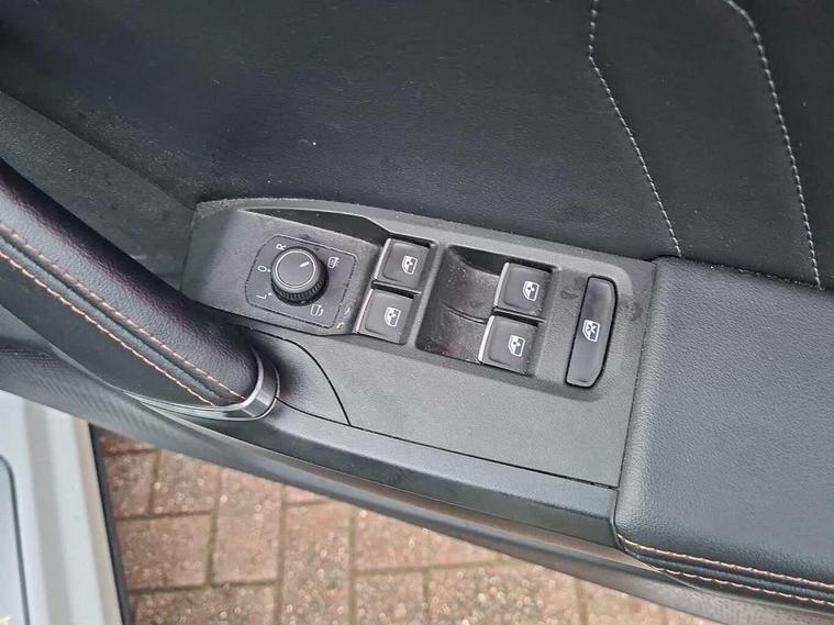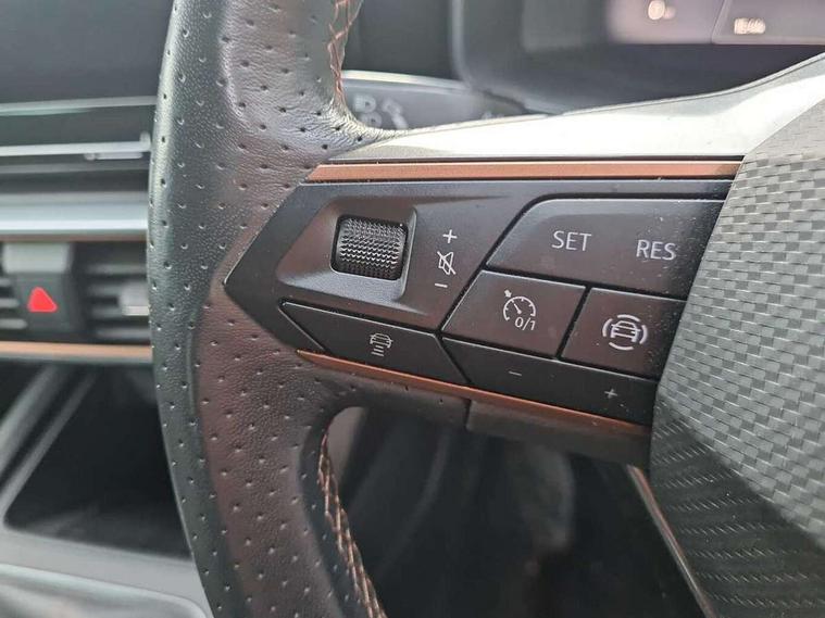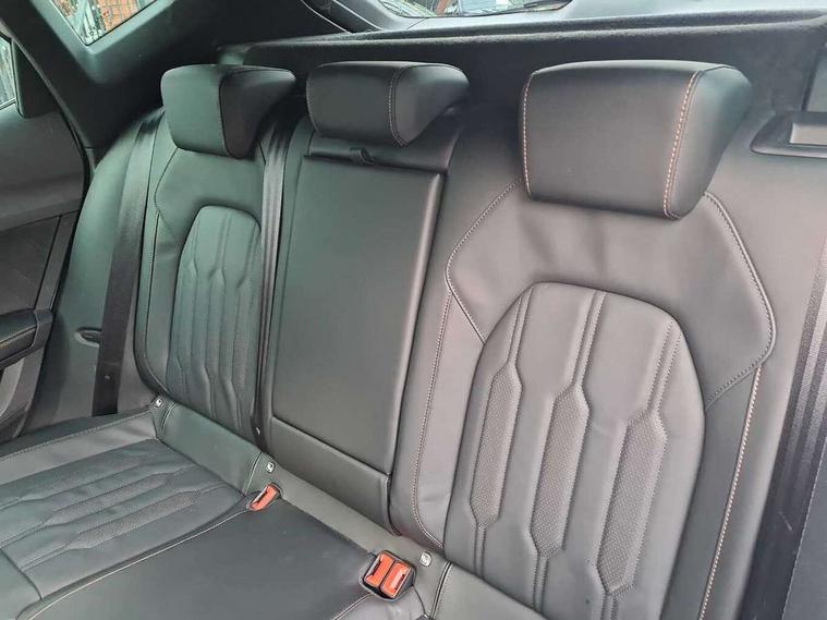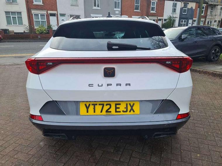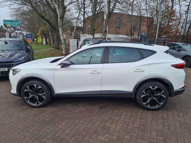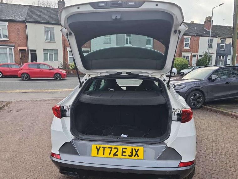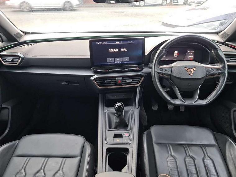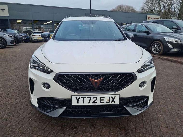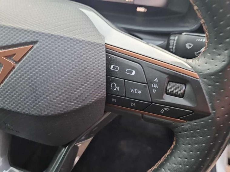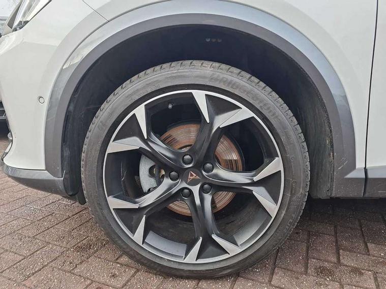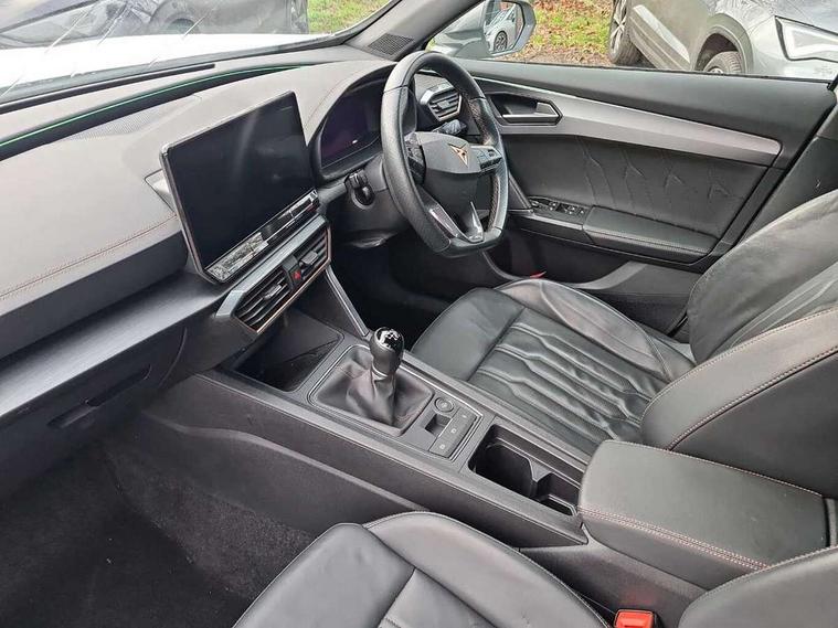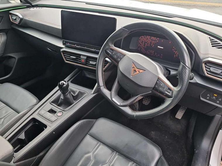 Digital cockpit and configurable dashboard, Driver alert system, Driving profile selection, E-call, Forward collision warning with automatic braking, Lane assist, Navigation system with 12'' Touchscreen Display, Park assist (inc front/rear parking sensors), PAS, Predictive adaptive cruise control with speed limiter, Rear view camera, RPM, trip computer, outside temp gauge, instrument light brightness, low fuel warning light, lights on reminder, gearshift indicator, Service interval indicator, Start/stop system with regenerative braking, Voice control system, Wireless apple carplay, Wireless phone charger, Electronic locking differential and dynamic traction support, Standard suspension, 2 front and 2 rear USB type C sockets, Auxiliary input socket, DAB radio, Auto dimming rear view mirror, Body colour door handles, Body coloured bumpers, Dark grey wing mirror, Daytime running light with automatic headlight control and coming home feature, Dynamic headlight range control, Electric front/rear windows, Electrically adjustable heated and folding door mirrors with memory function, Front fog lamps with cornering function, Gloss black roof rails and window surrounds, LED Headlights, LED Taillights with dynamic indicator, Rain sensing wipers, Rear diffuser with black simulated exhaust pipes, Rear side wing doors, Rear wash/wipe, Third brake light, Tinted rear windows, Welcome lights, 12v power supply in centre console, 12V socket, 12v socket in loadspace, 2 front and 2 rear reading lights, 230V socket, 3 seat bench in 2nd row, 60/40 split rear bench seat with armrest and mechanical seat release, Black headlining, Dust/pollen filter, Front and rear head restraints, Front centre armrest, Height/reach adjust steering wheel, Illuminated interior front door sills, Illuminated sunvisor with mirror, Isofix, Leather multi function steering wheel, Luggage tie-down hooks, Single front passenger seat, Three zone climate control with control panel in rear, Variable luggage/load compartment floor, Wraparound lighting, Genuine Nappa leather Pack - Cupra, Safety and driving pack (M) - Formentor, 3 point seatbelts on all rear seats, ABS, Brake control system - ESC and brake booster, Child proof door locks, Driver and front passenger airbags with front passenger airbag de-activation, Electronic parking brake, Front and rear disc brakes, Front side curtain airbags, Hill hold control, Seat belt reminder for front and rear seats, Tyre pressure monitoring system, Anti theft alarm system, Keyless entry and start system (KESSY), Locking wheel bolts, Copper and aluminium interior detailing, 19" 'Exclusive' machined sport matte black and silver alloy wheels,