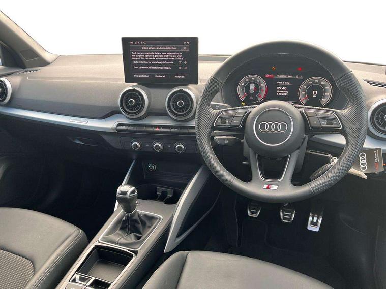 3D map display, Audi connect navigation and infotainment includes innovative services, Audi connect remote and control connects your vehicle to your smartphone, Audi drive select: power steering assistance + engine (modes: comfort, auto, dynamic, efficiency, individual), Audi smartphone interface - Apple carplay/Android Auto, USB connect, 2xSDXC card readers, voice control for navi, telephone, music and 3rd party apps, Audi virtual cockpit, Automatic start/stop system with recuperation, Bluetooth interface includes bluetooth audio streaming, Camera based traffic sign recognition, Cruise control, Distraction and Fatigue warning, E-call, Jukebox hard drive memory for music (10GB), Lane departure warning, MMI navigation plus with 8.8" touchscreen, Natural voice recognition, Power operated tailgate, Progressive steering, Rear parking sensors, Sport suspension, 6 passive loudspeakers, DAB Digital radio, USB type C port, Auto dimming rear view mirror, Black window trims, Body colour door mirrors, Electrically adjustable, folding, auto dimming and heated door mirrors with integrated LED side indicators, Front windscreen with grey tinted sunband, LED daytime running lights, LED headlights with dipped beam, high beam, position lights, indicators, LED rear lights, LED third brake light, Privacy glass - dark tinted rear and rear side windows from B-pillar backwards, Rear side wing doors, Rear wiper, S Line badges on the front wings, S Line body styling - front and rear bumpers, side skirts, radiator grille, rear diffuser insert and front air intakes, Variable front intermittent wipers, Wheel arch trims in manhattan grey, 12V socket in front, 3 seat bench in 2nd row, 3 spoke multi-function leather steering wheel with S badging, 4-way electric lumbar support for front seats including manual seat height adjustment for both front seats, 60/40 split folding rear seat bench, Black carpets, Black cloth headlining, Front and rear head restraints, Front centre armrest, Front sport seats, Front/rear floor mats, Height/reach adjust steering wheel, Illuminated door sill trims with S logo, ISOFIX child seat mounting in front passenger and rear outer seats, Manual air conditioning, Single front passenger seat, Stainless steel pedals, 3x3 point rear seatbelts, 6 airbags - Front, curtain and front side airbags, Electromechanical parking brake, Electronic stabilisation control including ABS, ASR and EDL, Front passenger airbag deactivation, Hill hold assist, Pre-sense front with pedestrian recognition, Seatbelt monitoring, Tyre pressure warning light with visual and acoustic warning, Warning triangle and first aid kit, Anti theft alarm, Anti theft wheel bolts, Electronically operated child locks, Remote central door locking, Aluminium interior element, Black dashboard, Gloss black centre console, Matt brushed aluminium trim inlays, Tool kit,