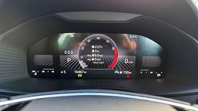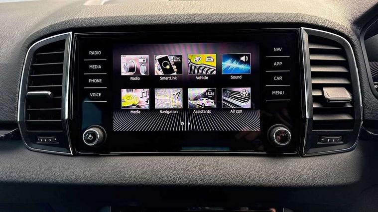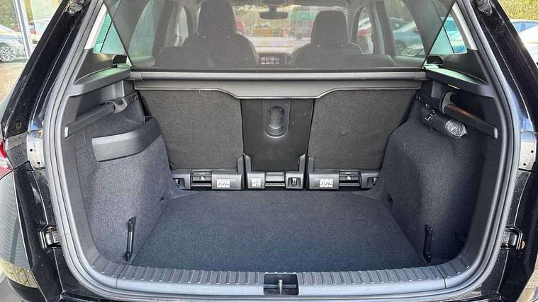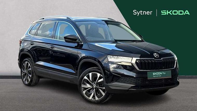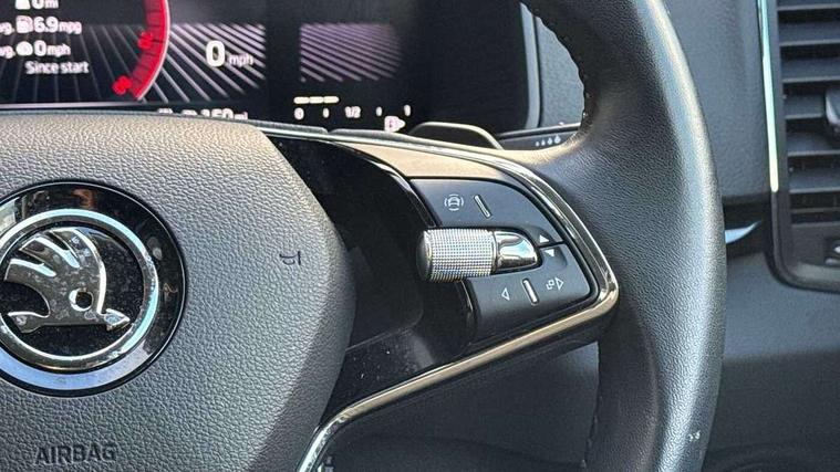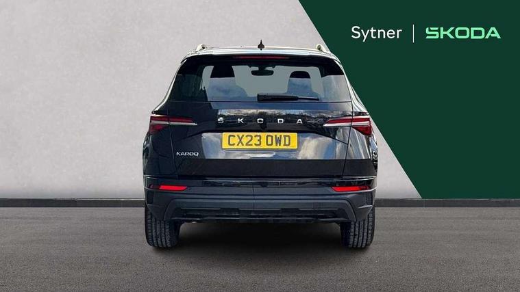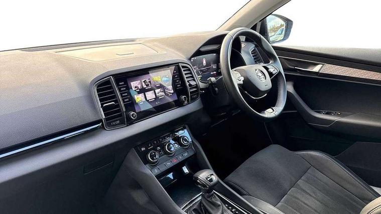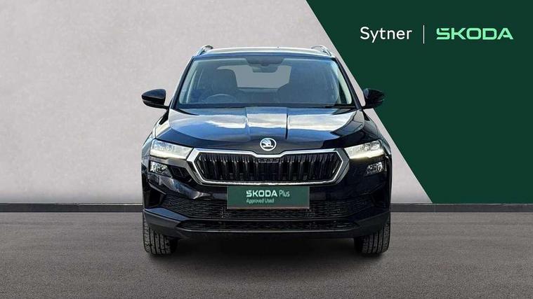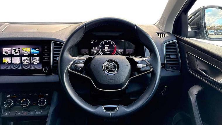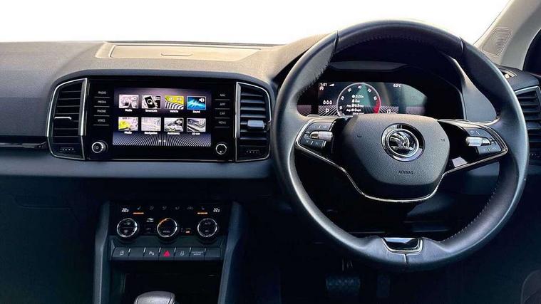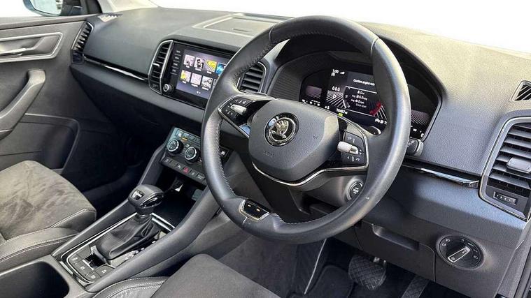 8" Digital display, Care connect, Driver fatigue sensor, Emergency services call system, Outside temperature gauge, Service interval indicator, SmartLink wireless for Apple and wired for Android, Start/stop system with regenerative braking, USB C Port x 2 in front centre console, 8 Speakers, DAB radio with Bluetooth, USB connection, Acoustic glass, Aero front windscreen wipers with intermittent function, Auto dimming rear view mirror with light and rain sensors, Black electric window control buttons, Body colour door mirrors and handles, Dynamic headlight range control with cornering light function, Electric front and rear windows with child proof lock, Heated rear windscreen, LED daytime running lights, LED rear lights with high functionality welcome effect and dynamic indicators, Light assistant (coming/leaving home/tunnel light), Plastic scuff plates, Privacy glass, Rear side wing doors, Rear spoiler, Rear window wiper with washer system and intermittent control, Safety reflectors on front doors, 1.5 litre bottle holders in driver and front passenger door panels, 12V socket in boot, 12v socket in front centre armrest with storage compartment and rear air vents, 2 Folding hooks and nets in boot, 2 spoke leather heated multifunction steering wheel with DSG paddles, 2 x Tablet holder, 3 rear height adjustable headrests, 3 seat bench in 2nd row, 4 foldable roof handles with rear coat hooks, Black floor carpet, Chrome inner door handles, Decorative door sills with KAROQ badging, Double sided boot floor, Foldable hooks in the boot, Front head restraints, Height adjustable front three point seats belts with tensioners, Height/reach adjust steering wheel, Ice scraper, Illuminated glovebox, Illuminated luggage compartment, Isofix child seat preparation for front passenger seat, Isofix child seat preparation outer rear, Manual lumbar support for front seats, Pen holder, Pollen filter, Rear boot cover, Rear reading lights, Rubbish bin door, Safety vest holder, Single front passenger seat, Storage box in upper central dashboard closed, Sunvisors with illuminated vanity mirrors, Textile floor mats, Ticket holder, VarioFlex seats with standard rear seat release, Chrome roof rails + chrome pack - Karoq, Parking pack - Karoq, Automatic door unlocking in case of crash, Automatic fuel cut off in case of crash, Child locks on rear doors, Driver airbag, Electronic parking brake with auto hold function, Emergency rear braking signal, ESC including ABS, MSR, ASR, EDS, HBA, DSR, RBS, MKB and traction control, Front side airbags, Hill hold control, Knee airbags, Passenger airbag with switch-off function, Pedestrian monitor, Seatbelt reminder signalisation and pretensioner for all seats, Three point seatbelts rear, Two tone horn, Tyre pressure display, Tyre pressure monitor, Alarm with interior monitoring, back up horn and tilt sensor with safe function, Electronic engine immobiliser, Keyless entry and start/stop, Remote central locking with 2 remote folding keys, Chrome framed air vents, 18" Procyon silver alloy wheels with anthracite aero inserts, Anti-theft wheel bolts protection, Storage on wheel cover, Tool kit,