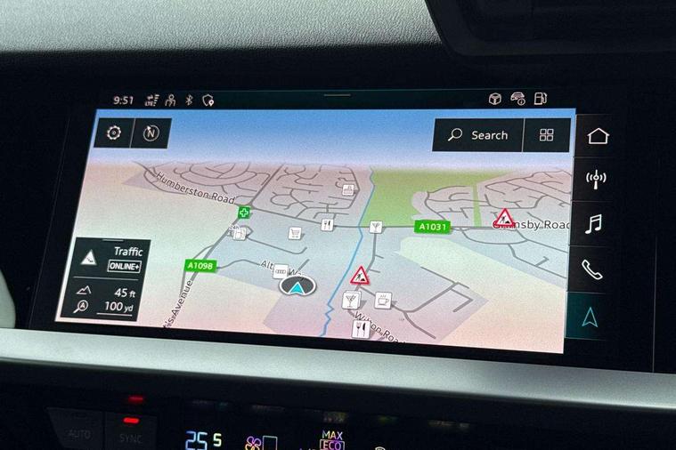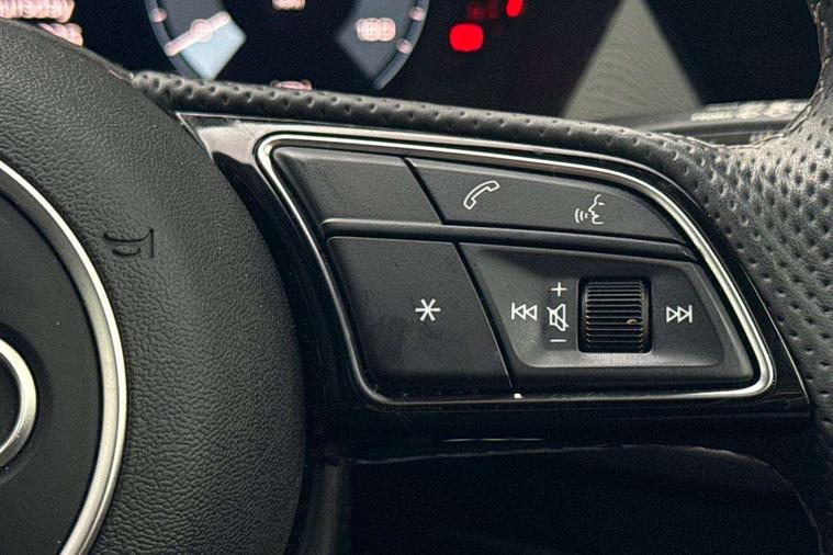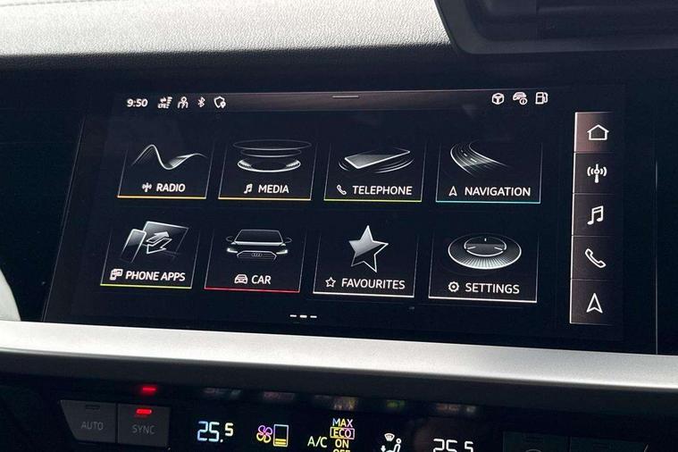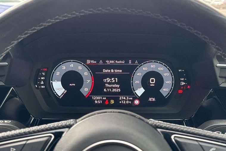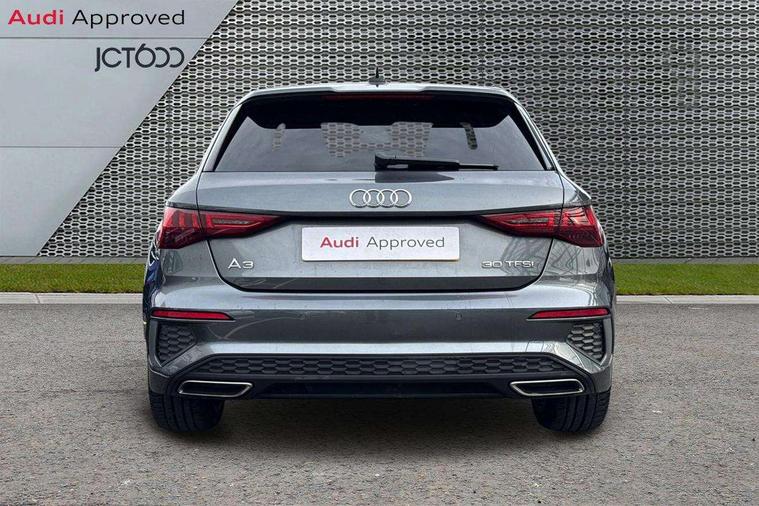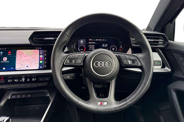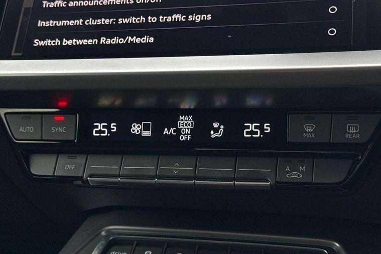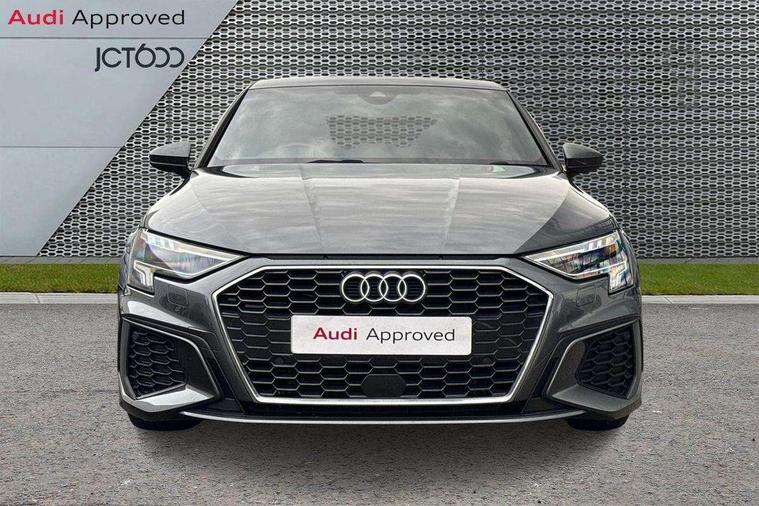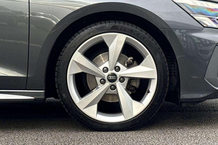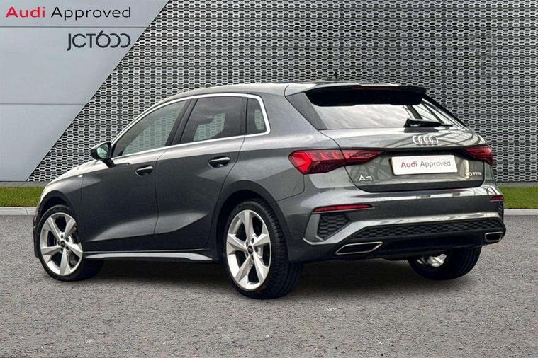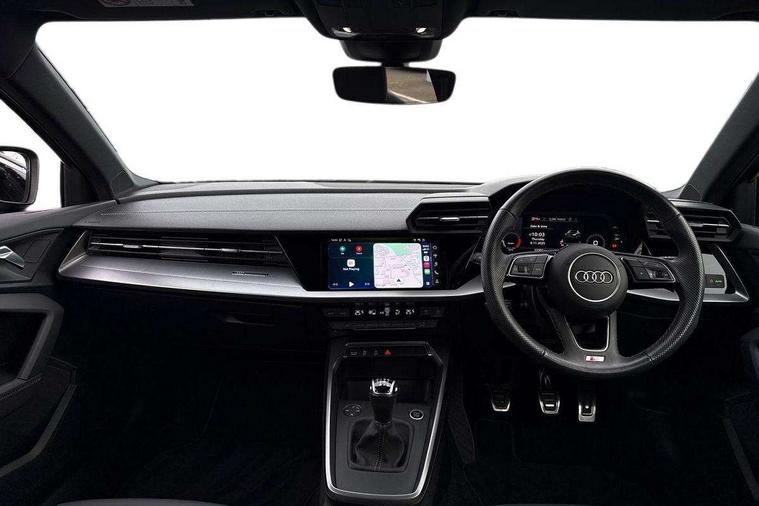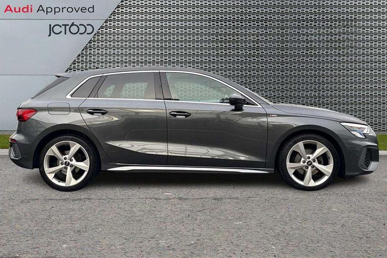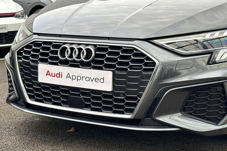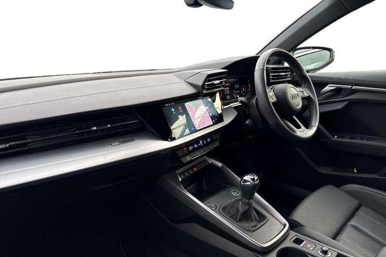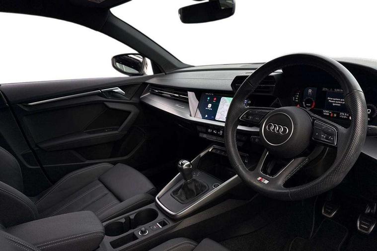 Audi drive select (Auto, Comfort, Dynamic and Individual), Audi smartphone interface, Audi Virtual Cockpit - 10.25" digital and colour instrument cluster, Automatic start/stop system with recuperation, Bluetooth interface, Camera based traffic sign recognition, Collision avoidance assistant, Cruise control, e-Call (emergency call), Electromechanical power speed sensitive steering, Lane departure warning system, MMI Navigation Plus with high resolution 10.1" colour touch screen display, Rear parking sensors, Service indicator, Trip computer, Voice control system with natural language interaction, Sports suspension, 2xUSB-C connection with data and charging functions, 6 passive loudspeakers, DAB Digital radio, 3rd brake light, Acoustic glass windscreen, Aluminium window trim, Auto dimming frameless rear view mirror, Body colour exterior mirrors, Electrically adjustable/heated/folding/auto dimming door mirrors with integrated LED indications + kerb view function for passenger side, Front electric windows, Illuminated door sills with aluminium inserts at the front with S logo, LED daytime running lights, LED headlights with LED rear lights and dynamic rear indicators, Light and rain sensors, Privacy glass - dark tinted rear window, rear door and side windows, Rear electric windows, Rear side air outlets in grained matt black, Rear side wing doors, Rear wiper, S line bumpers, S roof spoiler, 12V socket and storage compartment in front centre console, 3 seat bench in 2nd row, 3 spoke leather multifunction steering wheel, 4 way electrically adjustable lumbar support for driver and front passenger, 60/40 split folding rear seat bench, Black cloth headlining, Dual zone electronic climate control, Front and rear centre armrest in artificial leather, Front and rear headrests, Front/rear floor mats, Height and reach adjustable steering wheel, Interior lighting - glove compartment light and right hand side, Luggage compartment floor covering, Manual boot compartment lid, Manually adjustable front seats, Seat side bolsters, Single front passenger seat, Stainless steel pedals and front footrest in black, Twin leather upholstery with front sports seats S embossed logo, Aluminium interior elements pack - A3 Sportback, LED interior lighting pack - A3 Sportback, S line styling pack - A3 Sportback, 3x3 point rear seat belts, Driver and front passenger airbag with passenger airbag deactivation, Electronic Stabilisation Control (ESC) including ABS, ASR and EDL, First aid kit with warning triangle and 2 safety vests, Front side airbags with head airbags and interaction airbag, Pre-sense front with pedestrian and cyclist detection, Seatbelt monitoring, Tyre pressure loss indicator, Anti theft alarm, Anti-theft wheel bolts, Electronically operated child locks, Immobiliser, Remote control central locking, Dark spectrum aluminium inlays, accent surfaces in the dashboard and centre console in platinum grey silk effect paint finish,