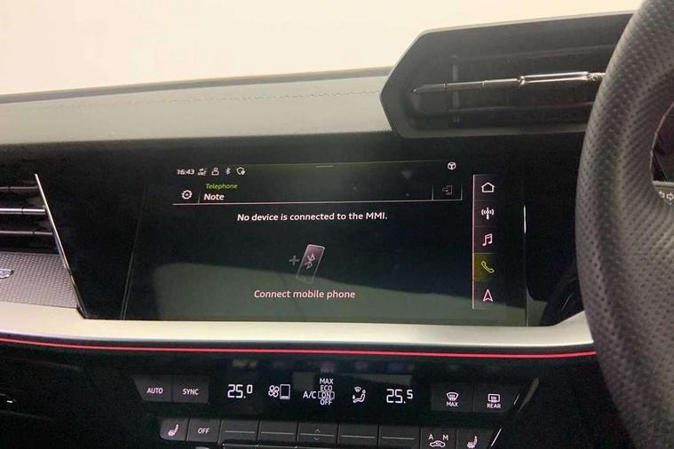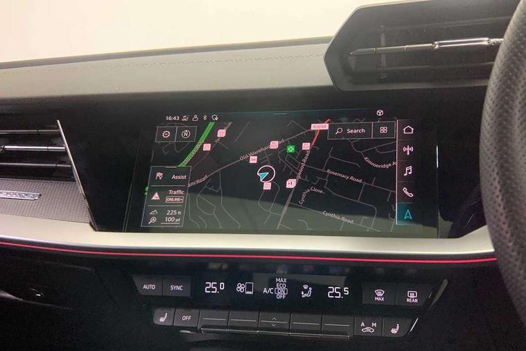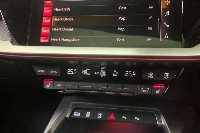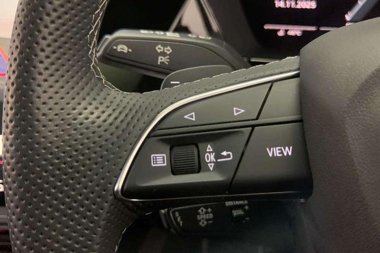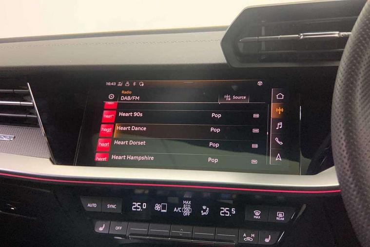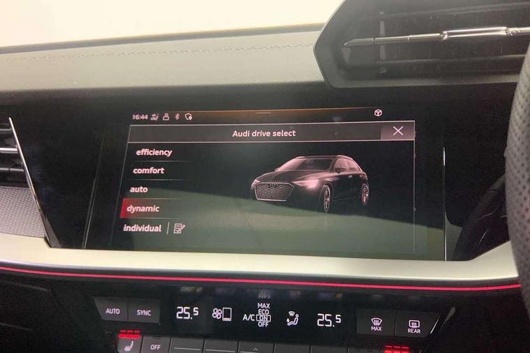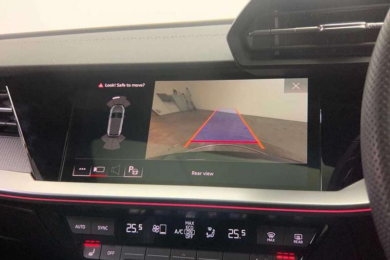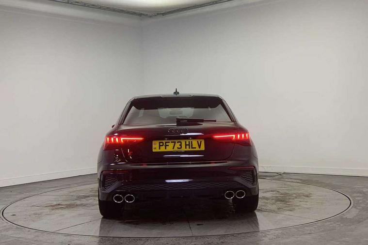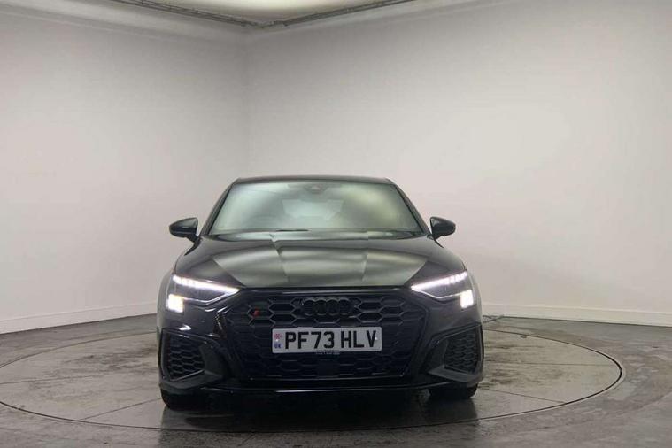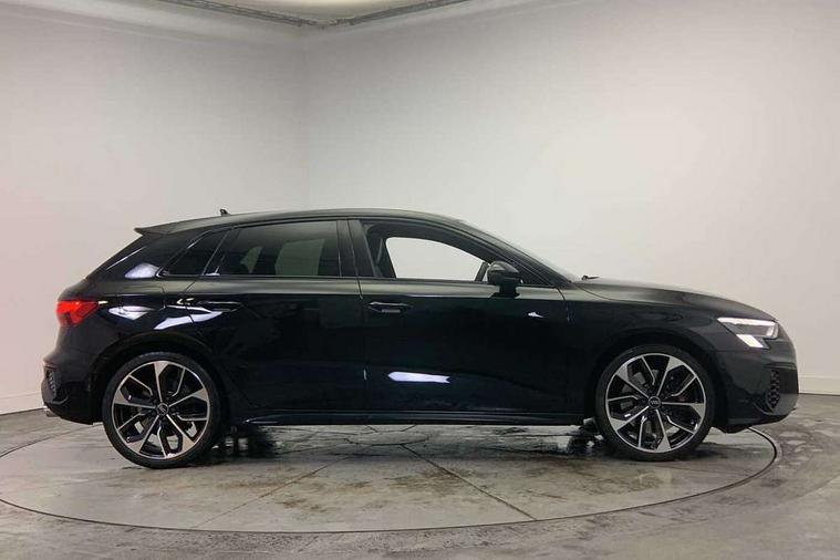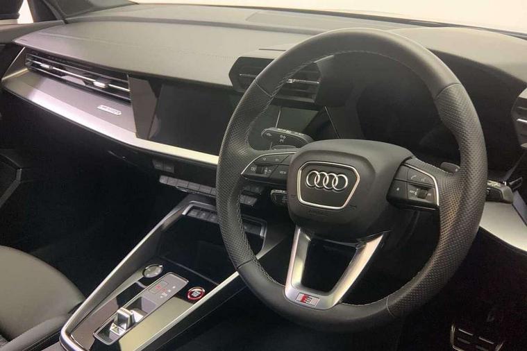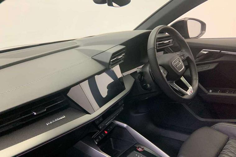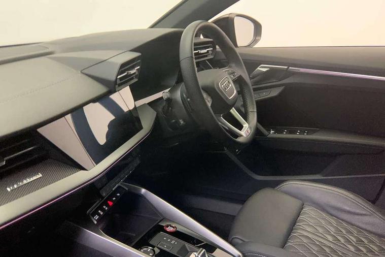 Adaptive cruise assist, Audi drive select (Auto, Comfort, Dynamic, Efficiency and Individual), Audi smartphone interface, Audi virtual cockpit plus - 12.3" full HD resolution dynamic digital instrument cluster, Automatic start/stop system with recuperation, Bluetooth interface, Collision avoidance assistant, e-Call (emergency call), Head up Display, Lane change assistant with exit warning system and rear cross traffic alert, Lane departure warning system, MMI Navigation Plus with high resolution 10.1" colour touch screen display, Power operated tailgate - Luggage compartment lid opens/closes electrically, Progressive steering, Service indicator, Trip computer, Voice control system with natural language interaction, Quattro permanent all wheel drive, S suspension with damper control, 2xUSB-C connection with data and charging functions, DAB Digital radio, 3rd brake light, Acoustic glass windscreen, Audi Beam uses LEDs to project Vorsprung onto the ground as you exit your S3, Auto dimming frameless rear view mirror, Carbon door mirror housings, Dual branch oval twin tailpipes in chrome plated finish, Electrically adj heated/folding + automatically dimming exterior mirrors with memory + automatic kerb side function for passenger side exterior mirror, Front electric windows, Headlight washers, Heat insulating glass windscreen, Illuminated door sills with aluminium inserts at the front with S logo, Integrated LED indicators in door mirrors, LED daytime running lights, Light and rain sensors, Privacy glass - dark tinted rear window, rear door and side windows, Rear electric windows, Rear side air outlets in grained matt black, Rear side wing doors, Rear wiper, 12V socket and storage compartment in front centre console, 3 seat bench in 2nd row, 3 spoke leather multifunction steering wheel with gear shift paddles, 4 way electrically adjustable lumbar support for driver and front passenger, 60/40 split folding rear seat bench, Black cloth headlining, Dual zone electronic climate control, Fine Nappa leather upholstery with front sports seats S embossed logo, Front and rear centre armrest in artificial leather, Front and rear headrests, Front/rear floor mats, Height and reach adjustable steering wheel, Interior lighting - glove compartment light and right hand side, Luggage compartment floor covering, Seat side bolsters, Single front passenger seat, Stainless steel pedals and front footrest in black, Aluminium interior elements pack - A3 Sportback, Black styling pack - A3 Sportback/S3, Body styling design pack - S3, Extended ambient lighting pack - A3 Sportback, Storage pack - A3 Sportback, Technology pack pro with 360 camera - A3 Sportback/Voursprung, 3x3 point rear seat belts, Driver and front passenger airbag with passenger airbag deactivation, Electronic Stabilisation Control (ESC) including ABS, ASR and EDL, First aid kit with warning triangle and 2 safety vests, Front side airbags with head airbags and interaction airbag, Pre-sense front with pedestrian and cyclist detection, Seatbelt monitoring, Tyre pressure loss indicator, Anti theft alarm, Anti-theft wheel bolts, Electronically operated child locks, Immobiliser, Remote control central locking, Carbon inlays, accent surfaces in the dashboard and centre console in platinum grey silk effect paint finish,