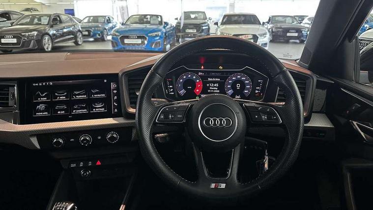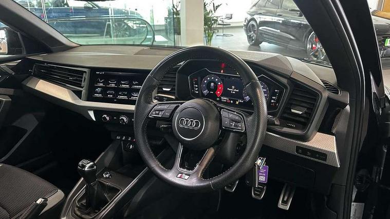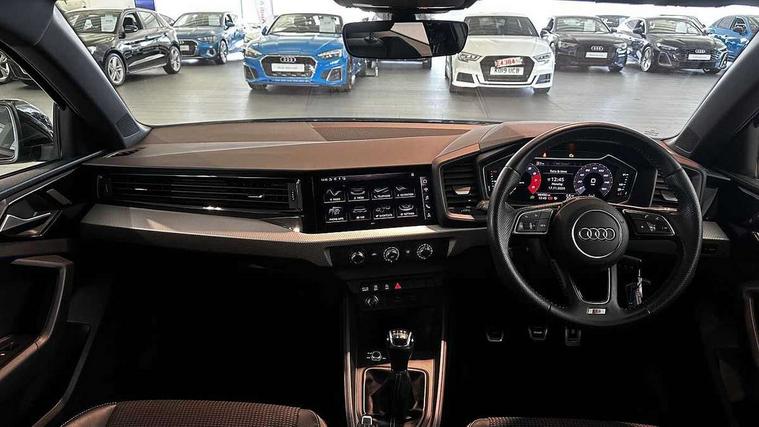 10.25" Digital instrument cluster display classis style instrument dials + speed, odometer, time, outside temperature, telephone menu + fuel level warning, Audi connect safety emergency and service including E-call, Audi drive select - power steering assistance + engine, Audi smartphone interface with connect compatible smartphone via USB directly MMI display + Nav, music, third party apps controlled via MMI controller, Automatic start/stop system, Bluetooth interface, Cruise control, Driver's information system, Electromechanical power steering, Lane departure warning system, Rear parking sensor, Service interval indicator, Speed limiter, Voice control system, Washer fluid level indicator, Sports suspension, 1 x SDXC card reader, 1 x USB type C and 1 USB type A charging points, DAB Digital radio, MMI radio plus with 8.8" colour MMI display screen and MMI touch, Auto dimming rear view mirror, Body coloured door mirrors, Door sills with aluminium inlays and S Line logo, Electric front and rear windows, Electrically adjustable, heated, folding door mirrors with integrated LED side indicator, Front side air inlets in grained matt black and C frame in titanium black, Heat insulating glass windscreen and side windows, Heated rear windscreen, LED headlights with LED rear lights + dynamic rear indicators + headlight adjustment and high beam, turning light + LED daytime running lights, Radiator grille and rear diffuser in matt titanium black, Radiator protective grille frame in matt aluminium silver, Rain and light sensors, Rear fog lights, Rear wiper, S line badges on front wings, Side front spoiler lips in grained matt black, 12V socket in centre console with two cup holders, 3 rear seats with headrests, 40:60 Split folding rear seat or folded fully, Black cloth headlining, Driver and passenger seat with manual height adjust with forward and backwards adjustment, Front and rear black floor mats with contrast stitching in fine silver, Front head restraints, Height and reach adjustable steering wheel, ISOFIX child seat mounting for front passenger and outer rear seats including top tether attachment point of outer rear seats, Leather gear knob with aluminium trim, Luggage compartment light with front and rear reading lights, Manually adjustable lumbar support in front seats, Stainless steel pedals, LED interior lighting pack - A1, Luggage compartment pack - A1, S line exterior styling pack - A1 Sportback, 3x3 point rear seatbelts, Audi pre-sense front with pedestrain and cyclist recognition, Brake assist function, Driver and front passenger airbag with front side and head airbags, Electronic Stability Control including ABS, EBD, ASR and EDL, Front and rear seatbelt reminder, Front passenger airbag deactivation switch, Hill hold assist, Seatbelt height adjustment for front seats, Seatbelt monitoring, Tyre pressure warning light, Warning triangle and first aid kit, Anti theft alarm, Anti theft wheel bolts and loose wheel warning, Immobiliser, Remote central locking with 2 foldaway keys, Aluminium trim for control switches, air vents and digital instrument cluster, Silver grey inlays polygon structure in diamond paint finish, Structured grey accent areas including air vents, door handle recesses and centre console in quartz paint finish,