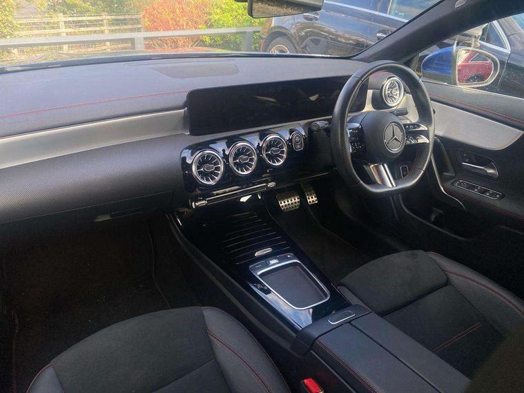 10.25 inch Instrument display with digital cockpit, 10.25 inch touchscreen central media display, Active lane keeping assist, Attention assist - Monitors steering behaviour and long journey fatigue, Bluetooth connection, Car wash mode, Cruise control with limiter, Direct steer system, DYNAMIC SELECT with a choice of driving modes (ECO, Comfort, Sport and Individual), ECO start/stop function, Fluid level warning indicator for fuel, oil, coolant and washer fluid, Hard-disk navigation, Hey Mercedes Voice activation, Lamp failure indicator, Mercedes me connect including emergency call system, accident recovery, breakdown and maintenance management, Mercedes me remote services, Outside temperature gauge, Owners manual in English, Pre-installation of private car share, Radio aerial integrated into front and rear windshields, Service indicator (ASSYST), Smartphone integration with Apple CarPlay and Android auto, Speed limit assist, Trip computer in multifunction display with current consumption indicator, Wireless charging in the front centre console, Comfort suspension with ride height lowering, Rear axle multi-link, DAB digital radio tuner, MBUX multimedia system, Mercedes Benz sound system (100 W) with 6 speakers, Pre installation for Mercedes Benz Link, Adaptive brake lights, AMG body styling with AMG front apron and rear apron and visible exhaust tailpipe in chrome trim elements, Body colour door handles, Electric windows, Electrically adjustable and heated door mirrors with integrated LED indicators, Exhaust system with 2 Visible tailpipe trim elements and rear apron with trim in chrome, Headlamp assist automatic headlamp activation, Heated glass rear windscreen + timer control, High gloss aluminium beltline strips, High level LED third brake light, Interior mirror with black reading lamps and frameless, LED high performance headlamps with integrated LED daytime running lights and adaptive highbeam assist, LED tail lamp, Privacy glass with dark tinting on rear side windows and rear window, Radiator grille with Mercedes-Benz pattern in chrome with central Mercedes star and single louvre with chrome inserts, Rain sensing windscreen wipers with two sensitivity settings, Rear boot, Rear fog lamp, Rear side wing doors, Variable front intermittent wipers, Window line trim strip in high gloss aluminium, 3 seat bench in 2nd row, 3 twin spoke flattened multifunction steering wheel in nappa leather - horizontal twin spoke in high gloss black, vertical twin spoke in silver chrome, 4 way lumbar support, 40:20:40 split folding rear seat backrests, Air conditioning - One zone THERMATIC automatic climate control with automatically controlled air distribution, Air vents with surround in silver chrome, Artico man-made leather/Microcut microfibre upholstery, Automatic child seat recognition sensor, Black roof lining, Brushed stainless steel sports pedals with rubber studs, Floor mats with stitched AMG lettering, Front centre armrest with stowage, Galvanished gear shift paddles in silver chrome, Heated front seats, Interior lighting - 64 colour Ambient lighting, Luggage net on driver/front passenger seat backrest, Manually height and reach adjustable steering column, Rear head restraints, Single front passenger seat, Sport seats with fixed head restraints, Stowage compartment in centre console with retractable cover, Sunvisors with illuminated vanity mirrors, Twin front cupholders, Two outer rear seat isofix and top tether child seat fixing points, Keyless go comfort pack - CLA, Light and sight pack - CLA, Mirror pack - CLA, Parking pack with reversing camera - CLA, Seat comfort pack - CLA, USB package plus - CLA, Active bonnet pedestrain safety measure which detects an impact and raises bonnet by 65mm, Active brake assist includes forward collision warning system with autonomous braking, Adaptive brake assist with hold function and hill start assist, Anti lock braking system (ABS) with brake assist, Black seat belts, Bonnet with power domes, Brake calipers with Mercedes-Benz lettering, Brake pad wear warning indicator, Childproof locks manually operated for rear doors and electrically operated for rear power windows, Crash responsive emergency lighting, Driver and front passenger head and sidebags, Driver and front passenger windowbags, Drivers knee airbag, Dual stage driver and front passenger airbags, Electric parking brake, Electronic stability programme with acceleration skid control, ESP curve dynamic assist, Front and rear seatbelt reminder, Front passenger seat occupancy sensor, Perforated front brake discs, Three point rear seat belts, Tyre pressure monitoring system, Warning triangle and first aid kit, Alarm system with immobiliser and interior protection -Thatcham category 1, Guard 360 deg vehicle protection - tow away protection with visual, acoustic warning, interior monitoring, preinstallation for parking damage, Remote central locking and crash sensor with emergency opening function, Light aluminium with longitudinal grain interior trim, 18" AMG 5 twin spoke light alloy wheels painted in termolite grey with high sheen finish, Summer tyres, Tirefit tyre sealant kit,