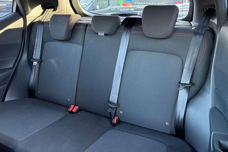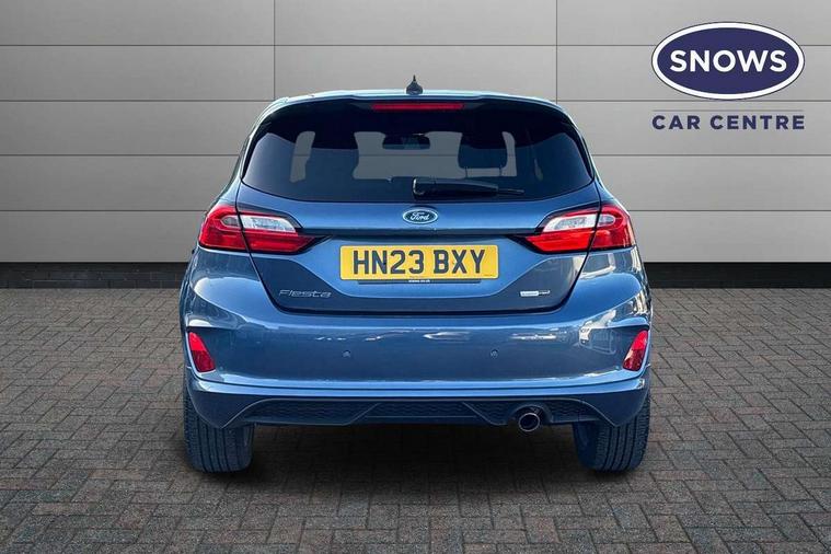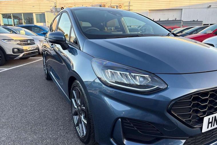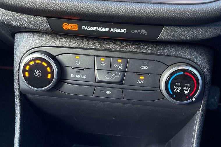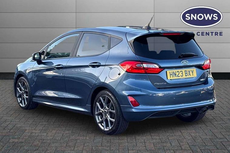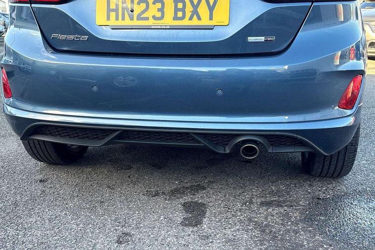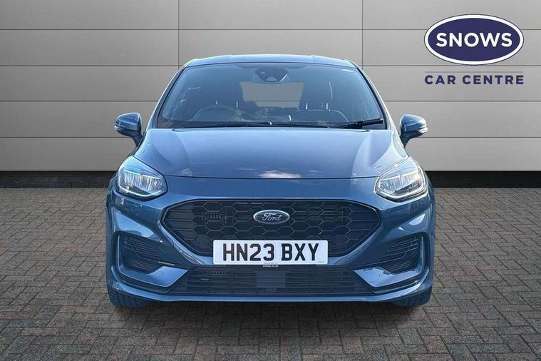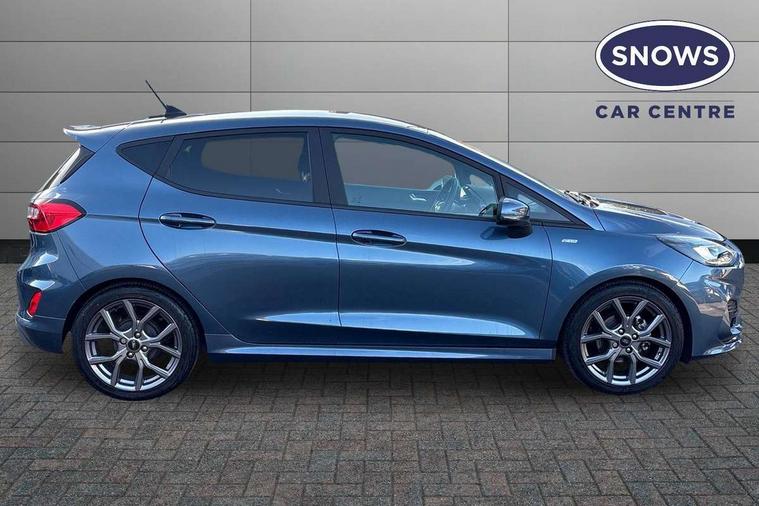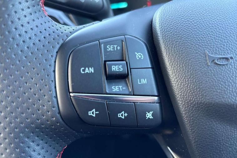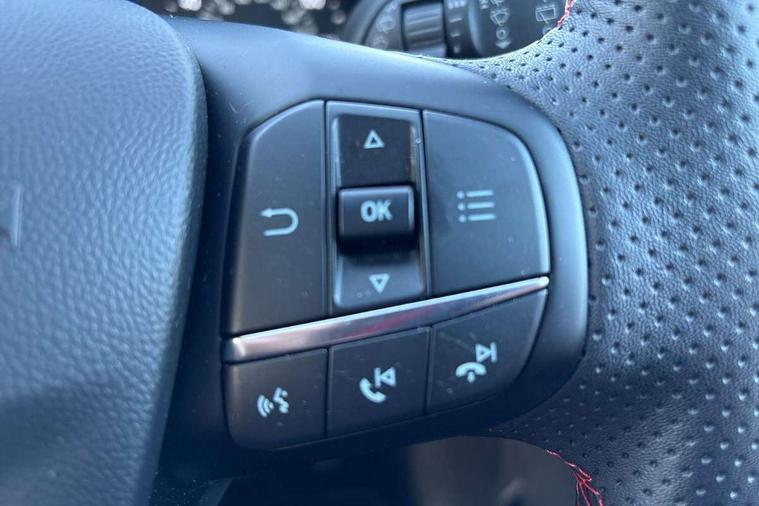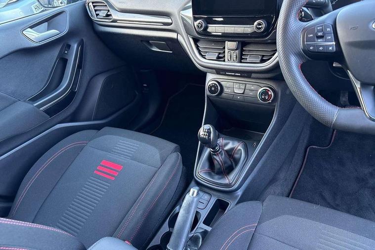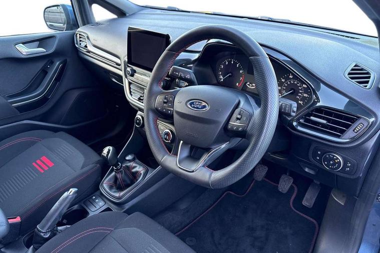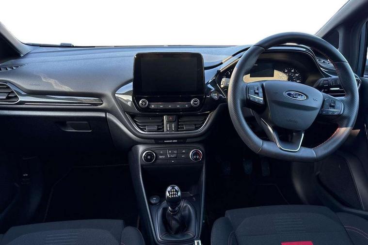 Bluetooth system, Electric power steering, Ford easy fuel, Ford SYNC 3 Navigation system incl 8" touchscreen, 7 speakers, FordPass connect, Apple carplay, android auto, voice control and emergency assistance, Rear parking distance sensors, Selectable drive modes (Normal, Sport, Track), Trip computer, Sports suspension, 2 USB ports, Auxiliary input socket, DAB Digital radio, Steering wheel mounted controls, Body colour bumpers, Body colour door handles, Body colour large rear spoiler, Body coloured electrically operated and heated door mirrors with side indicators, Cornering front fog lights, Electric front windows/one touch facility, Electric rear windows, LED Night signature to rear lights, Quickclear heated windscreen, Rain sensing wipers and auto dimming rear view mirror, Rear privacy glass, Rear wiper, Unique ST-Line upper grille & full bodystyling kit with ST-Line wing badges, 3 spoke flat bottomed leather steering wheel, 60/40 split folding rear seat, Adjustable head restraints, Black headlining, Boot carpet, Centre console with opening armrest, 2x cupholders, 12v and USB, Chrome inner door handles, Cloth upholstery, Footwell illumination, Front floor mats in velour, Front map reading lights, Front seat and rear pockets, Illuminated glovebox, Leather gaiter, Load area light, Manual 2 way passenger seat adjust, Manual 4-way driver seat adjust, Manual air conditioning, Overhead console with sunglasses holder, Pollen filter, Rake/reach adjustable steering wheel, Sensico wrapped steering wheel, Sports front seats, NCAP Pack - Fiesta, 3 point seatbelts on all rear seats, ABS+EBA, Curtain airbags, Driver and passenger airbags, Drivers knee airbag, Electronic stability control with hill start assist, Front passenger airbag deactivation, Front side airbags, Seatbelt warning, Two tone horn, Tyre pressure monitoring system, Keyless start with 'Ford Power' starter button, MyKey system, Remote central locking & engine immobiliser, Thatcham Cat.1 alarm, 17" 5 spoke alloy wheels with rock metallic finish,