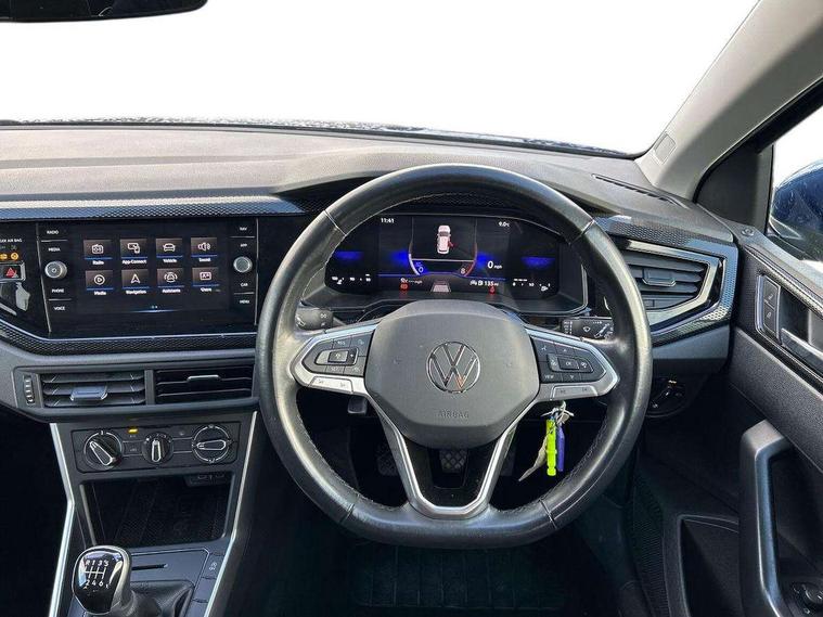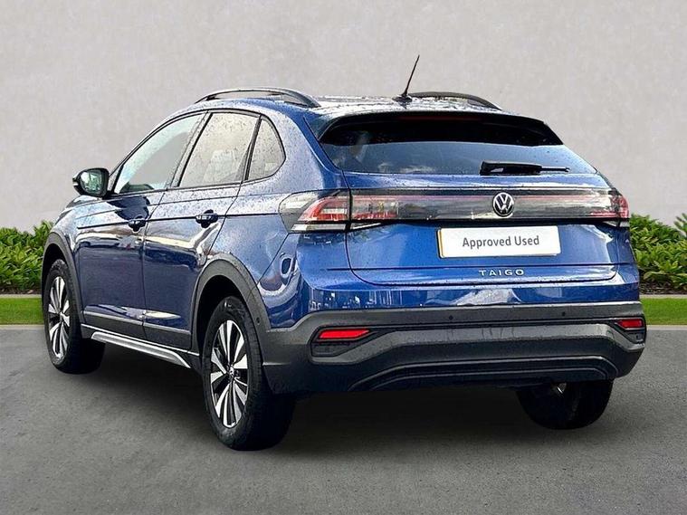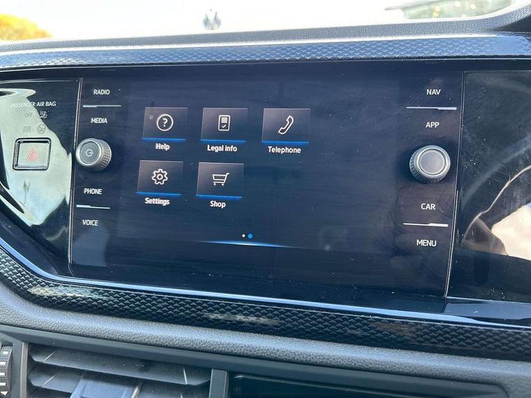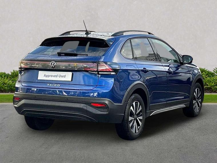Driver alert system, e-Call (emergency call), Power Steering, Travel assist including emergency assist, Washer fluid level indicator, Wireless Charging including Bluetooth, Start-stop system with battery regeneration (recuperation - energy recovery during braking), WeConnect plus, Ambient lighting with logo projection, Aspherical driver's exterior mirror, Auto headlights, Body coloured bumpers, Body coloured exterior mirror housings and door handles, Electric windows, External USB type C socket and charging sockets, Front fog lamps with cornering function, Headlight range control, Heat insulating glass windscreen, LED headlamps, LED rear combination lamp, LED third brake light, Left convex exterior mirror, Power folding adjustable/heated exterior mirrors and front passenger exterior mirror lowering function, Rear fog light on one side, reversing light on both sides, Rear side wing doors, Rear wash/wipe with intermittent wipe setting, 'Slash/ Austin' Cloth upholstery, 12V socket in centre console, 2 front reading lights, 3 rear head restraints, 3 seat bench in 2nd row, Black carpets, Child seat anchor for child seat system i-Size, 2x top tether and child seat anchor in front on front passenger side, Door and side trim panels in titan black, Driver and front passenger seat height adjustment, Front centre armrest, Handbrake lever handle in leather, Height and reach adjustable steering wheel, Leather trimmed gear knob, Leather wrapped multifunction steering wheel, Luggage compartment floor, Luggage compartment light, Lumbar support for driver's and front passengers seat, Seat covers in titanium black, Single front passenger seat, Split folding backrest with centre armrest and unsplit rear seat bench, Storage compartment under front seats, Sun visors with illuminated vanity mirrors, Chrome Package - Taigo, Drivers assistance pack - Taigo, Light and Sight pack including High beam assist - Taigo, 2 x 3-point seatbelts/outer rear seats with ECE label, 3-point seat belts in front with pretensioner and height adjustment, 3-point seatbelt for centre rear seat, Driver and front passenger airbags with front passenger airbag de-activation, front side and curtain airbags, Driver and front passenger safety-optimised head restraints, Electronic stability control, Extended and predictive pedestrian/ cyclist protection, Front and rear disc brakes, Front curtain and side airbags with center airbag, Hill start assist, Manual rear child locks, Single tone horn, Tyre pressure loss indicator, Anti-theft alarm system with interior monitoring, backup horn, and towing protection, Anti-theft wheel bolts, Lava stone black gloss/matt decorative inserts in dash and front door panels, Low rolling resistance tyres,