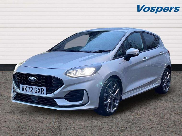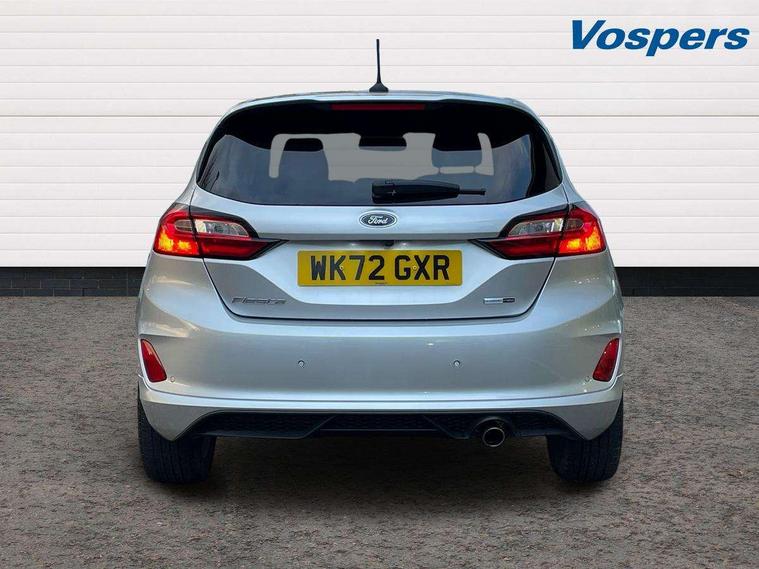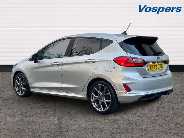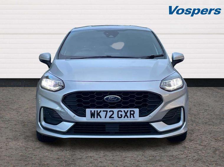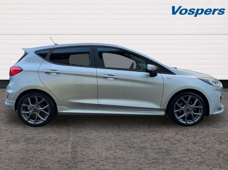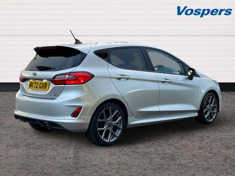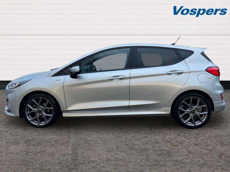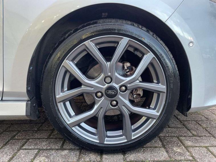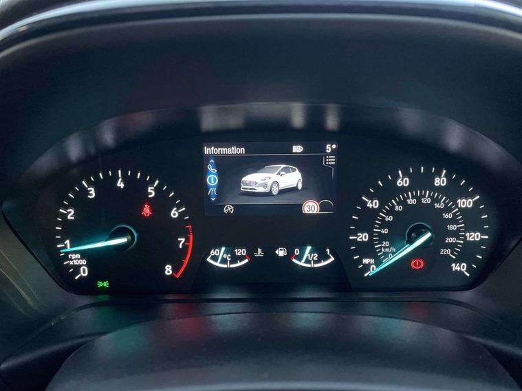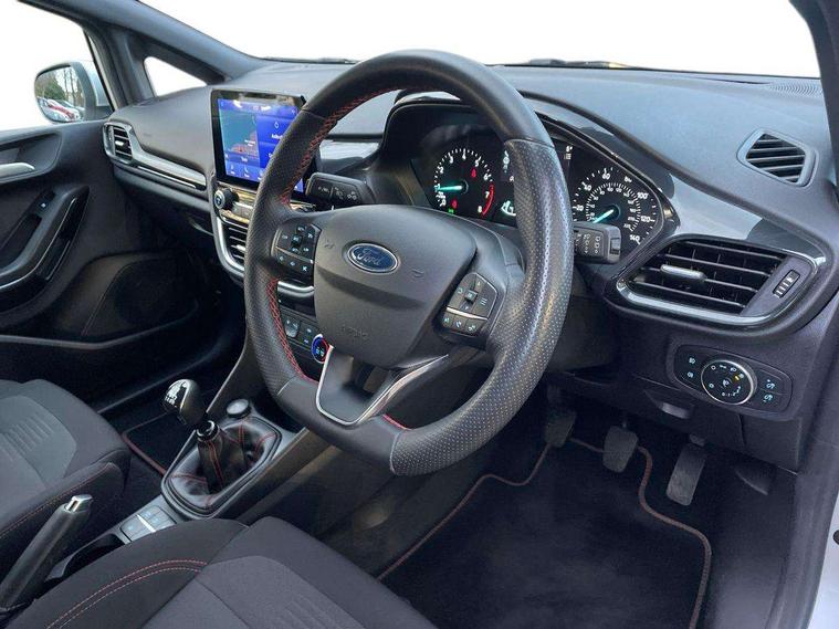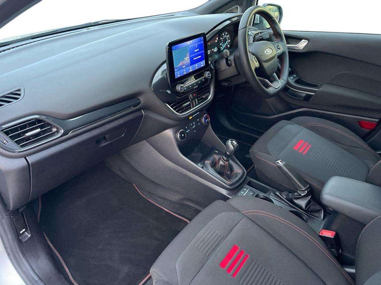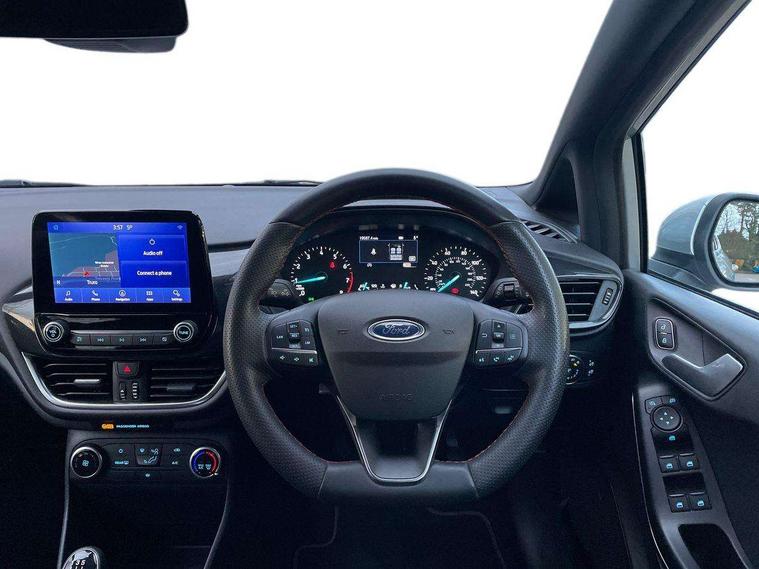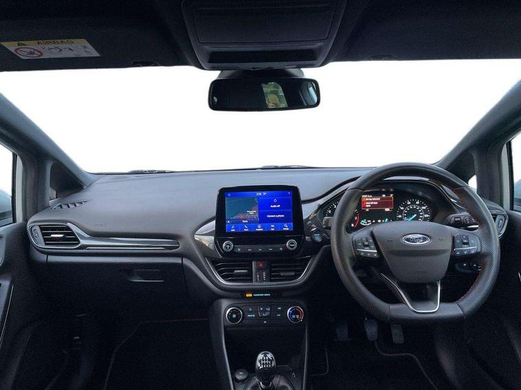 Bluetooth system, Electric power steering, Ford easy fuel, Ford SYNC 3 Navigation system incl 8" touchscreen, 7 speakers, FordPass connect, Apple carplay, android auto, voice control and emergency assistance, Rear parking distance sensors, Selectable drive modes (Normal, Sport, Track), Trip computer, Sports suspension, 2 USB ports, Auxiliary input socket, DAB Digital radio, Steering wheel mounted controls, Body colour bumpers, Body colour door handles, Body colour large rear spoiler, Body coloured electrically operated and heated door mirrors with side indicators, Cornering front fog lights, Electric front windows/one touch facility, Electric rear windows, LED Night signature to rear lights, Quickclear heated windscreen, Rain sensing wipers and auto dimming rear view mirror, Rear privacy glass, Rear wiper, Unique ST-Line upper grille & full bodystyling kit with ST-Line wing badges, 3 spoke flat bottomed leather steering wheel, 60/40 split folding rear seat, Adjustable head restraints, Black headlining, Boot carpet, Centre console with opening armrest, 2x cupholders, 12v and USB, Chrome inner door handles, Cloth upholstery, Footwell illumination, Front floor mats in velour, Front map reading lights, Front seat and rear pockets, Illuminated glovebox, Leather gaiter, Load area light, Manual 2 way passenger seat adjust, Manual 4-way driver seat adjust, Manual air conditioning, Overhead console with sunglasses holder, Pollen filter, Rake/reach adjustable steering wheel, Sensico wrapped steering wheel, Sports front seats, NCAP Pack - Fiesta, 3 point seatbelts on all rear seats, ABS+EBA, Curtain airbags, Driver and passenger airbags, Drivers knee airbag, Electronic stability control with hill start assist, Front passenger airbag deactivation, Front side airbags, Seatbelt warning, Two tone horn, Tyre pressure monitoring system, Keyless start with 'Ford Power' starter button, MyKey system, Remote central locking & engine immobiliser, Thatcham Cat.1 alarm, 17" 5 spoke alloy wheels with rock metallic finish,
